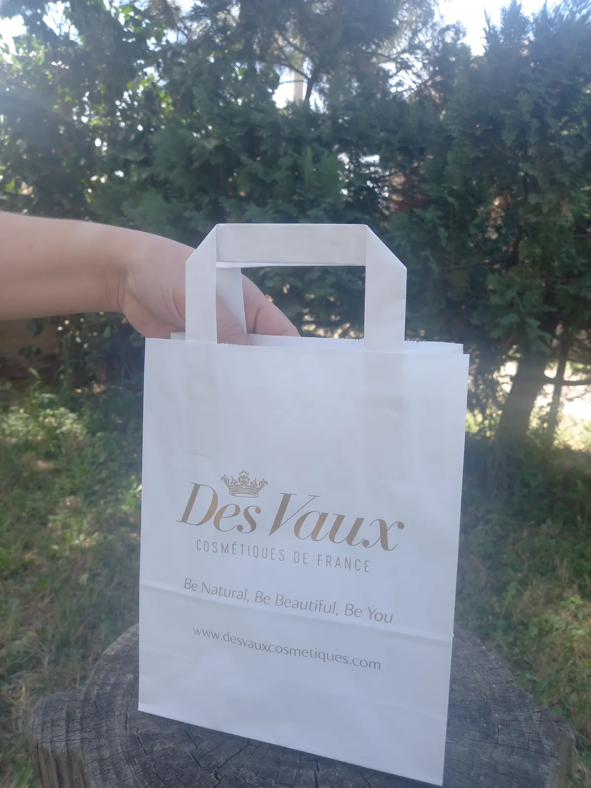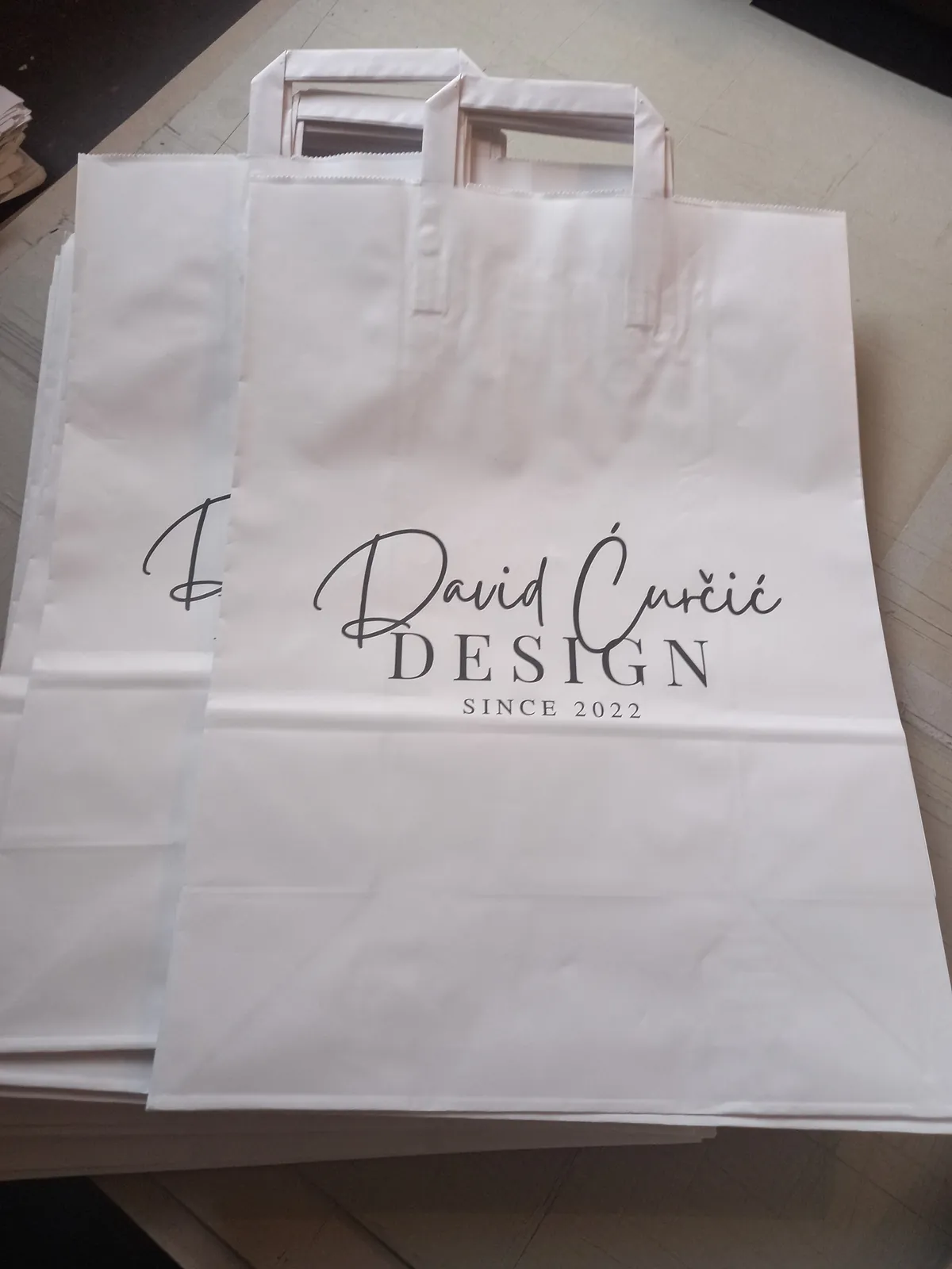 Kada počinjete biznis, ili želite neku manju količinu kesa sa vašim brendom, preporučujemo povoljniju varijantu. Ovo su papirne kese, već urađene, koje mogu da se poruče u količini koja vam je potrebna. Možemo da uštampamo vaš logo u boji po vašoj želji. Na primer crne kese sa zlatnom štampom izgledaju baš lepo, a veoma su povoljne. Takođe za dizajnera koji isporučuje elegantne haljine, štampamo logo u crnoj boji na velikoj beloj kesi.