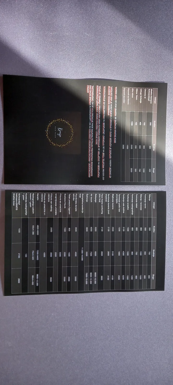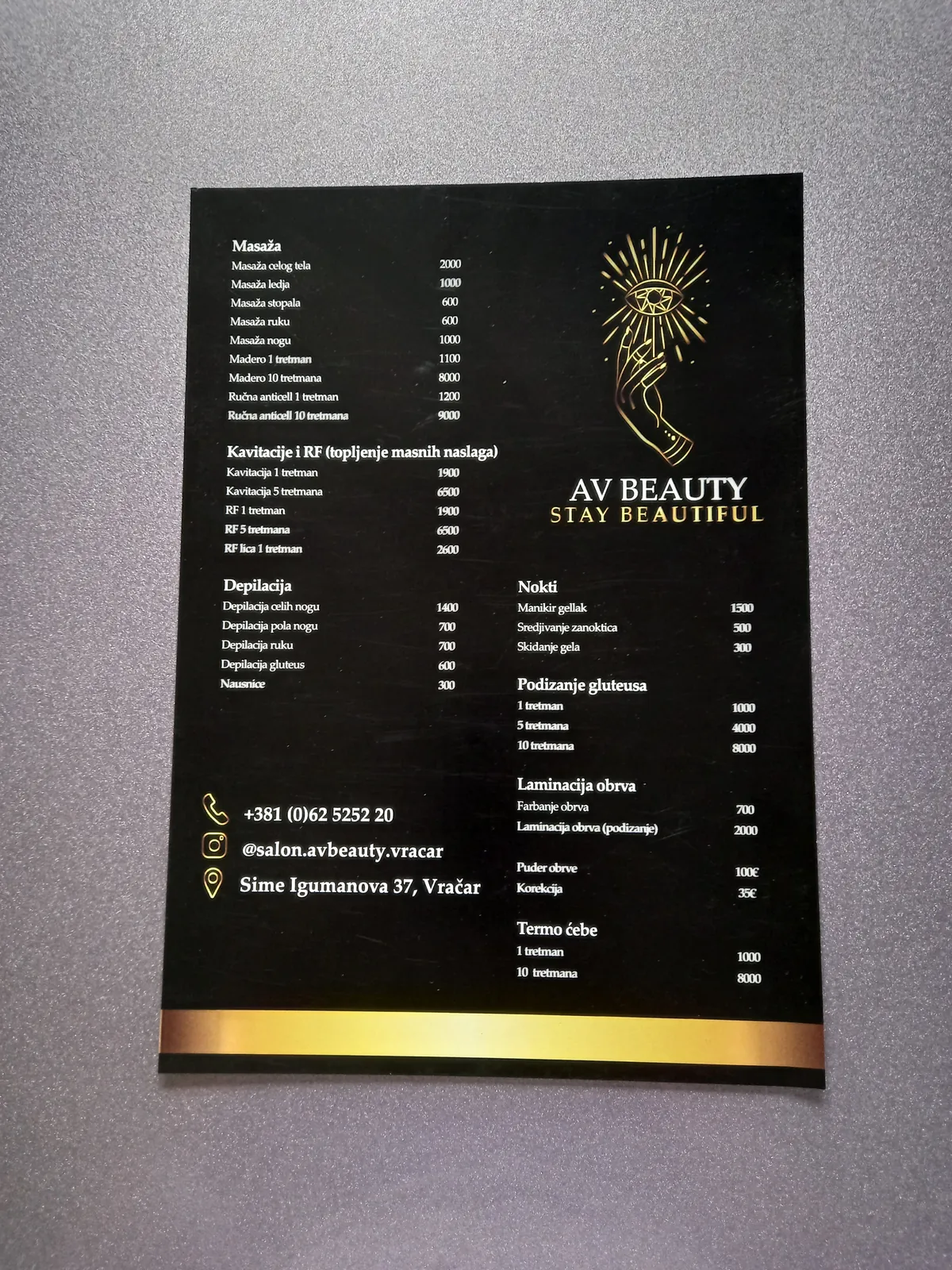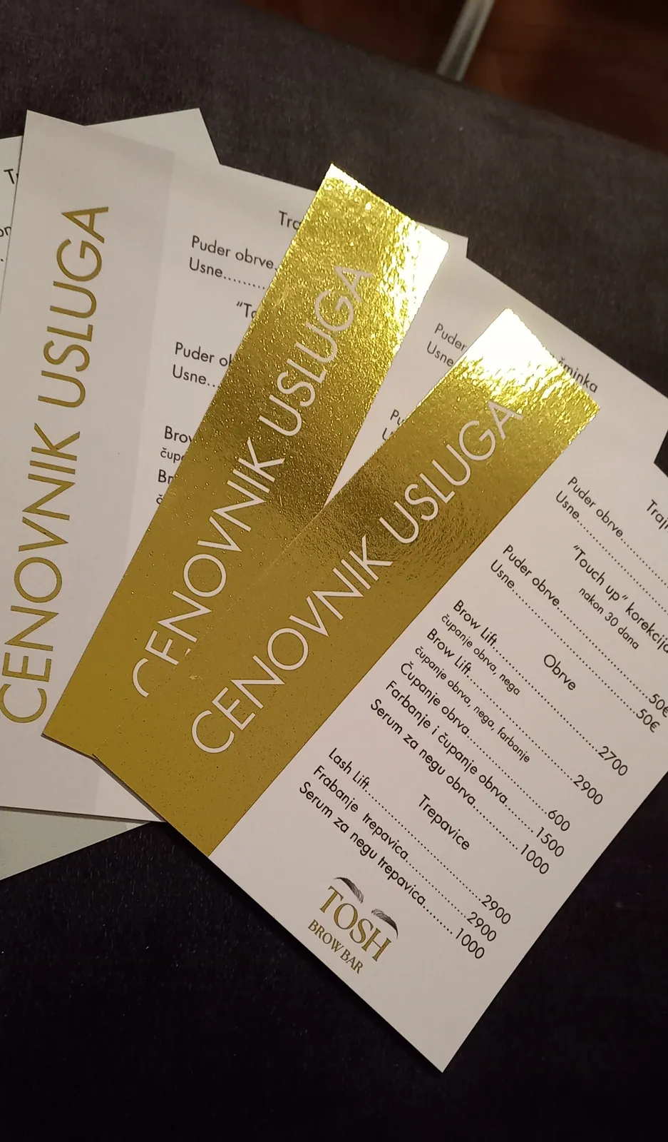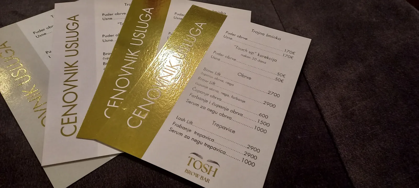 Štampamo često cenovnike za kozmetičke salone standardnom tehnikom štampom ili sa elementima u zlatotisku, što zaista ostavlja utisak. Cenovnik može biti u A4 formatu ili u nekom većem formatu ukoliko treba da bude zalepljen na vidno mesto. Takođe cenovnik može biti plastificiran ako se više puta uzima u ruke.