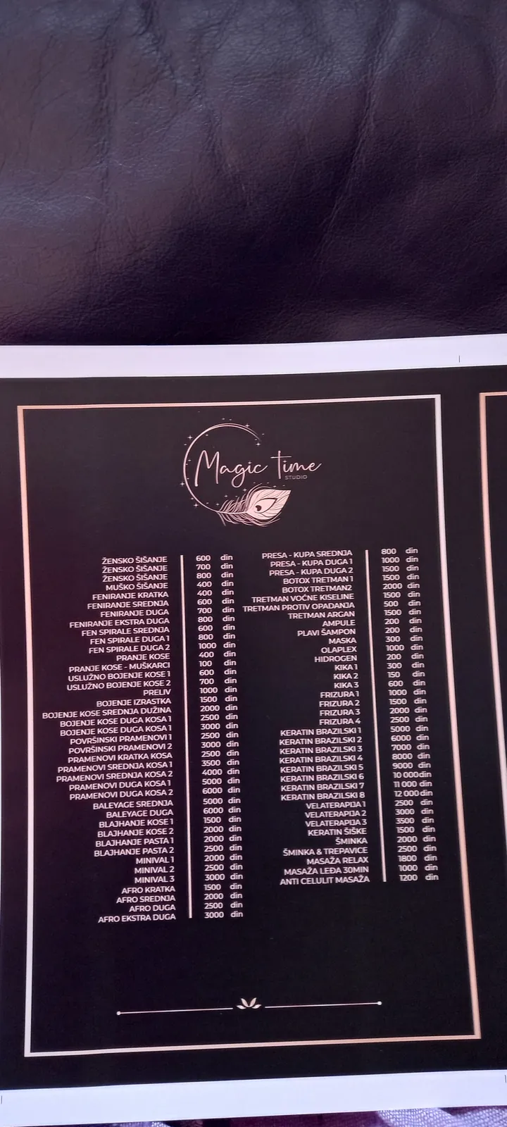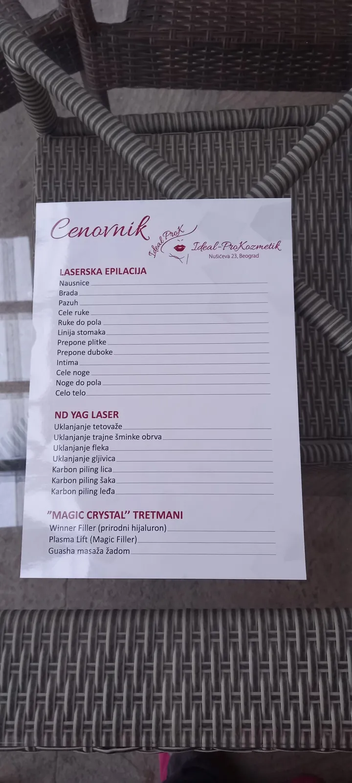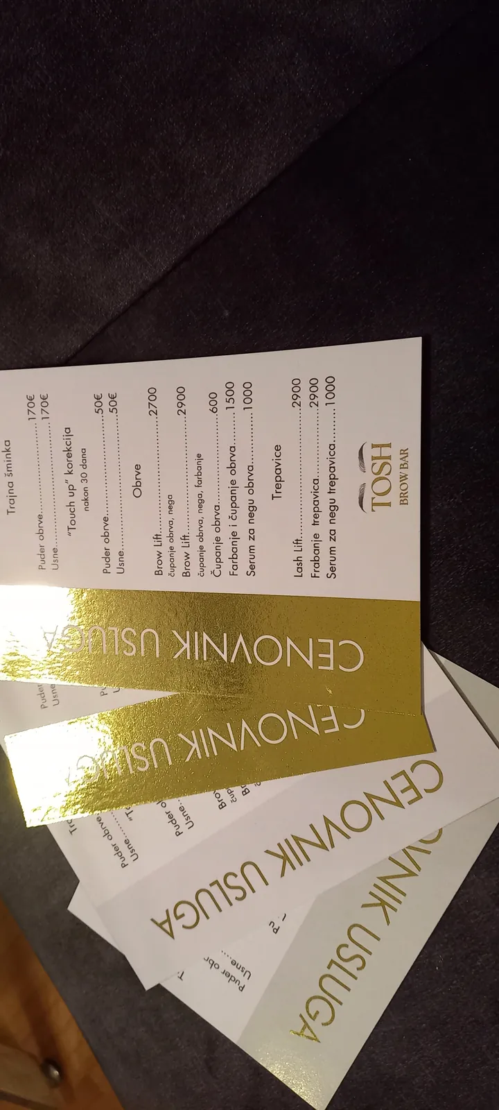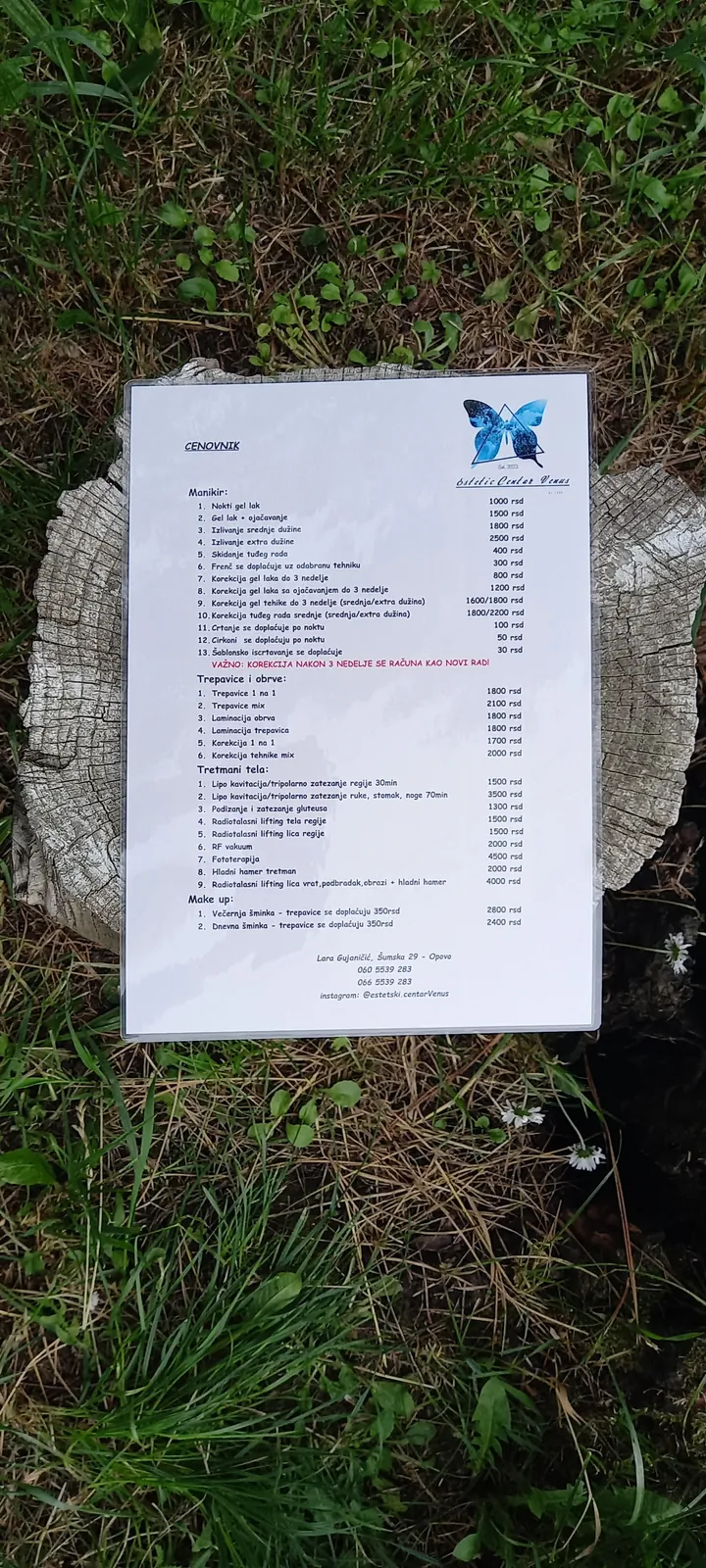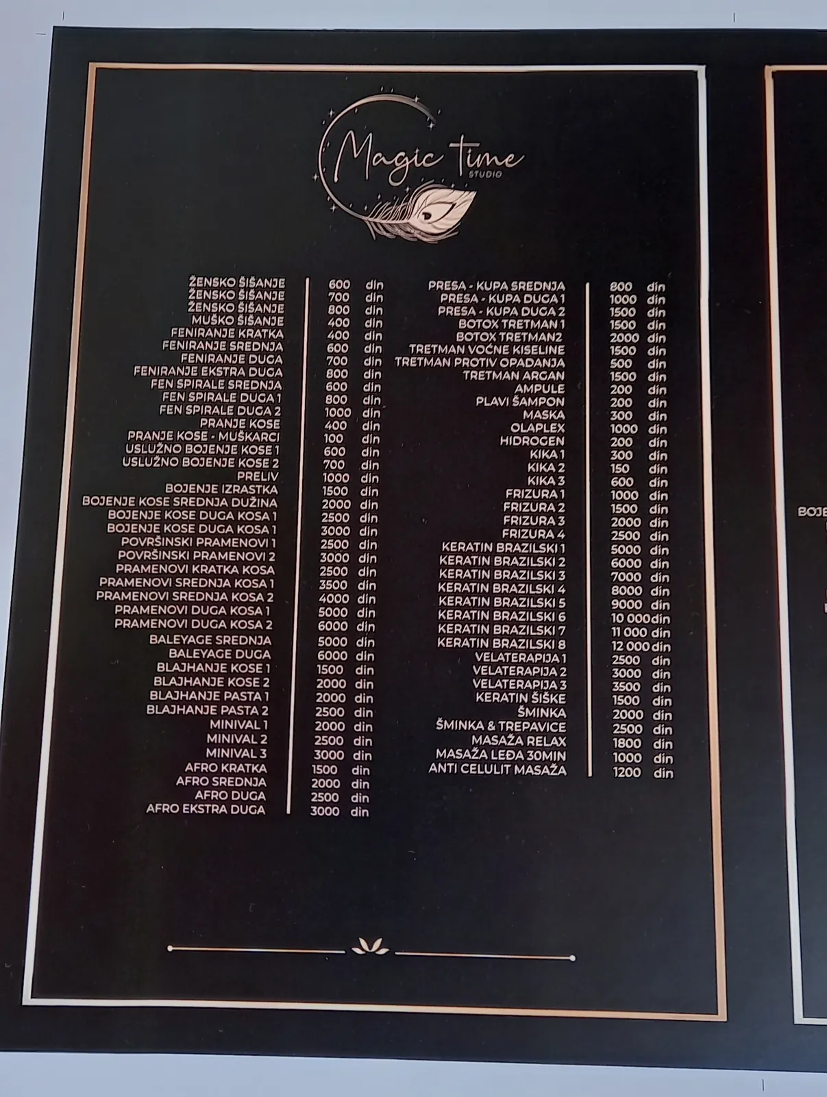 Štampamo često cenovnike za kozmetičke salone standardnom tehnikom štampom ili sa elementima u zlatotisku, što zaista ostavlja utisak. Cenovnik može biti u A4 formatu ili u nekom većem formatu ukoliko treba da bude zalepljen na vidno mesto. Takođe cenovnik može biti plastificiran ako se više puta uzima u ruke.