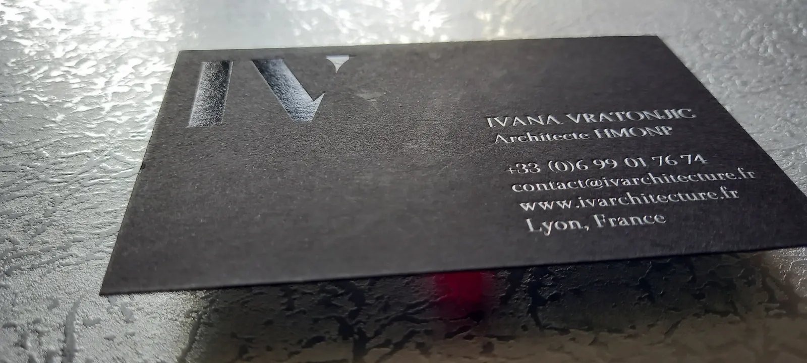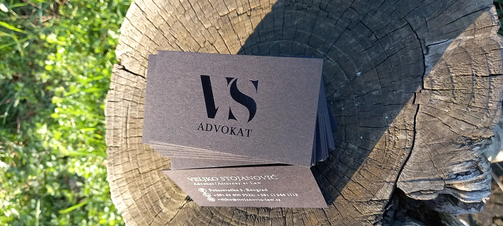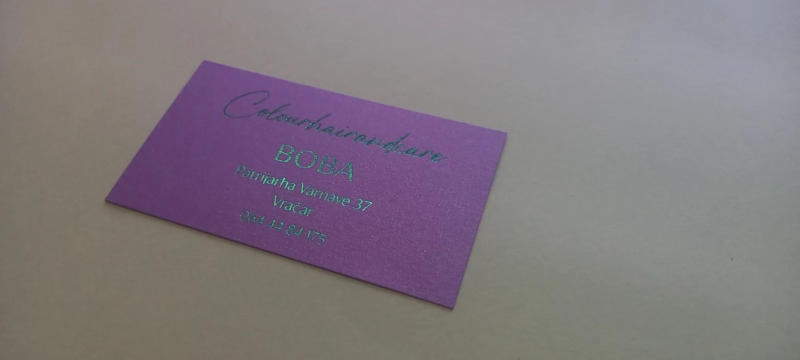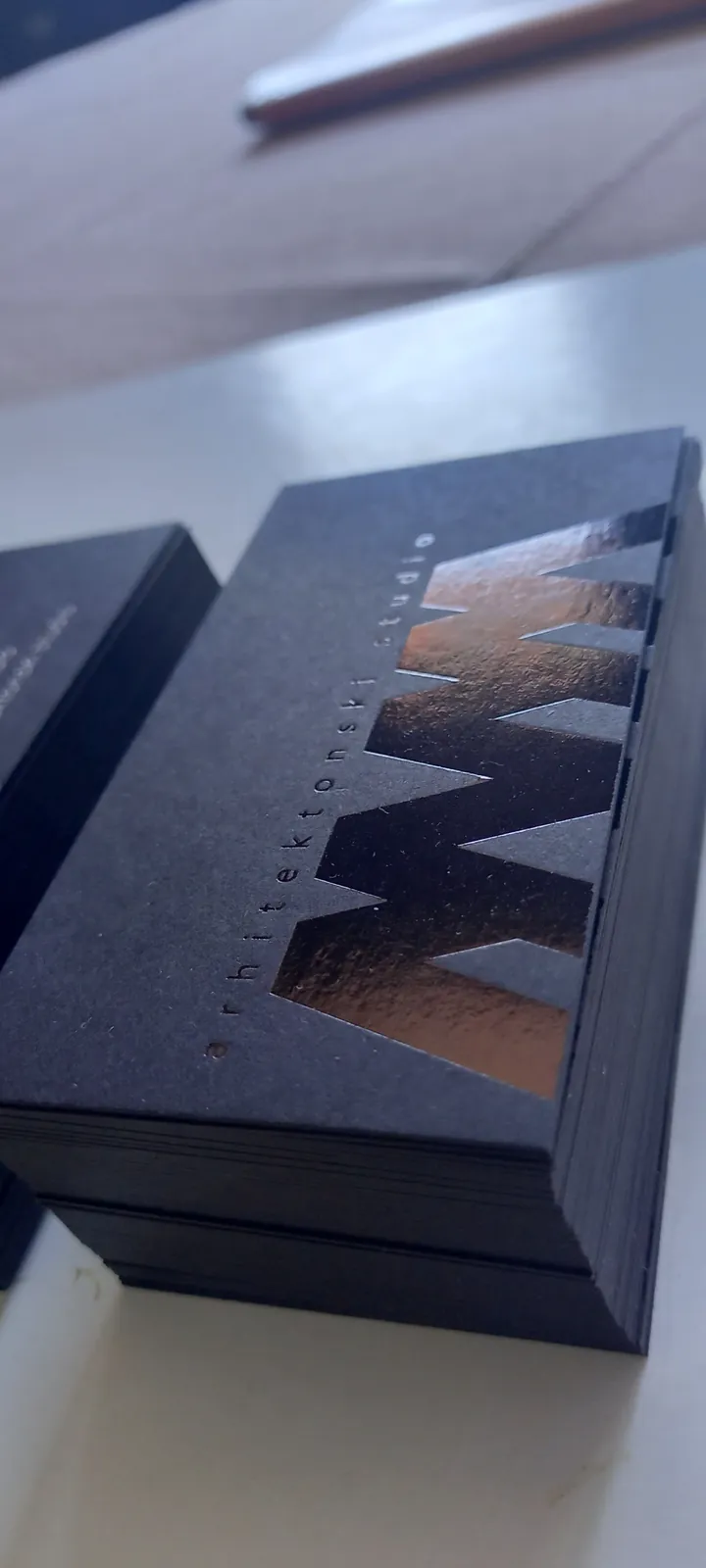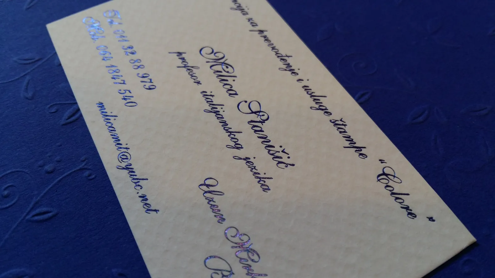 Radimo često foliotisak u raznim bojama na specijalnim italijanskim papirima: crni foliotisak na crnom papiru zaista je veoma efektan! Zatim crvena folija, zelena, crna folija na belom papiru, tirkizno-plava folija, plava. Beli foliotisak na tamnim papirima. Ideje naših klijenata su nepresušne, mi se trudimo da sve želje ispunimo. Često nam klijenti traže crni foliotisak na belom papiru jer folija ima veći sjaj od obične crne štampe i slova su utisnuta.