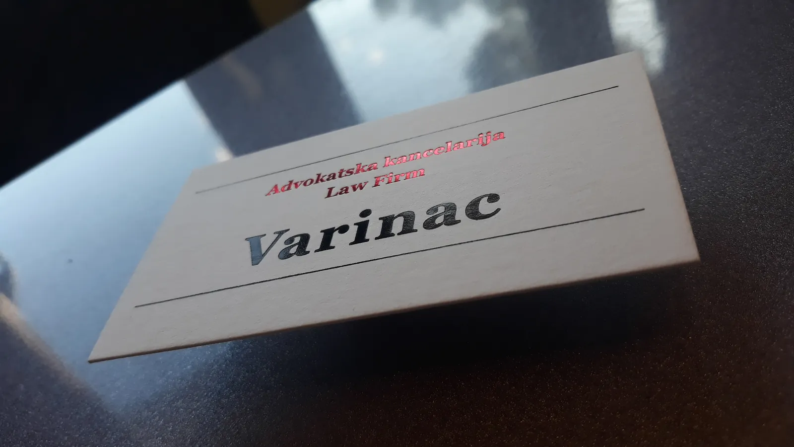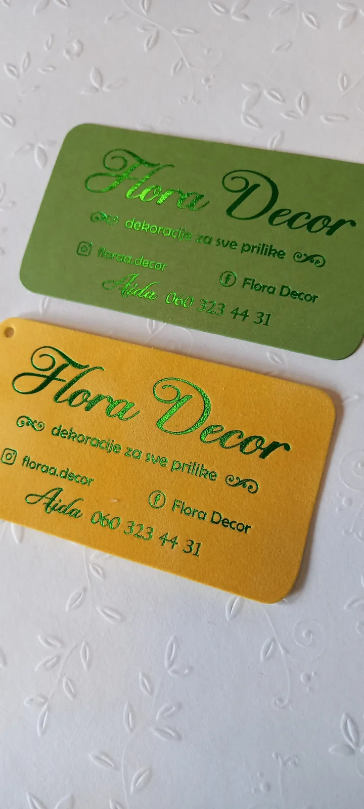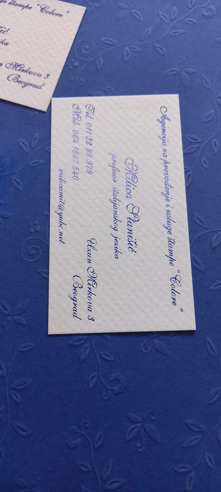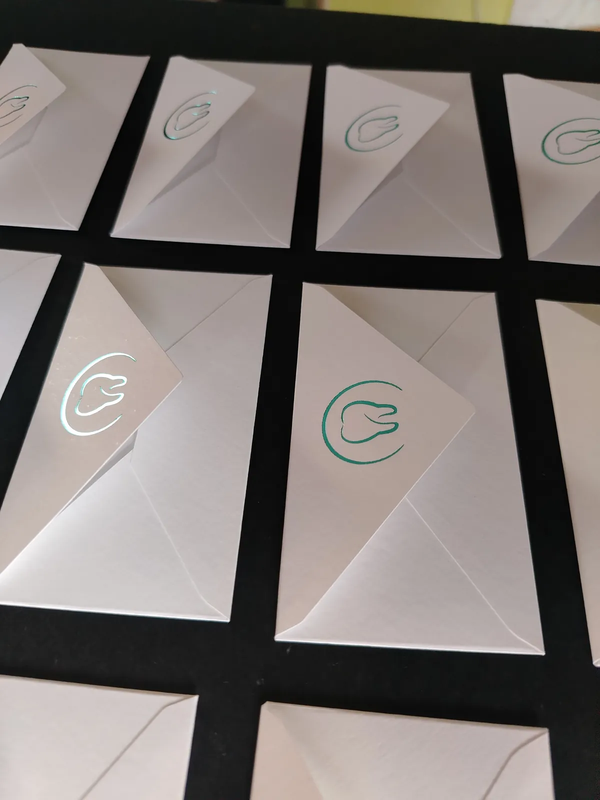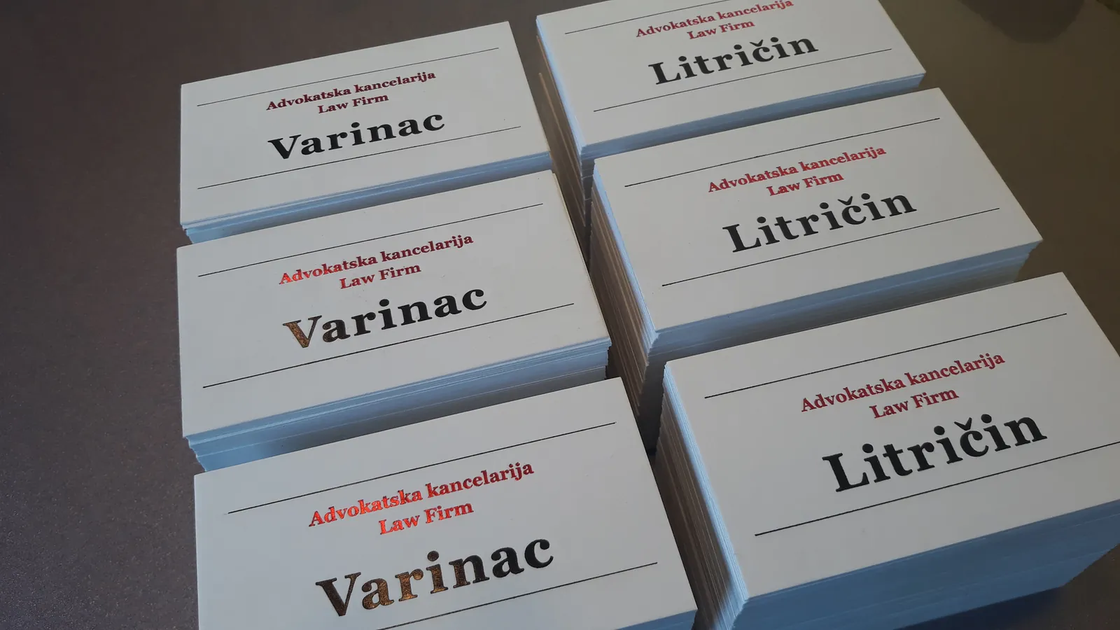 Radimo često foliotisak u raznim bojama na specijalnim italijanskim papirima: crni foliotisak na crnom papiru zaista je veoma efektan! Zatim crvena folija, zelena, crna folija na belom papiru, tirkizno-plava folija, plava. Beli foliotisak na tamnim papirima. Ideje naših klijenata su nepresušne, mi se trudimo da sve želje ispunimo. Često nam klijenti traže crni foliotisak na belom papiru jer folija ima veći sjaj od obične crne štampe i slova su utisnuta.