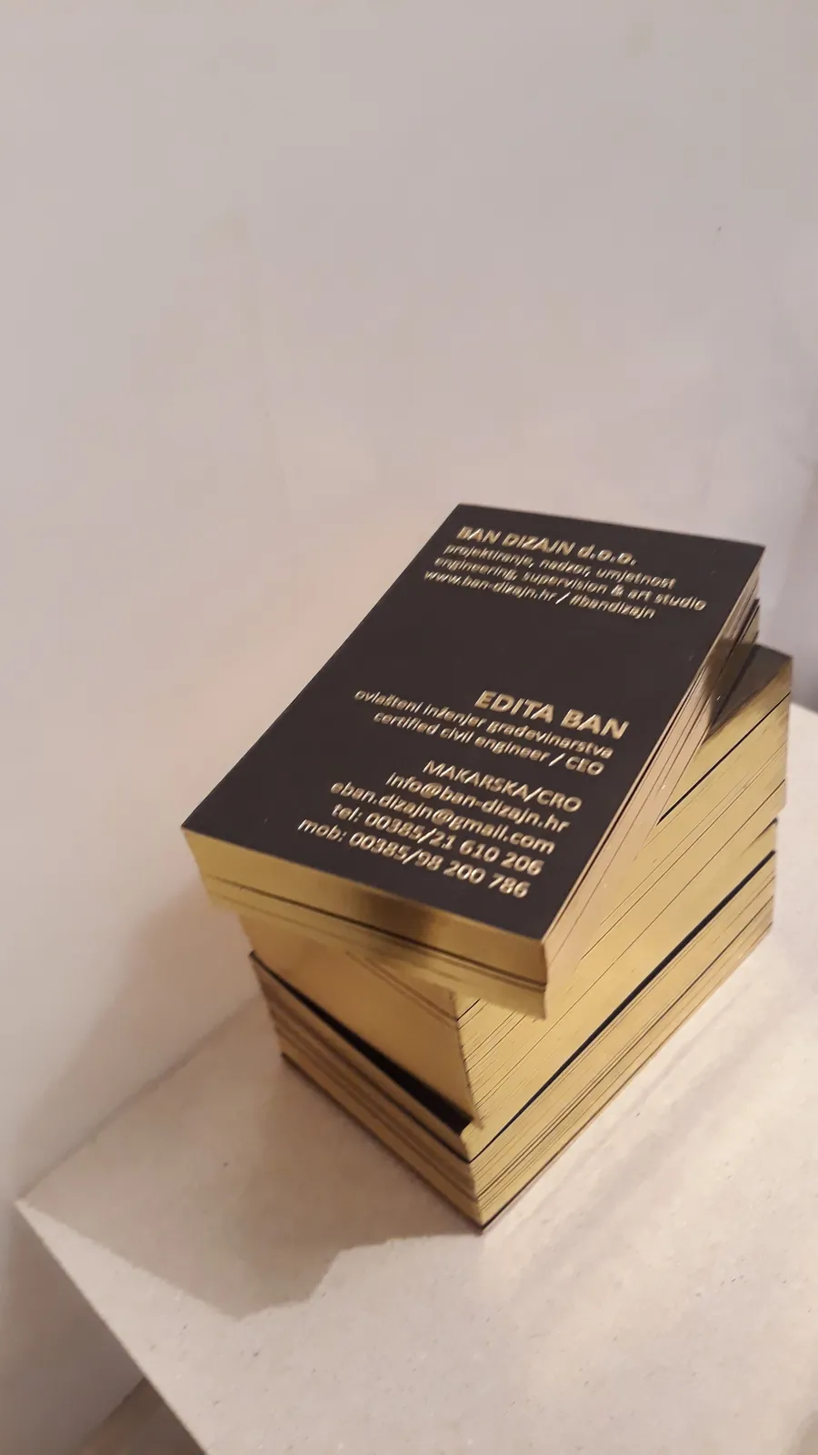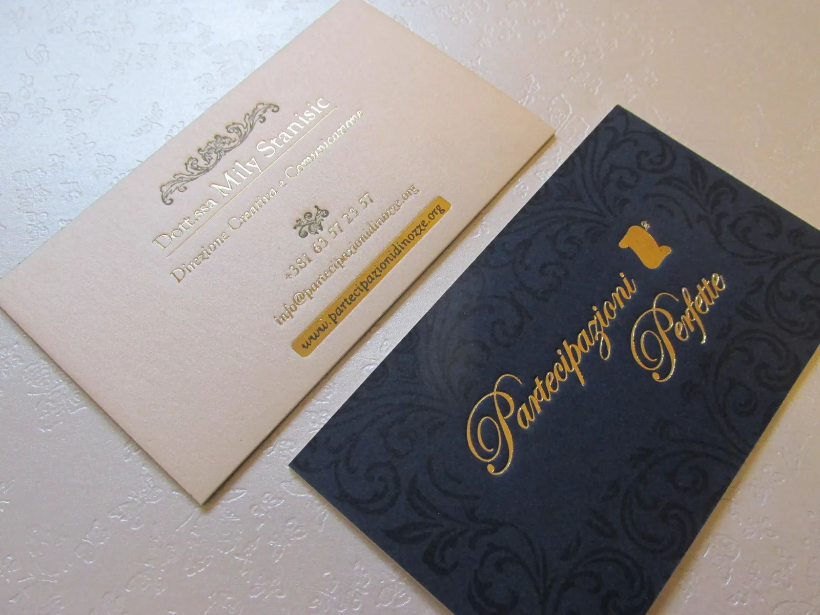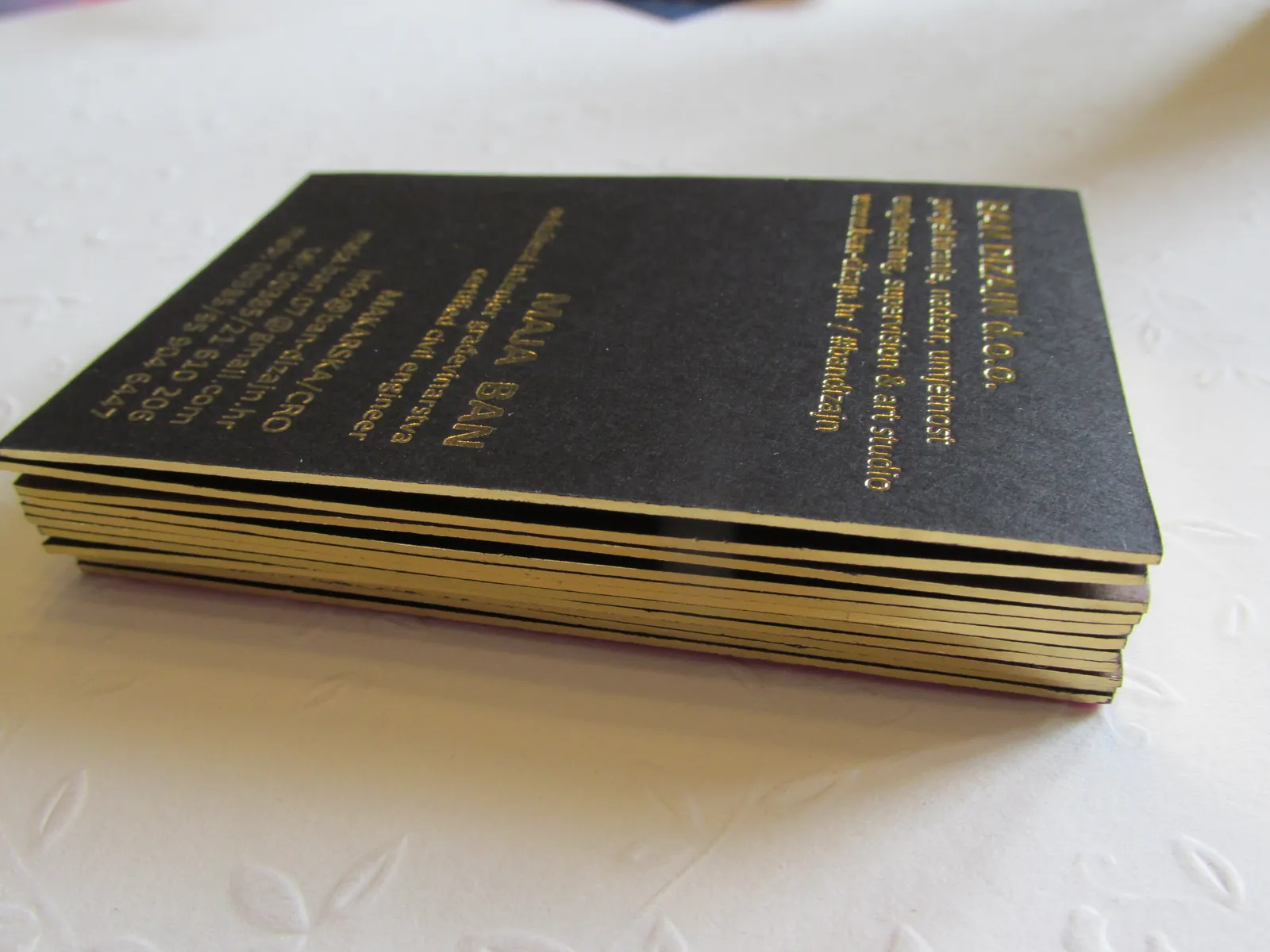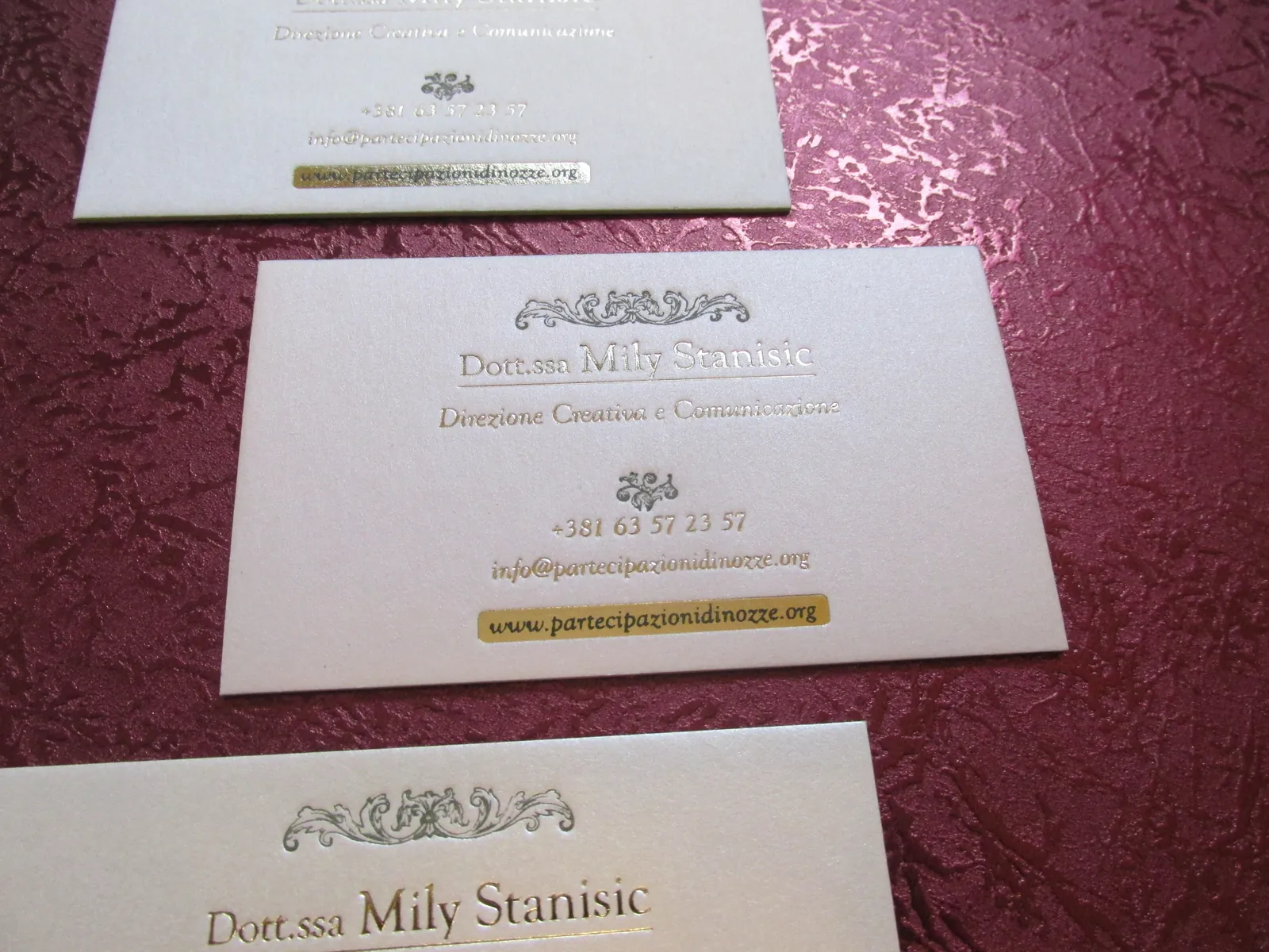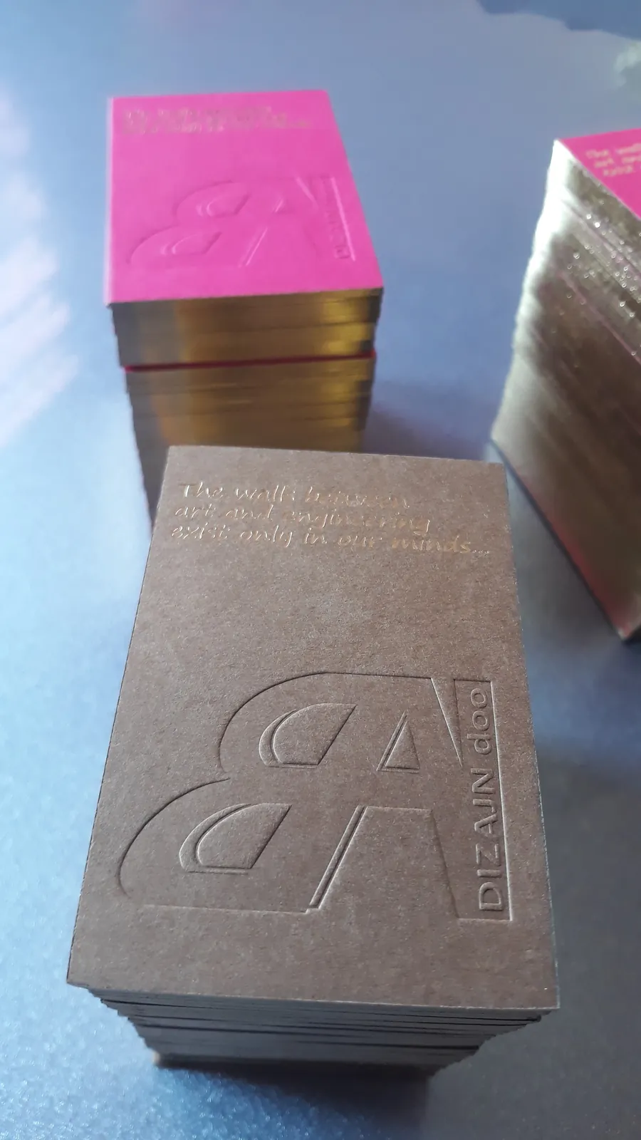Kada neko zaista želi otmene, luksuzne i neobične vizit karte, neka se obrati nama. Za ovakve vizit karte zaista je potrebno umeće stečeno godinama rada. Radimo vizit karte sa zlatnim ivicama ili srebrnim ivicama sa strane. Radimo vizit karte kao sendvič: beli papir- narandžasti u sredini – pa beli papir. Verujte ovo i u inostranstvu retko ko radi, a u Srbiji skoro samo mi.