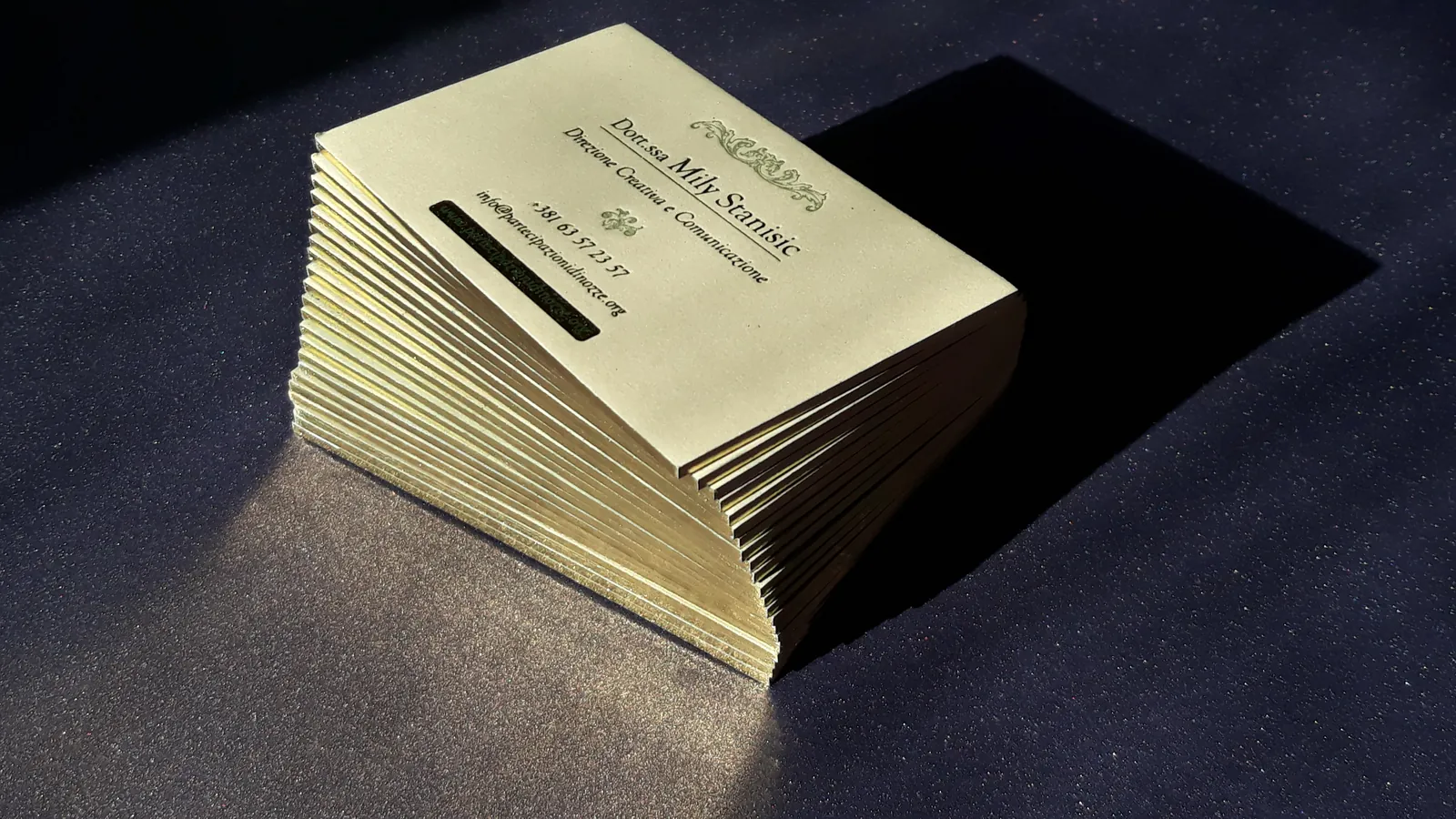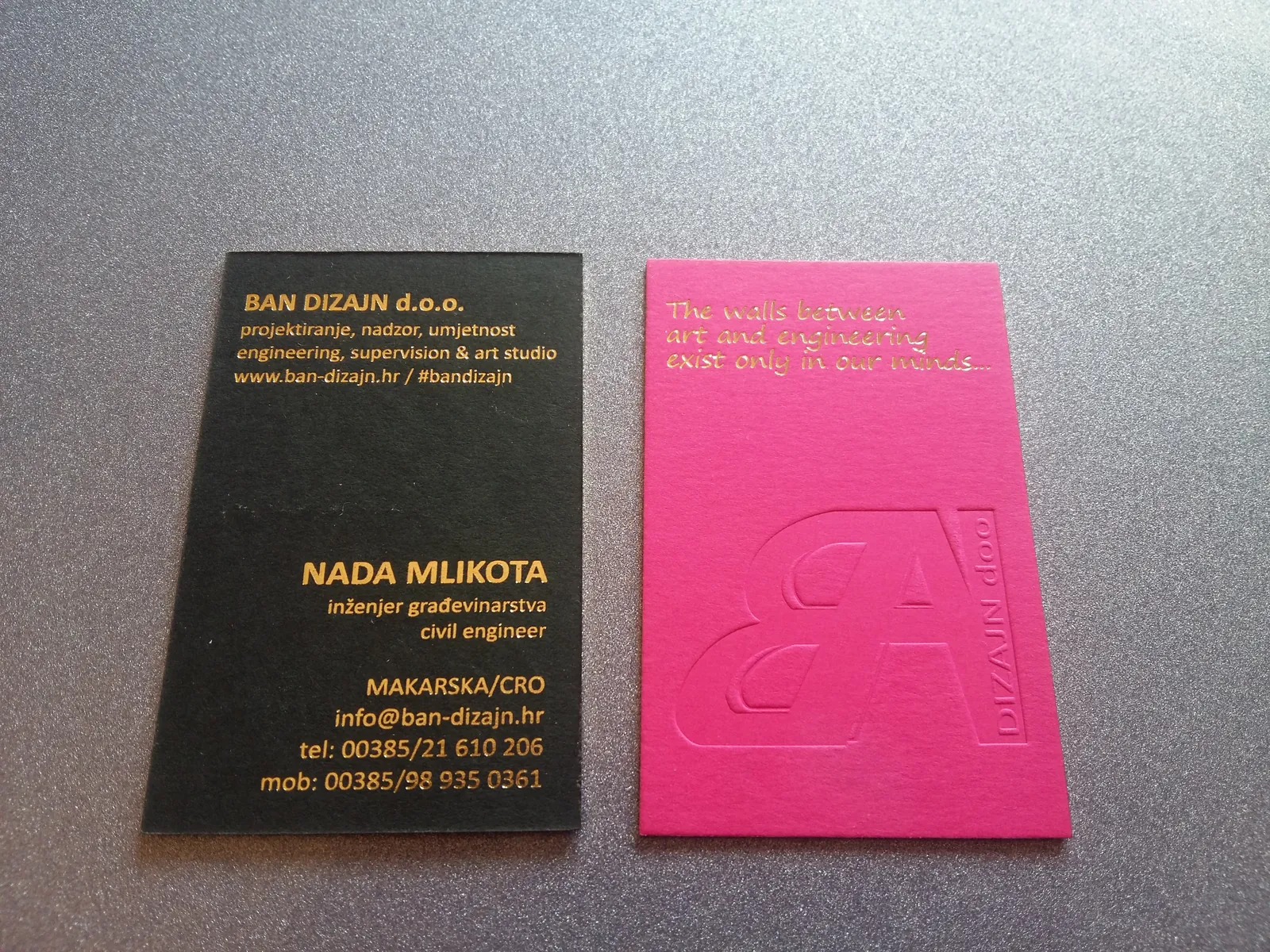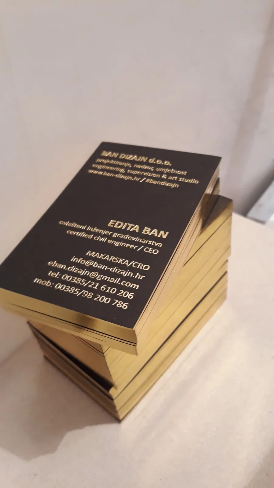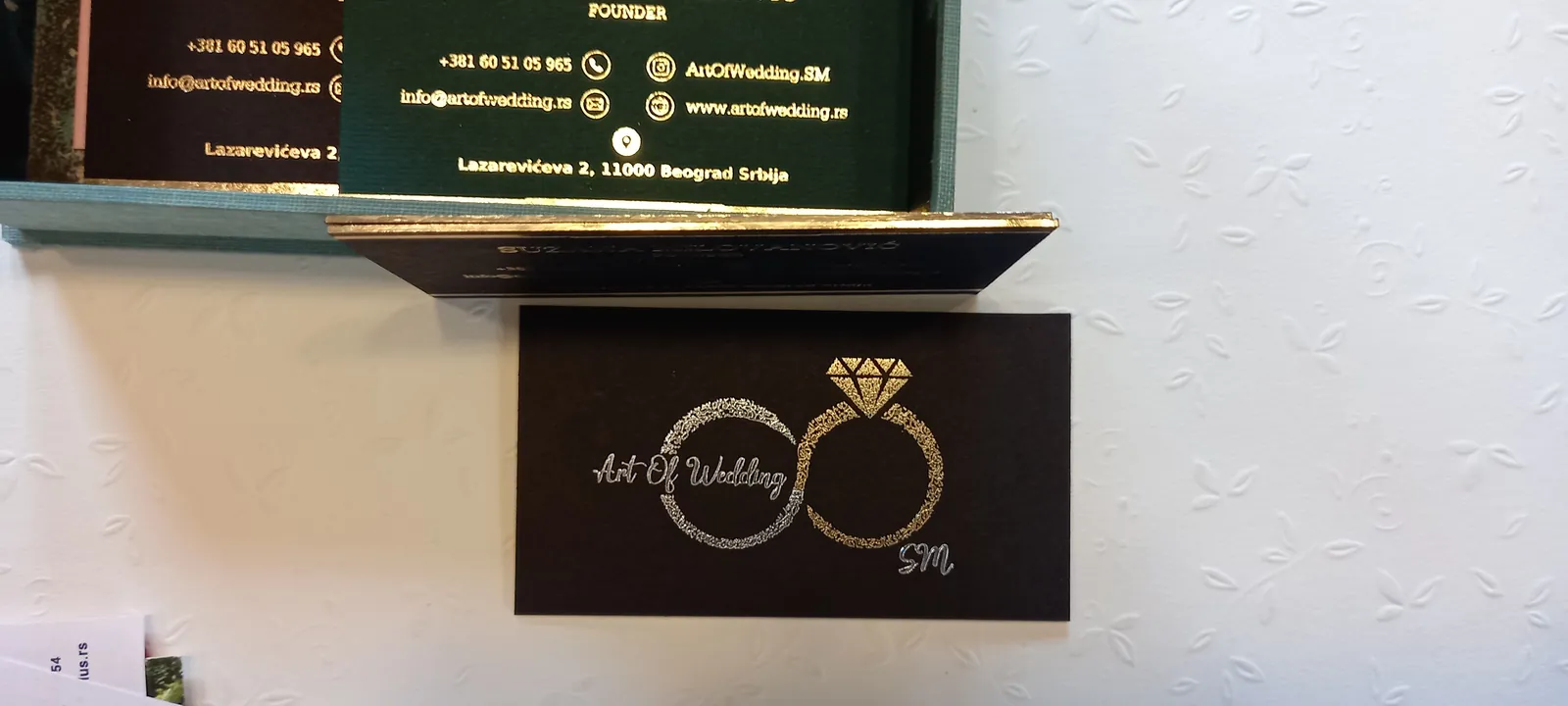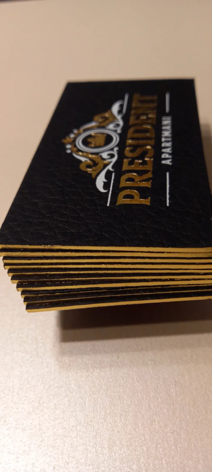 Kada neko zaista želi otmene, luksuzne i neobične vizit karte, neka se obrati nama. Za ovakve vizit karte zaista je potrebno umeće stečeno godinama rada. Radimo vizit karte sa zlatnim ivicama ili srebrnim ivicama sa strane. Radimo vizit karte kao sendvič: beli papir- narandžasti u sredini – pa beli papir. Verujte ovo i u inostranstvu retko ko radi, a u Srbiji skoro samo mi.