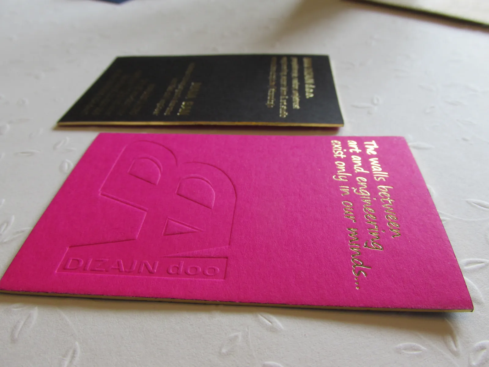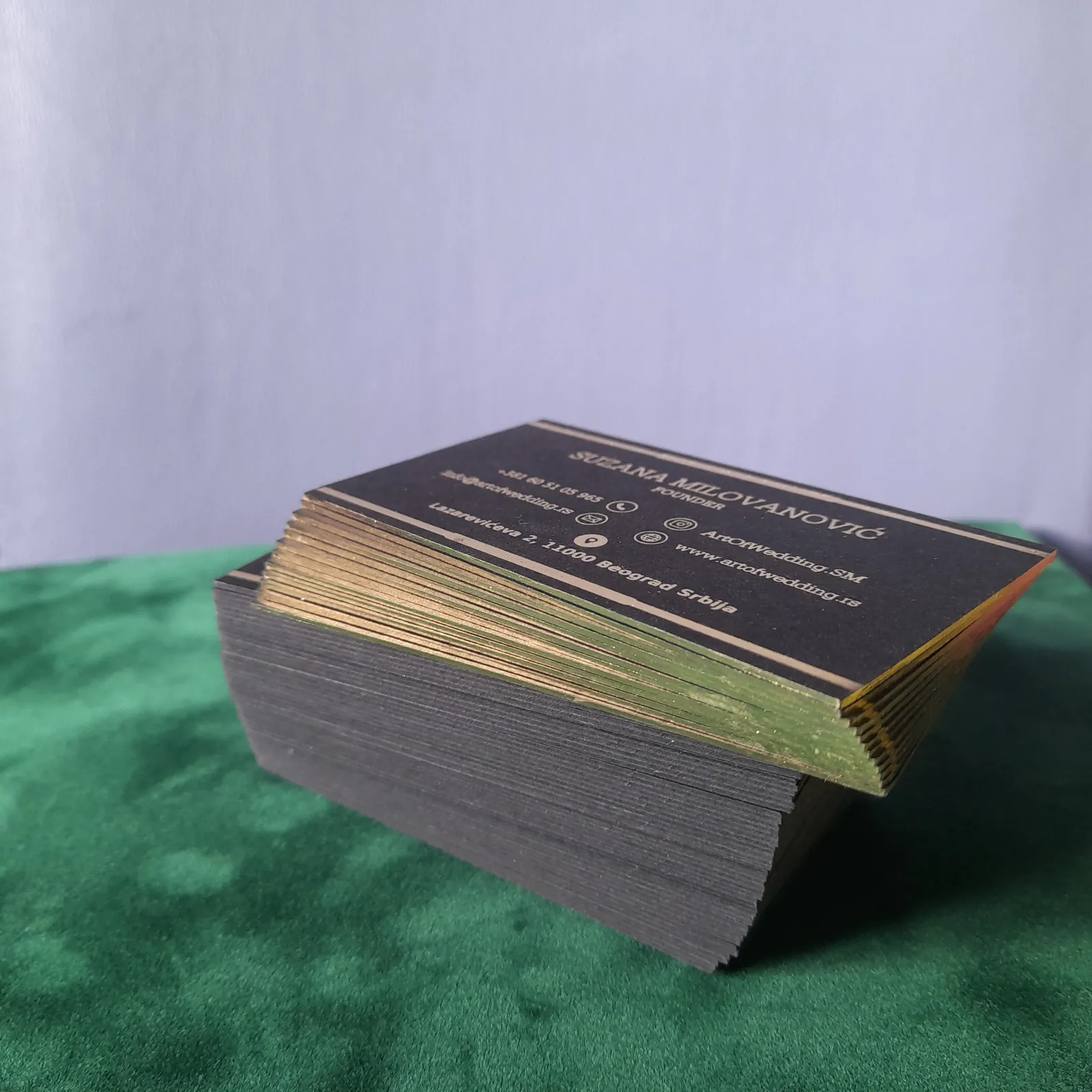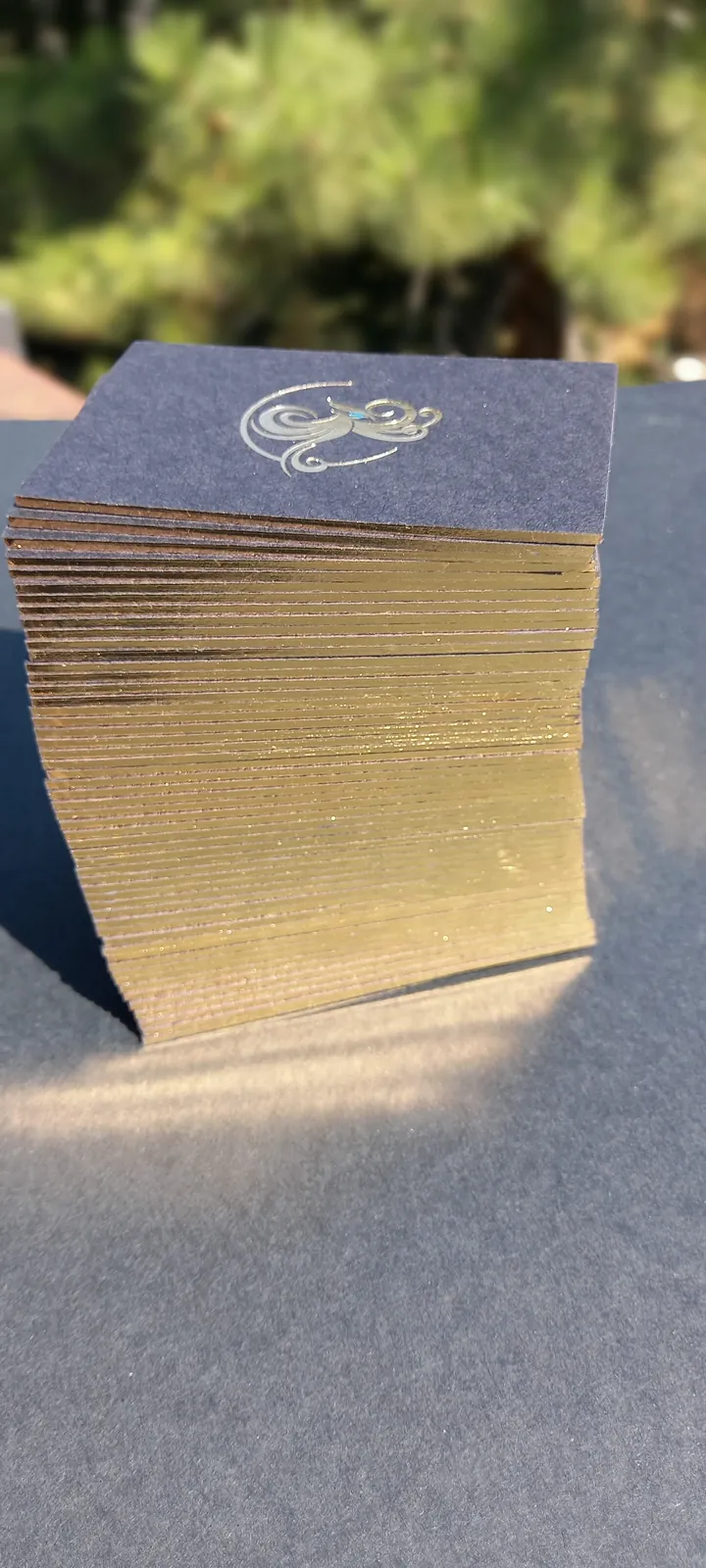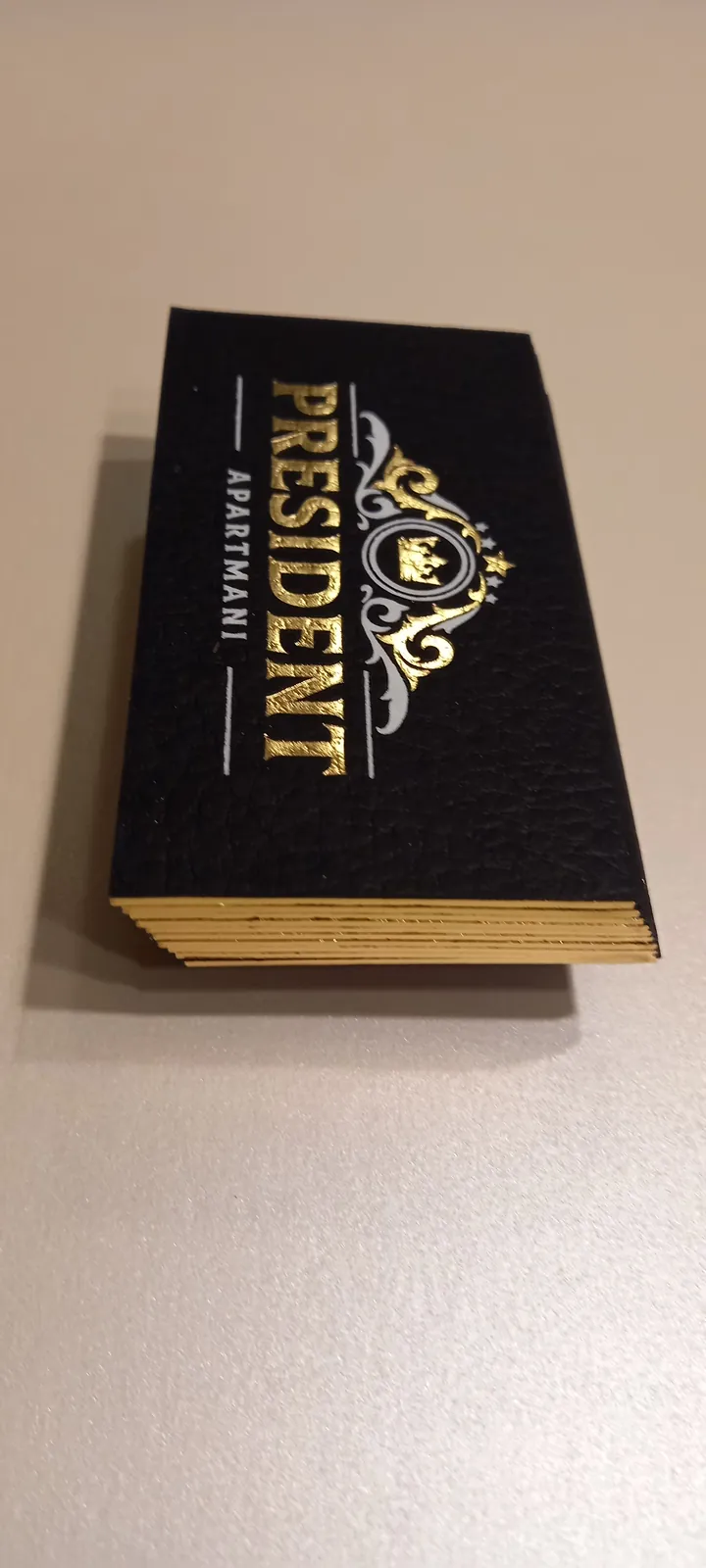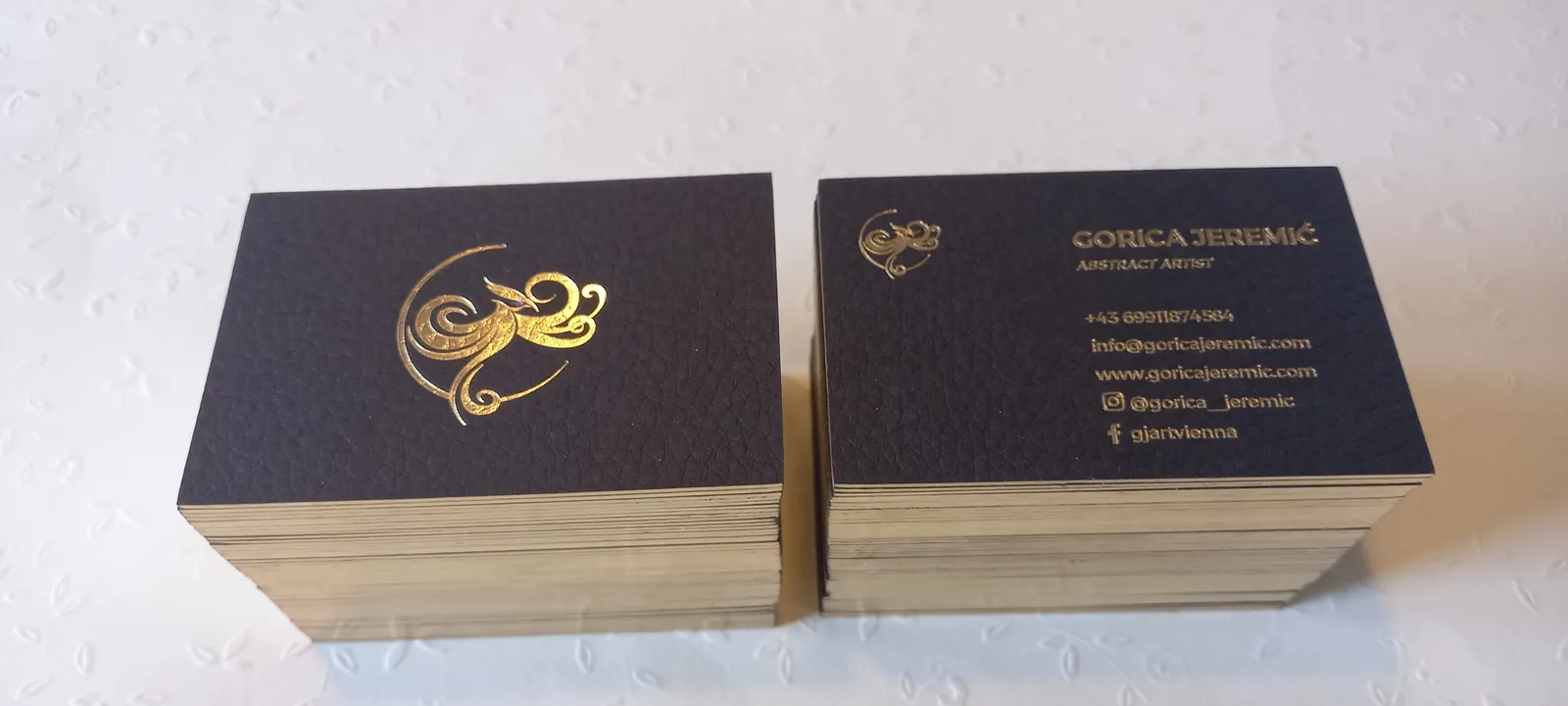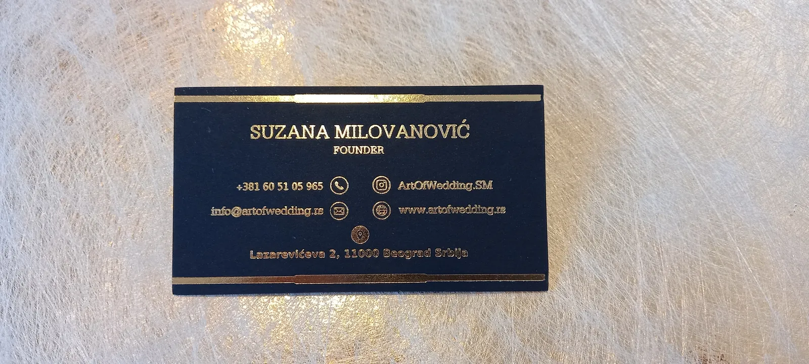 Kada neko zaista želi otmene, luksuzne i neobične vizit karte, neka se obrati nama. Za ovakve vizit karte zaista je potrebno umeće stečeno godinama rada. Radimo vizit karte sa zlatnim ivicama ili srebrnim ivicama sa strane. Radimo vizit karte kao sendvič: beli papir- narandžasti u sredini – pa beli papir. Verujte ovo i u inostranstvu retko ko radi, a u Srbiji skoro samo mi.