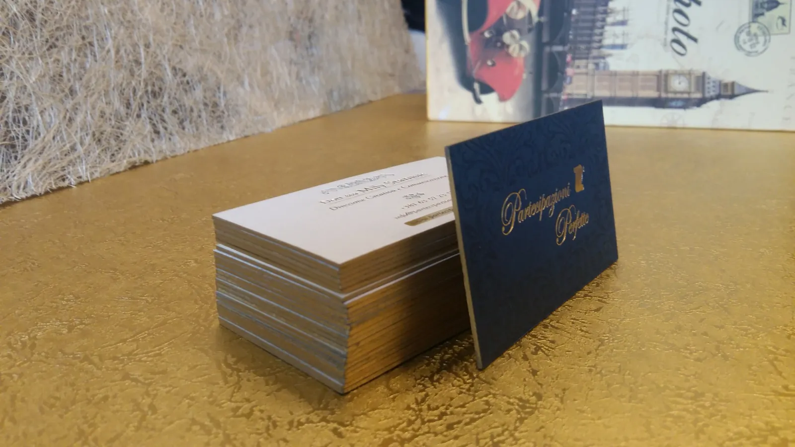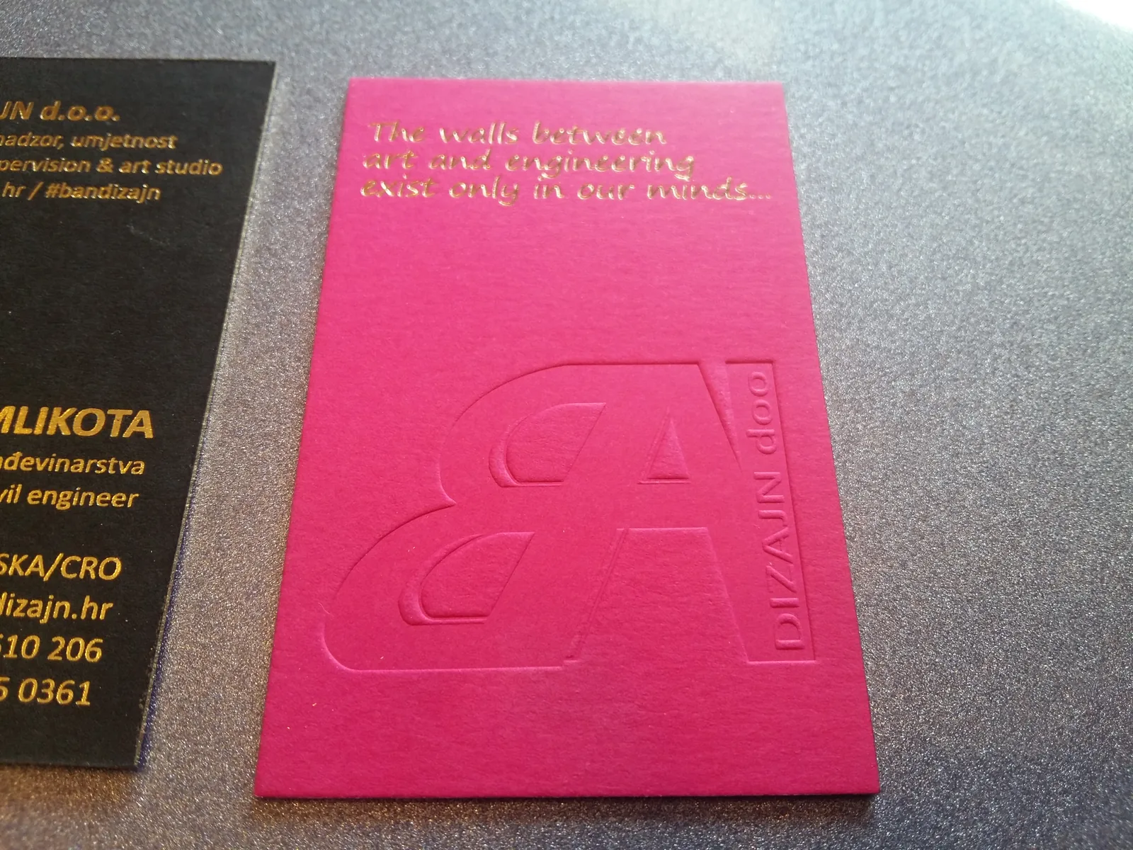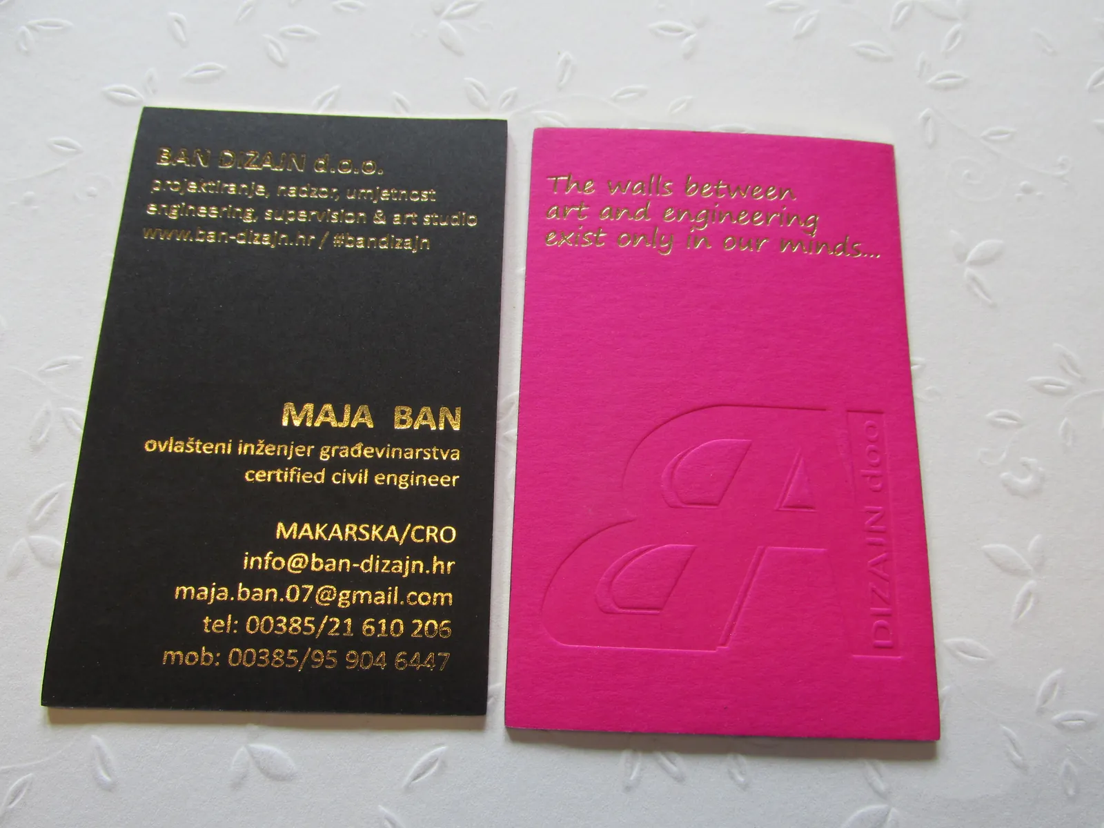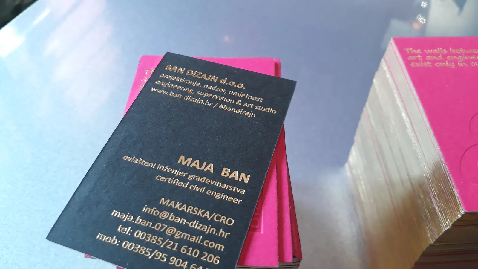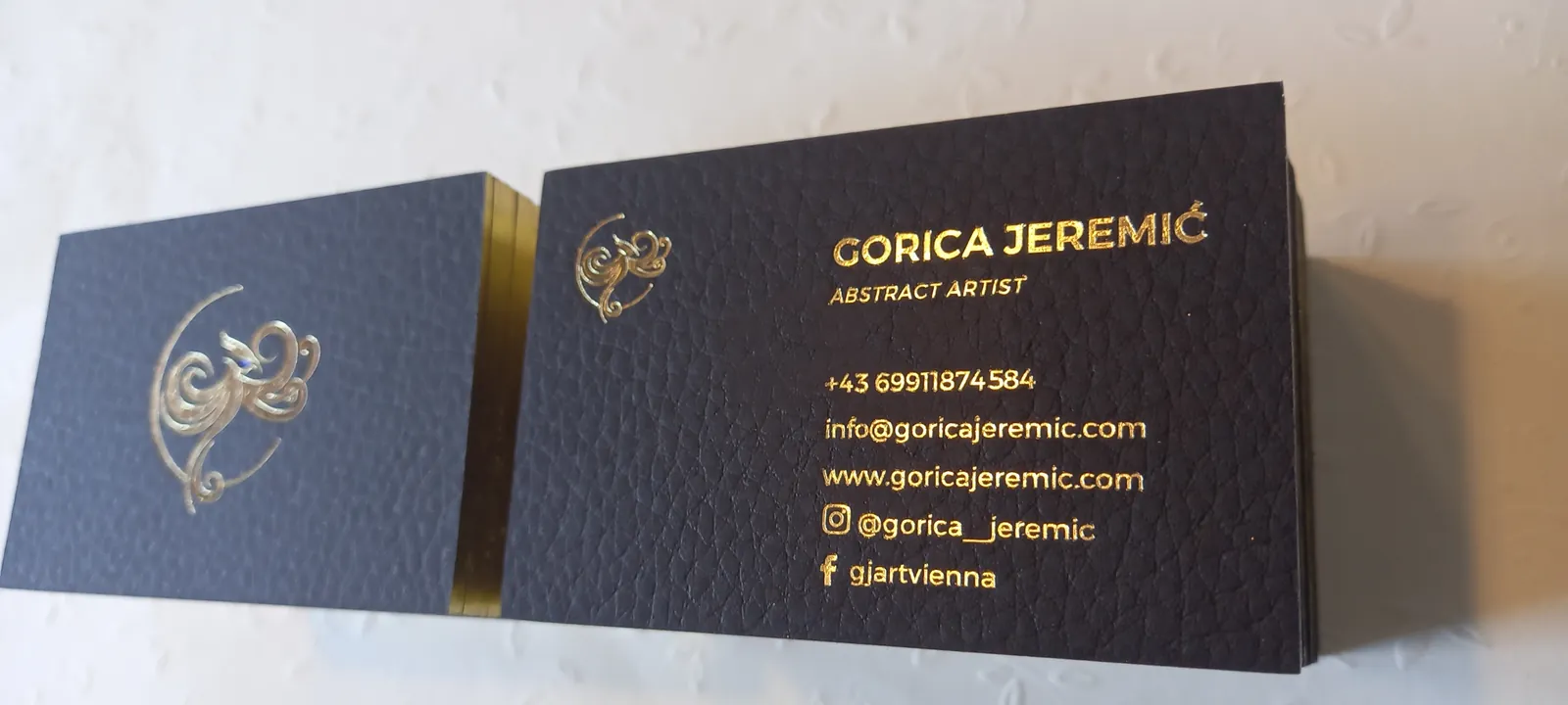 Kada neko zaista želi otmene, luksuzne i neobične vizit karte, neka se obrati nama. Za ovakve vizit karte zaista je potrebno umeće stečeno godinama rada. Radimo vizit karte sa zlatnim ivicama ili srebrnim ivicama sa strane. Radimo vizit karte kao sendvič: beli papir- narandžasti u sredini – pa beli papir. Verujte ovo i u inostranstvu retko ko radi, a u Srbiji skoro samo mi.