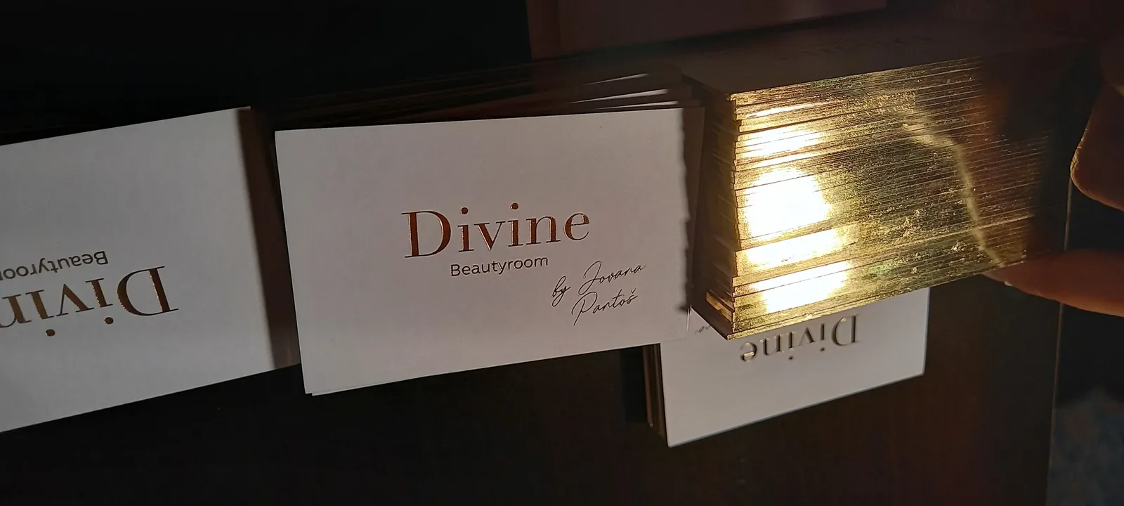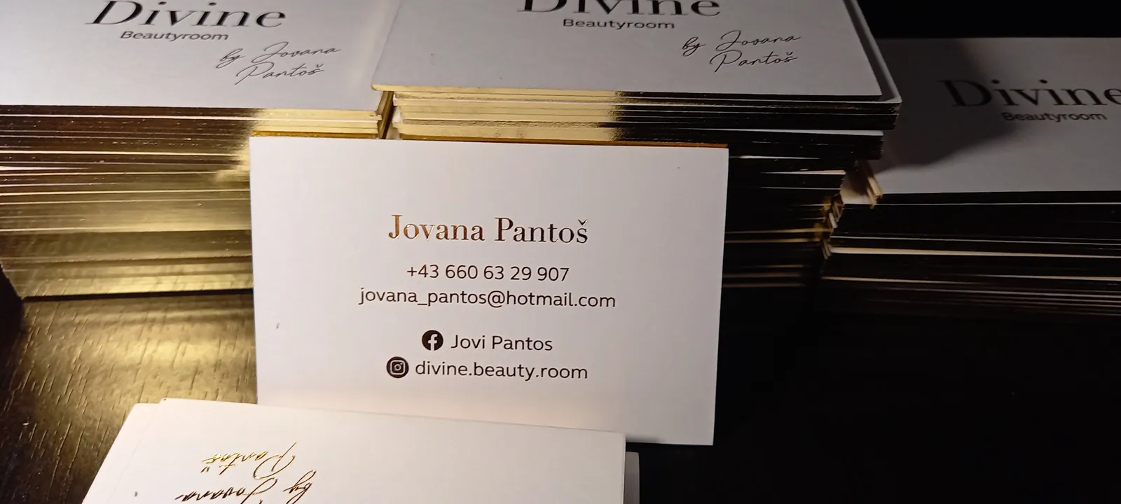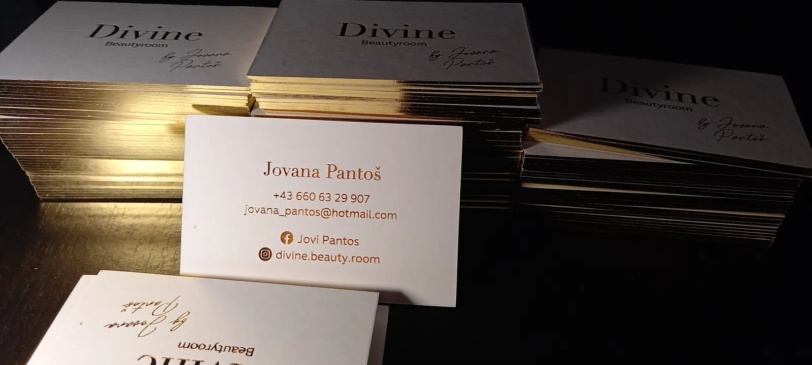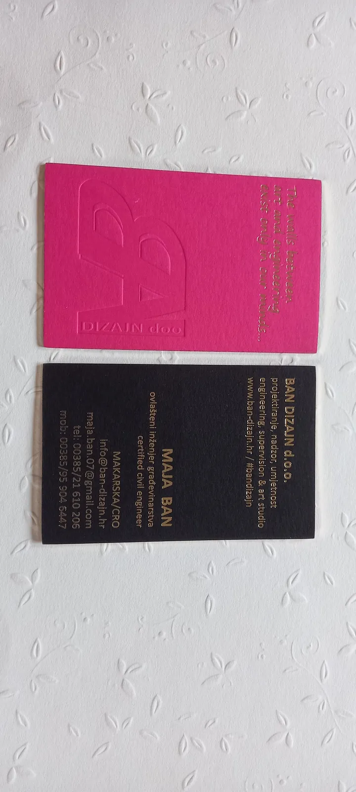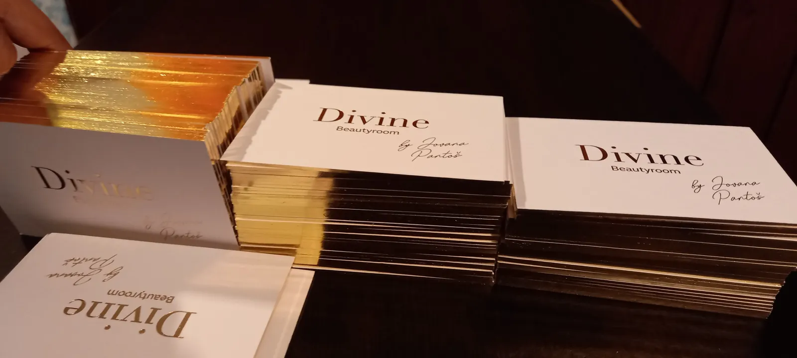 Kada neko zaista želi otmene, luksuzne i neobične vizit karte, neka se obrati nama. Za ovakve vizit karte zaista je potrebno umeće stečeno godinama rada. Radimo vizit karte sa zlatnim ivicama ili srebrnim ivicama sa strane. Radimo vizit karte kao sendvič: beli papir- narandžasti u sredini – pa beli papir. Verujte ovo i u inostranstvu retko ko radi, a u Srbiji skoro samo mi.