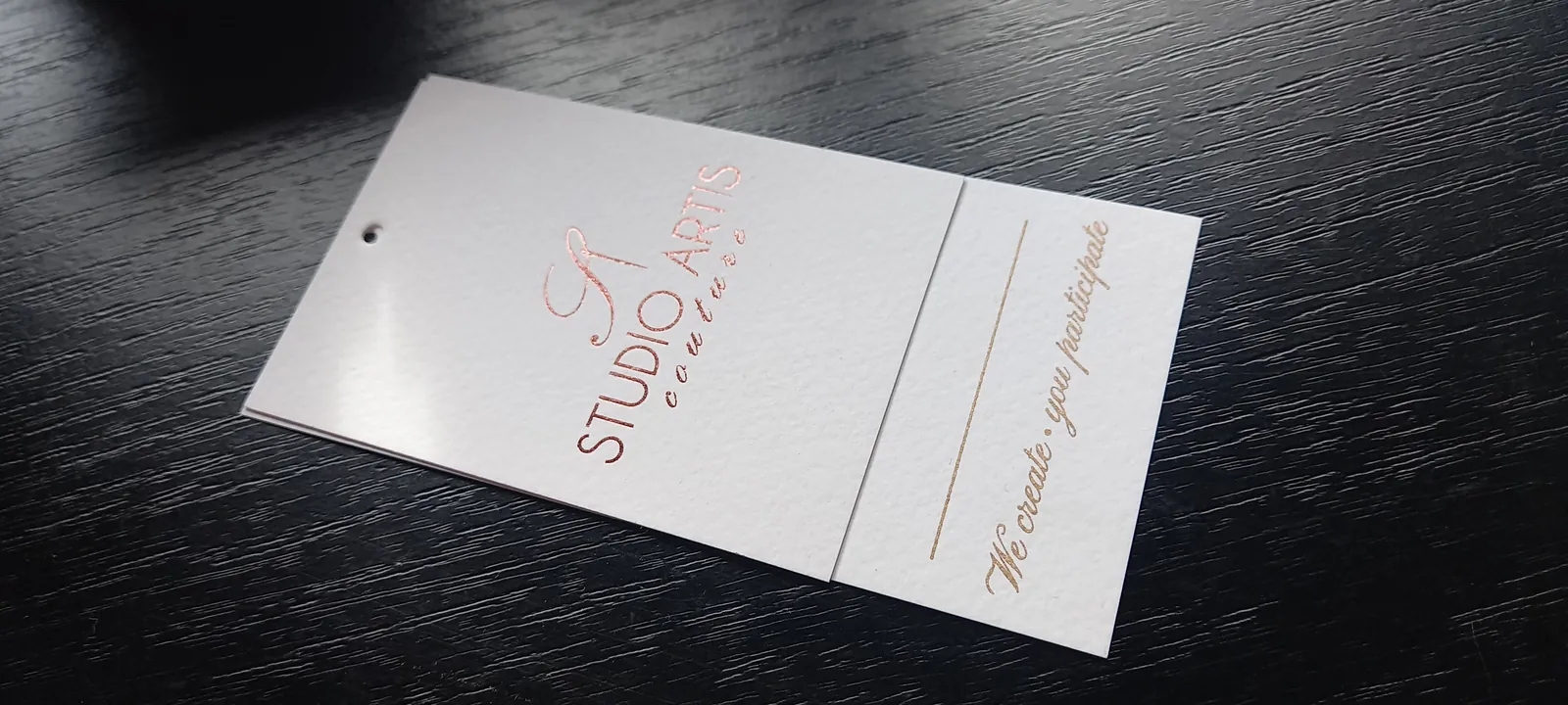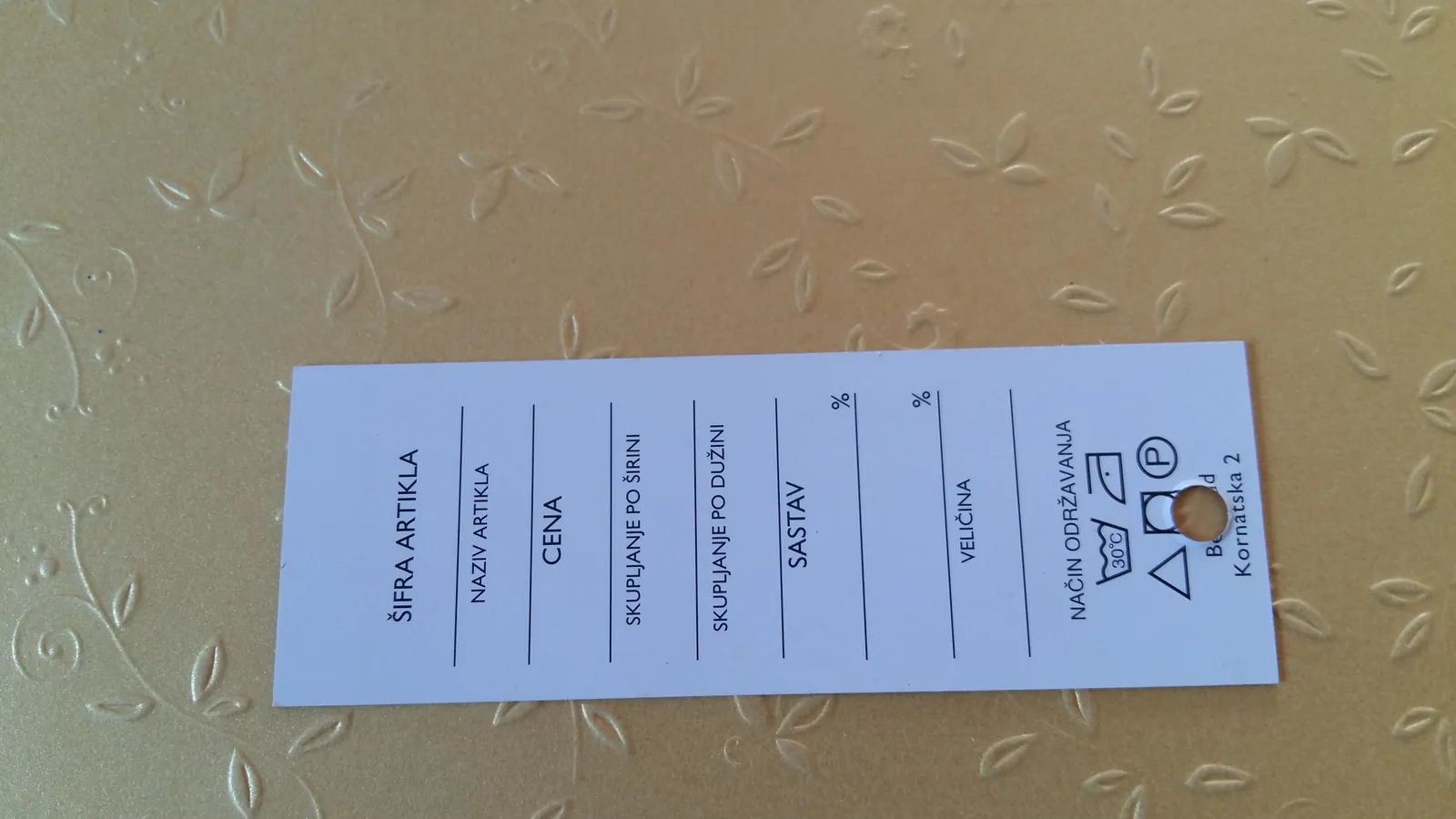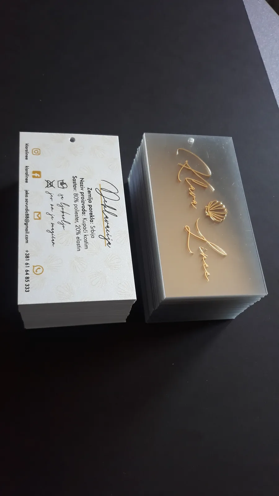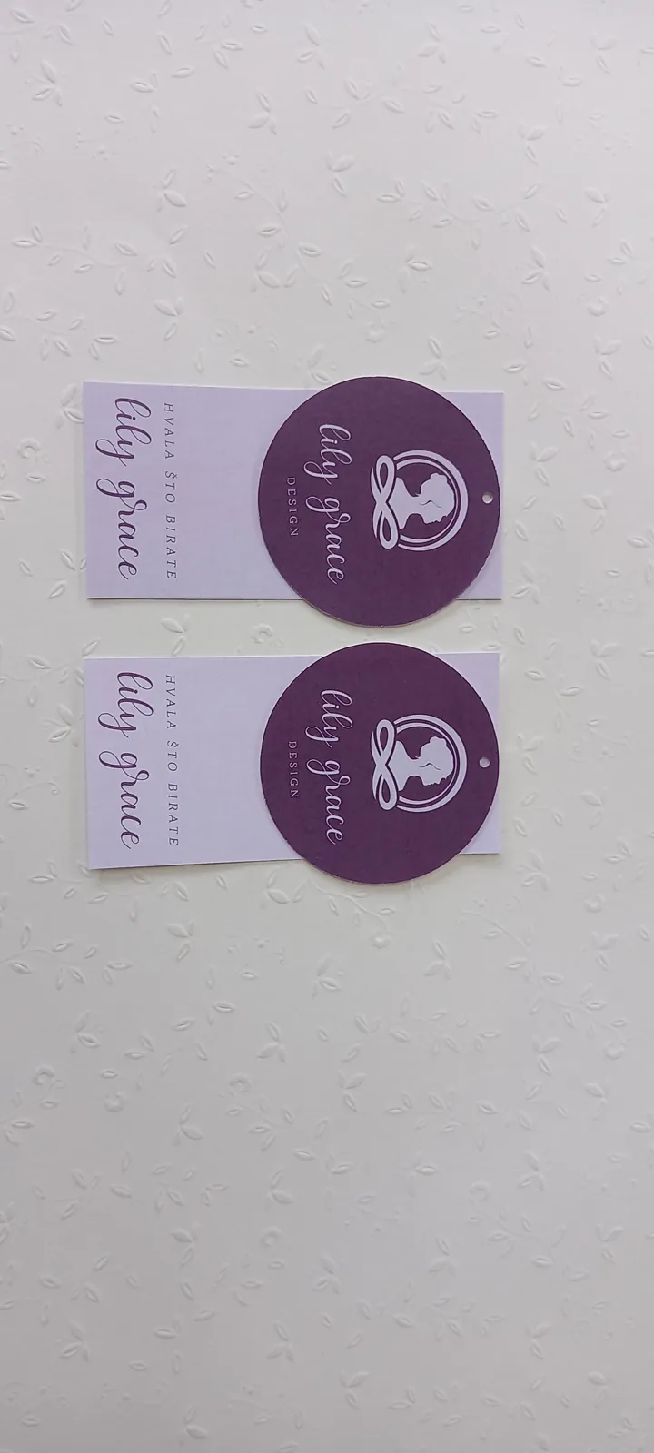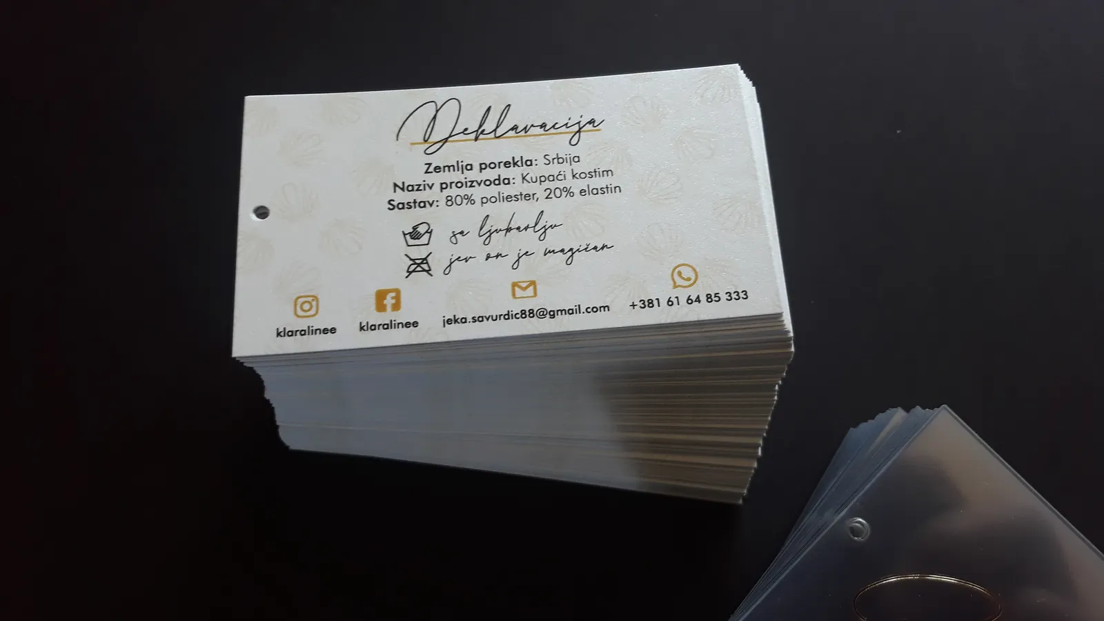 Štampa etiketa: male, velike, kružne, jednostavne, komplikovane...Izrađujemo etikete po želji klijenata za odeću, nakit, razne linije proizvoda. Najlepše su bile etikete urađene u zlatotisku na providnoj tanjoj plastici sa štampanom deklaracijom na sedefastom italijanskom papiru, naravno sa rupicom (foto 7-15), zatim etikete za modnu liniju svečanih haljina u rose gold foliotisku (foto 1-3; foto 22-24).