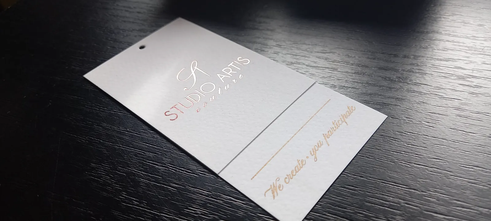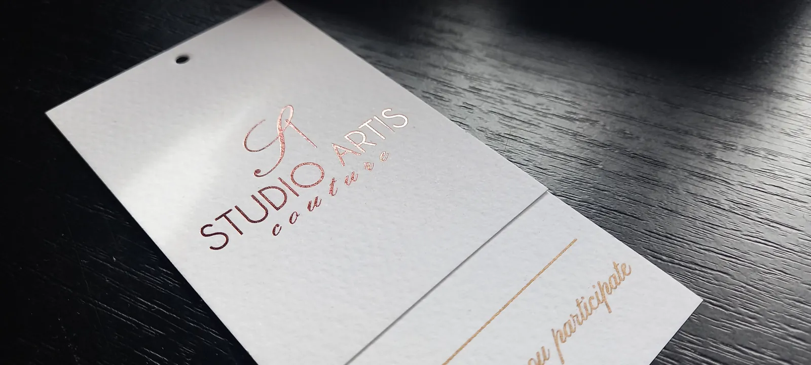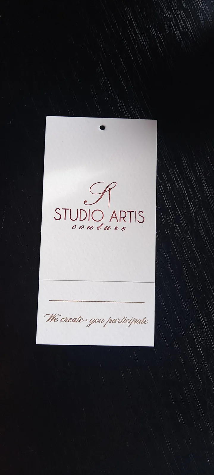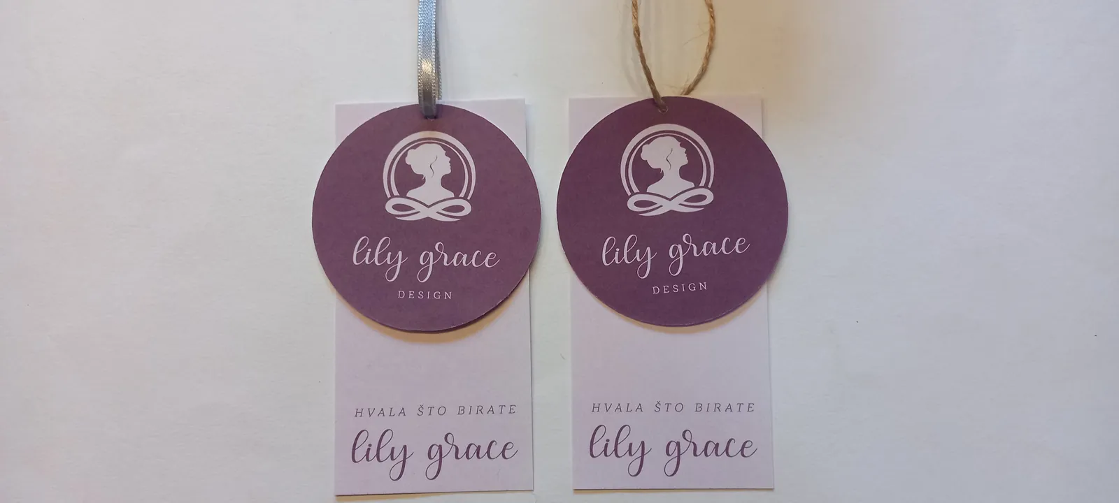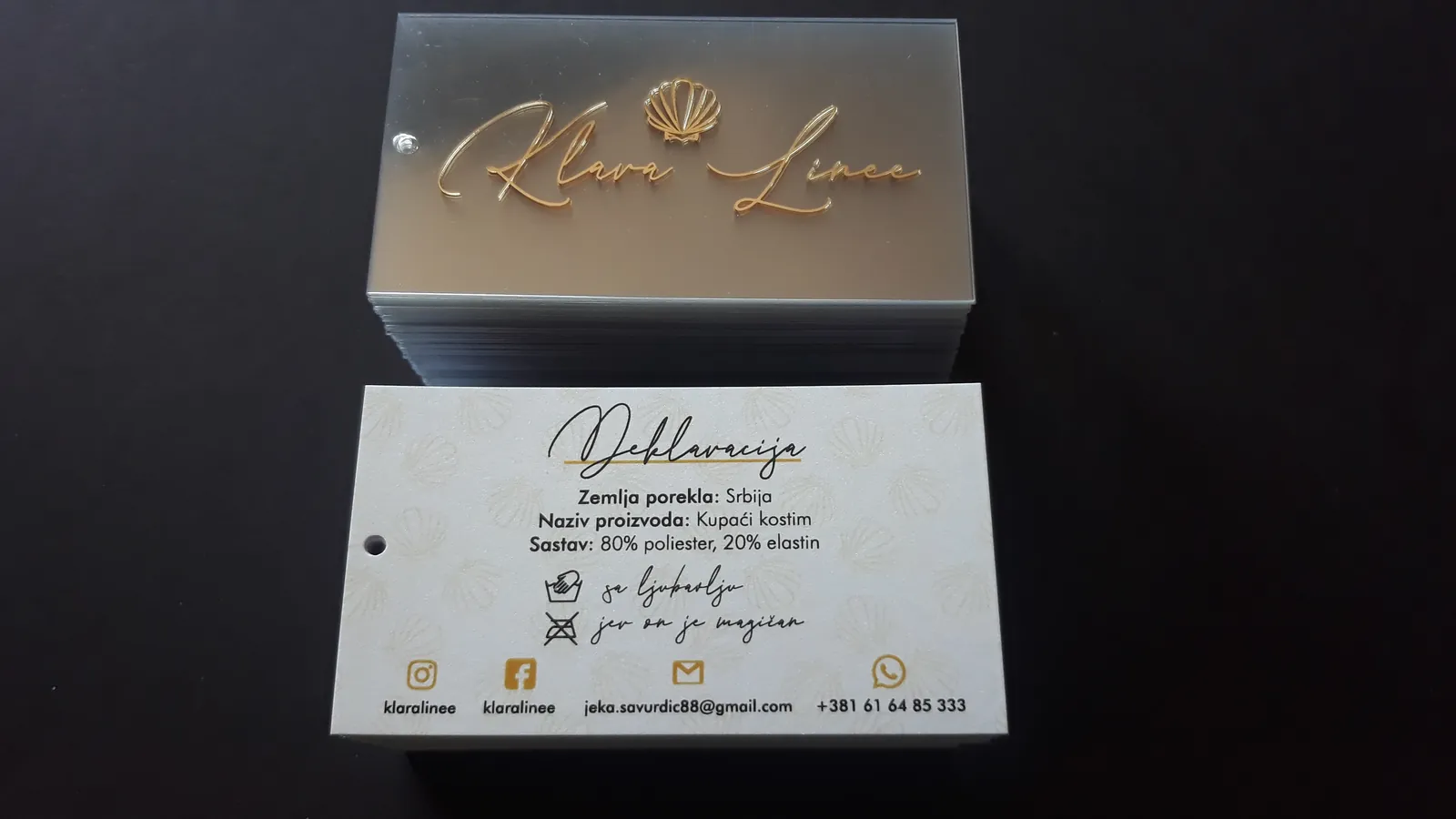 Štampa etiketa: male, velike, kružne, jednostavne, komplikovane...Izrađujemo etikete po želji klijenata za odeću, nakit, razne linije proizvoda. Najlepše su bile etikete urađene u zlatotisku na providnoj tanjoj plastici sa štampanom deklaracijom na sedefastom italijanskom papiru, naravno sa rupicom (foto 7-15), zatim etikete za modnu liniju svečanih haljina u rose gold foliotisku (foto 1-3; foto 22-24).