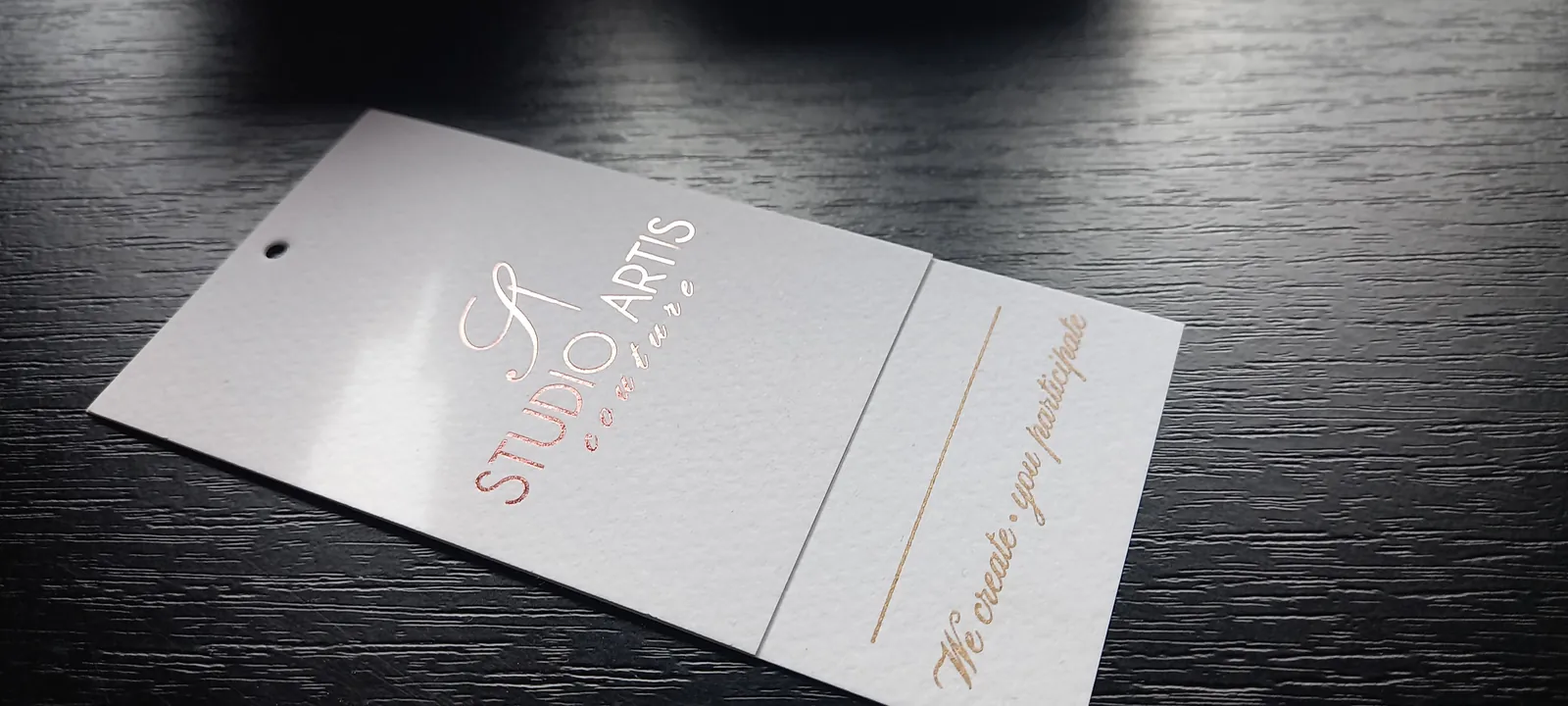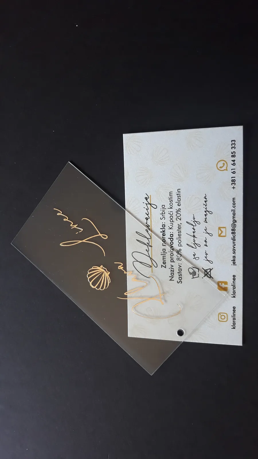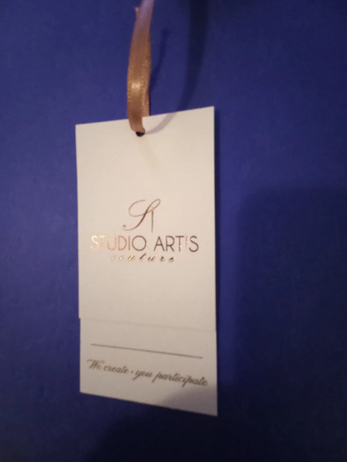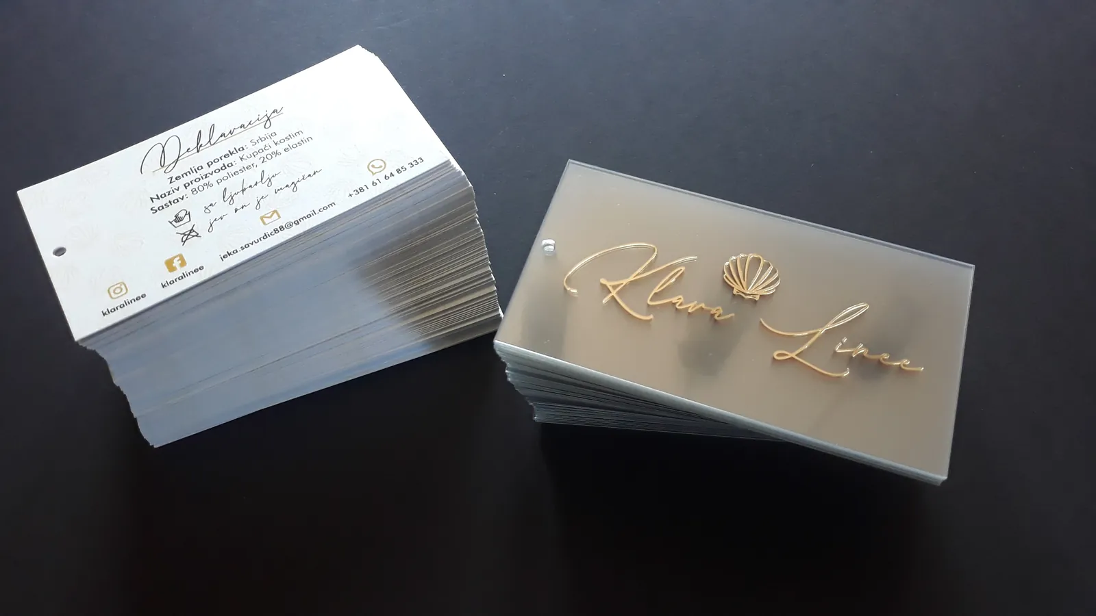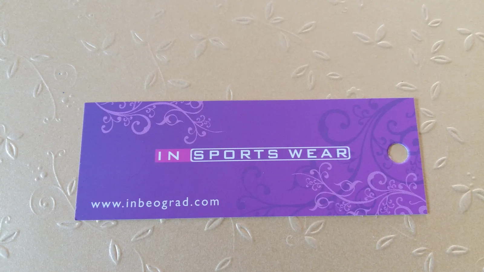 Štampa etiketa: male, velike, kružne, jednostavne, komplikovane...Izrađujemo etikete po želji klijenata za odeću, nakit, razne linije proizvoda. Najlepše su bile etikete urađene u zlatotisku na providnoj tanjoj plastici sa štampanom deklaracijom na sedefastom italijanskom papiru, naravno sa rupicom (foto 7-15), zatim etikete za modnu liniju svečanih haljina u rose gold foliotisku (foto 1-3; foto 22-24).