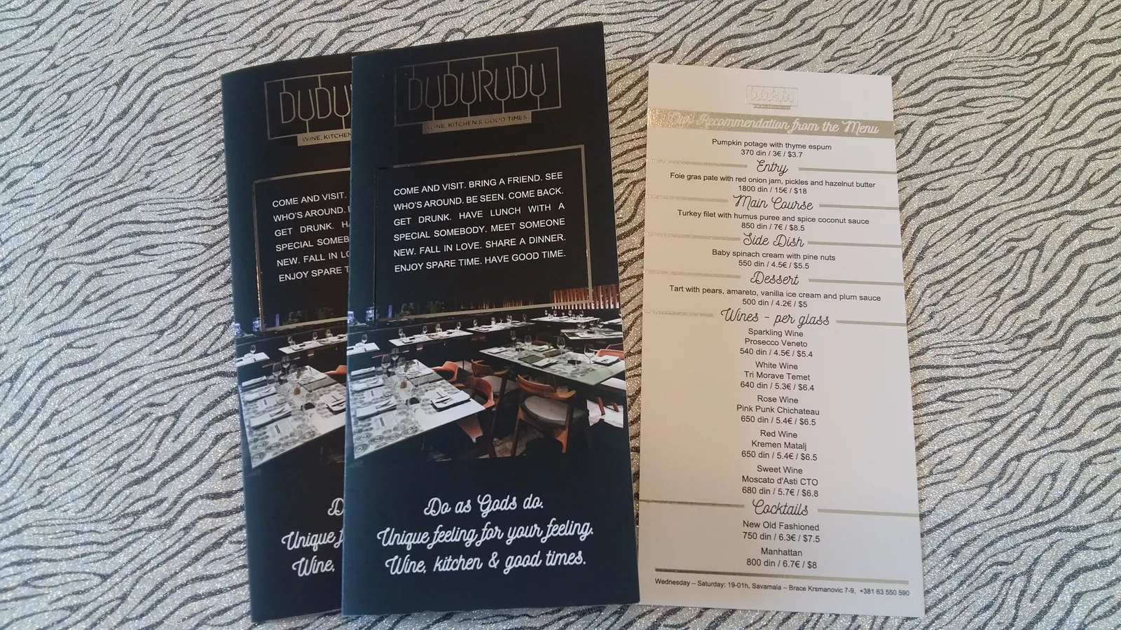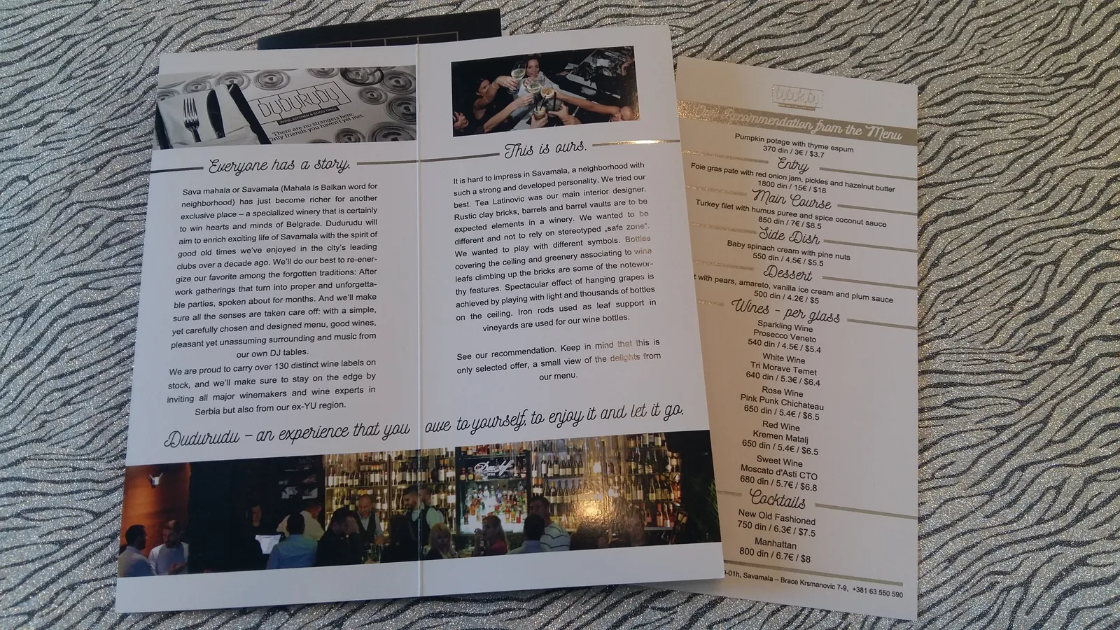 Izrada ekskluzivnih menija ili jelovnika za restorane, u standarnim tehnikama štampe ili sa detaljima u srebrotisku/ zlatotisku (foto 1-7). Radimo i plastifikaciju jelovnika radi dužeg trajanja jer se često uzima u ruke.
