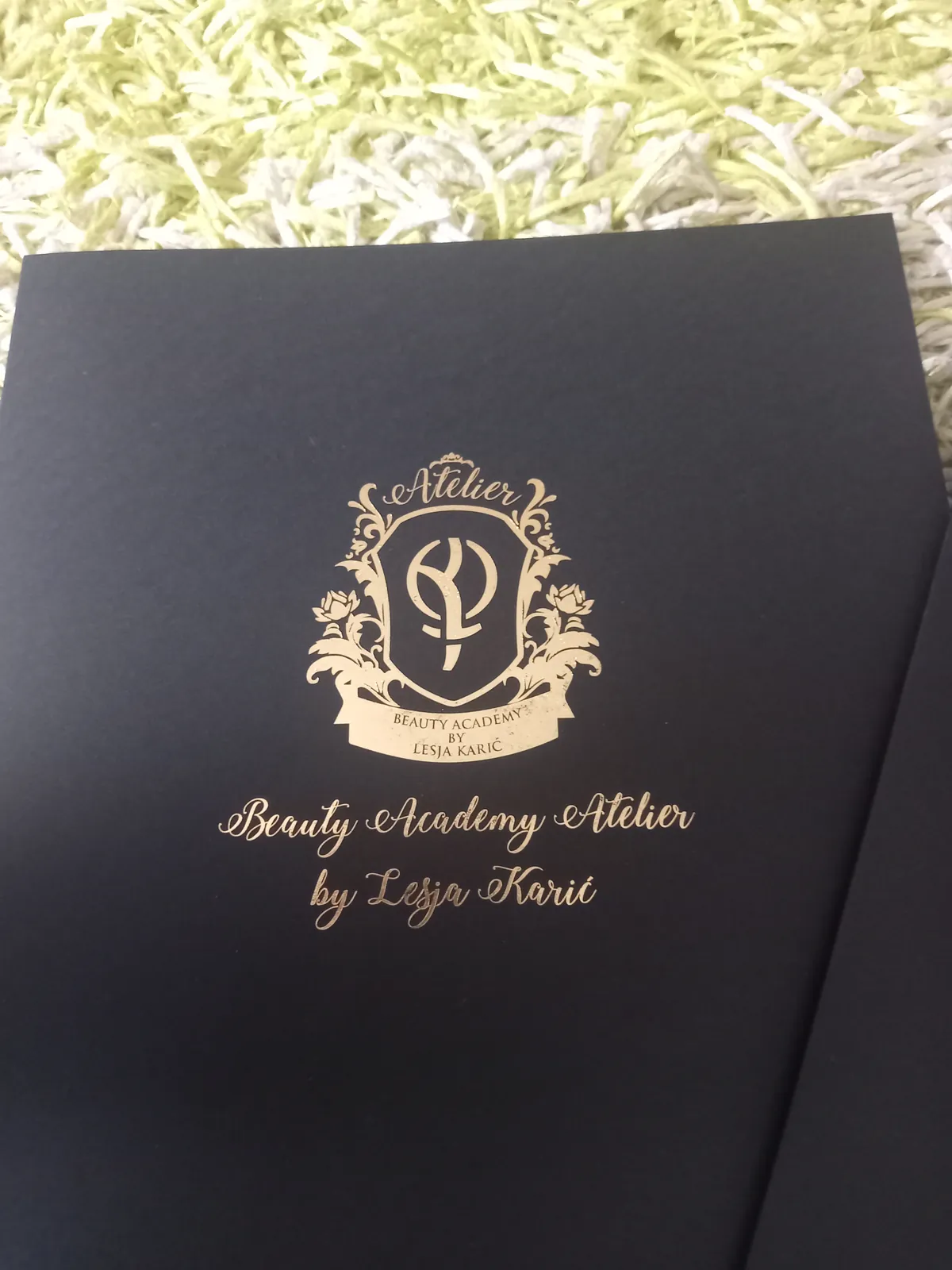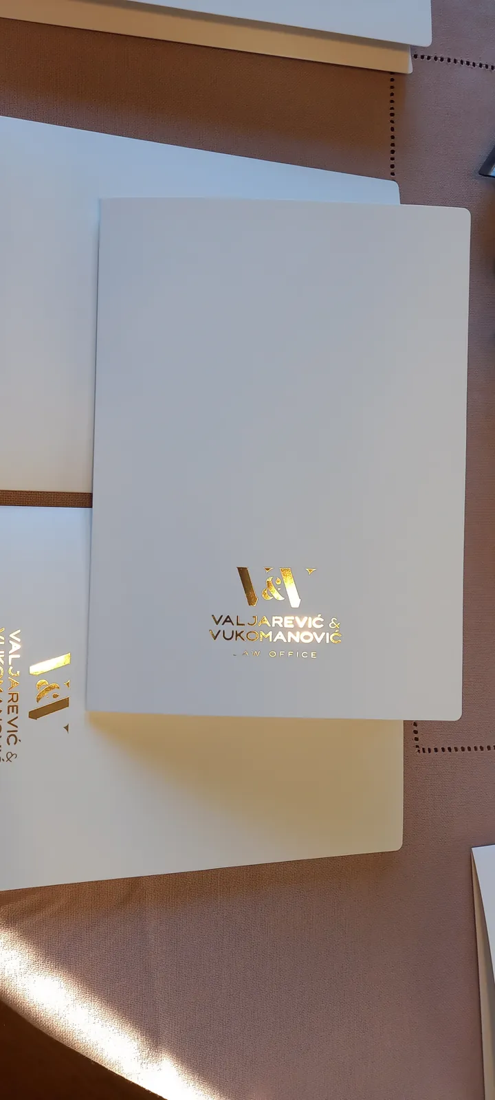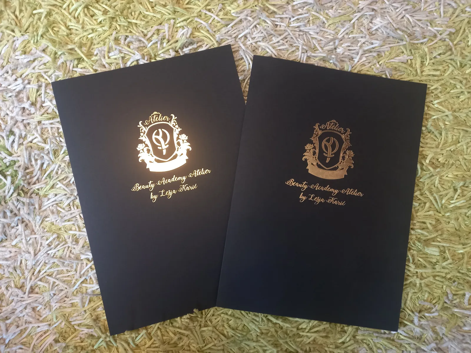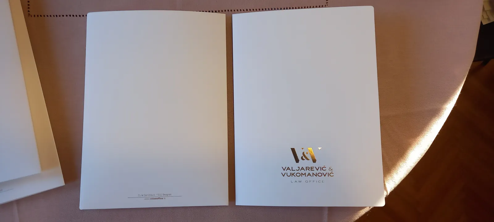Izrađujemo fascikle malo svečanije i luksuznije nego što to drugi rade. Kod nas možete poručiti fascikle od specijalnog italijanskog papira, koje su dosta čvršće i kvalitetnije od fascikli koje se mogu kupiti po knjižarama. Radili smo luksuzne fascikle od crnog italijanskog papira sa logom u foliotisku u 2 boje plavoj i beloj za renomiranu advokatsku kancelariju (foto 1-6).