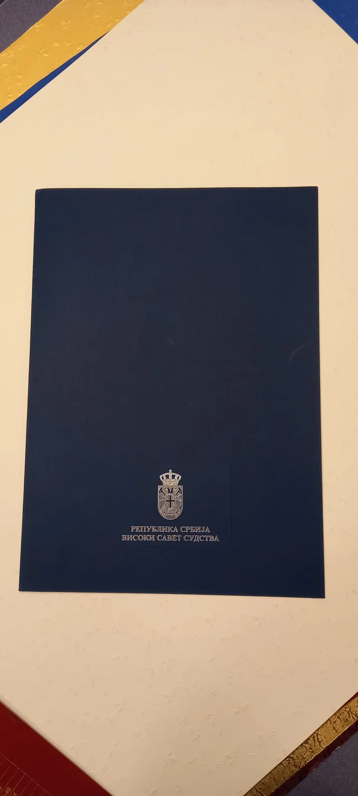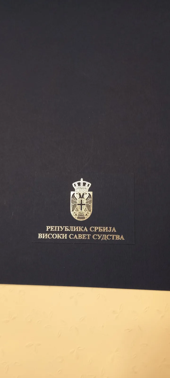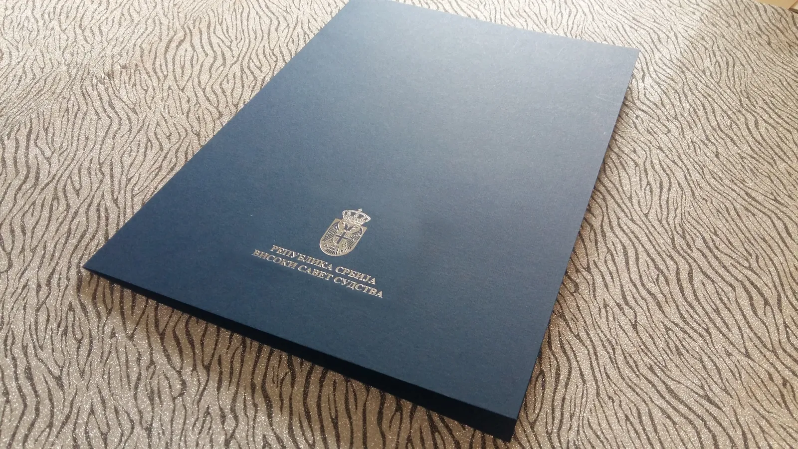 Radimo često fascikle sa zlatotiskom, za Visoki savet sudstva od teget papira sa srebrotiskom (foto 19-21) fascikle od crnog italijanskog papira sa zlatotiskom (foto 13-15; foto 49-51); fascikle od zelenog papira sa zlatotiskom (foto 22-27) .