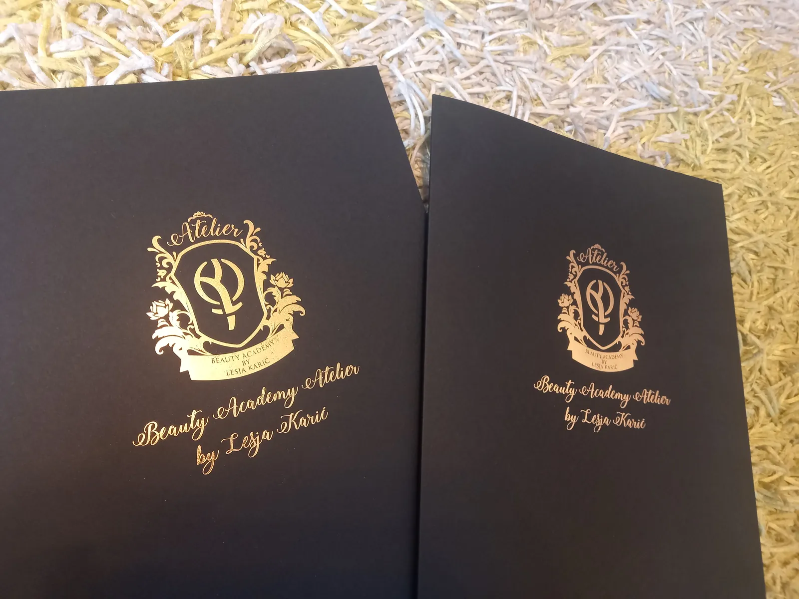 Kod nas je moguće uraditi i fascikle sa lastižom koje smo radili u beloj boji sa mat plastifikacijom i logom u zlatotisku (foto 8-12; foto 37-39), zatim sa logom u crnom foliotisku (foto 40-45) .
