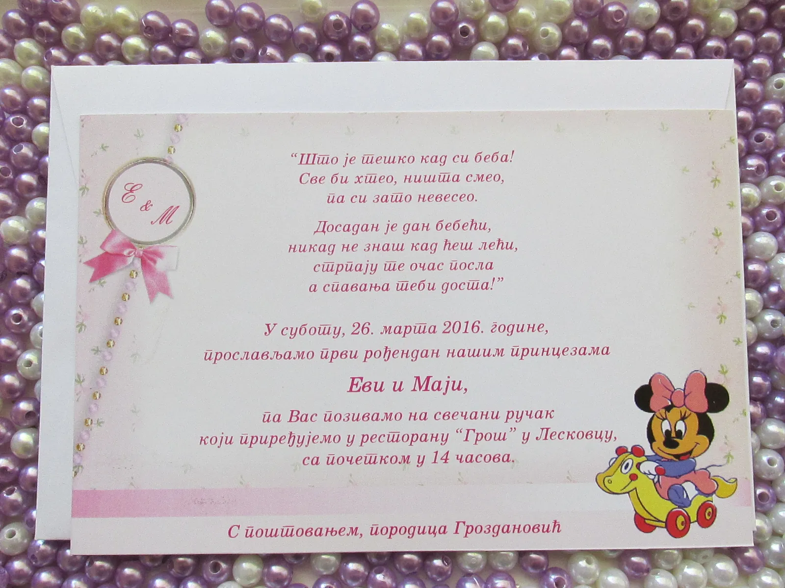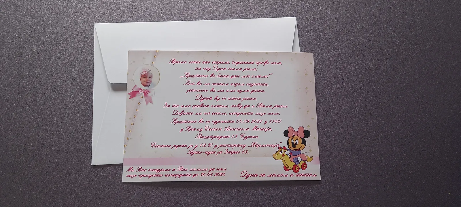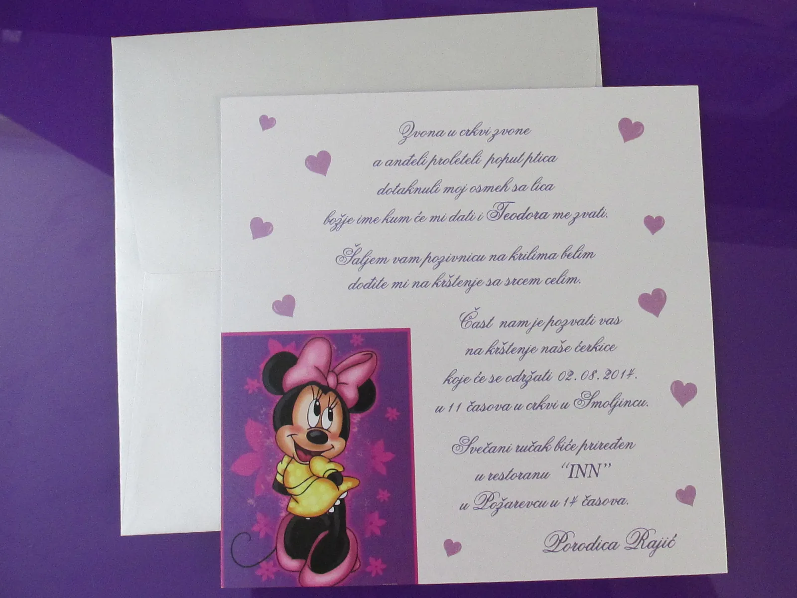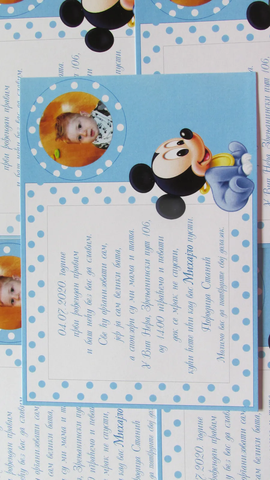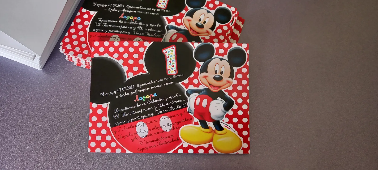 Povoljne pozivnice za proslavu prvog rođendana ili krštenja devojčica i dečaka sa motivima Diznijevih junaka, Minnie Mouse, Mickey Mouse, Winnie Pooh, Stič, Pepa Prase, Mala sirena, Šilja, princeza Sofija, Cars, kamiončići, Patrolne šape, Spiderman, životinjice iz prašume, bubamare...sve što vaše dete voli, može biti na pozivnici. Sve ove pozivnice mogu biti u štampanoj formi ili u ELEKTRONSKOJ FORMI sa vašim tekstom za pozivanje gostiju preko Vibera ili WhatsApp-a. Sve pozivnice mogu biti urađene na jednoj strani ili da se otvaraju, takođe na svakoj se može dodati fotografija vašeg deteta. Možete naručiti pozivnice sa kovertom u beloj ili nekoj boji po želji, ili bez koverte.