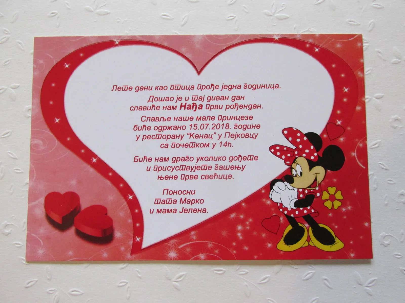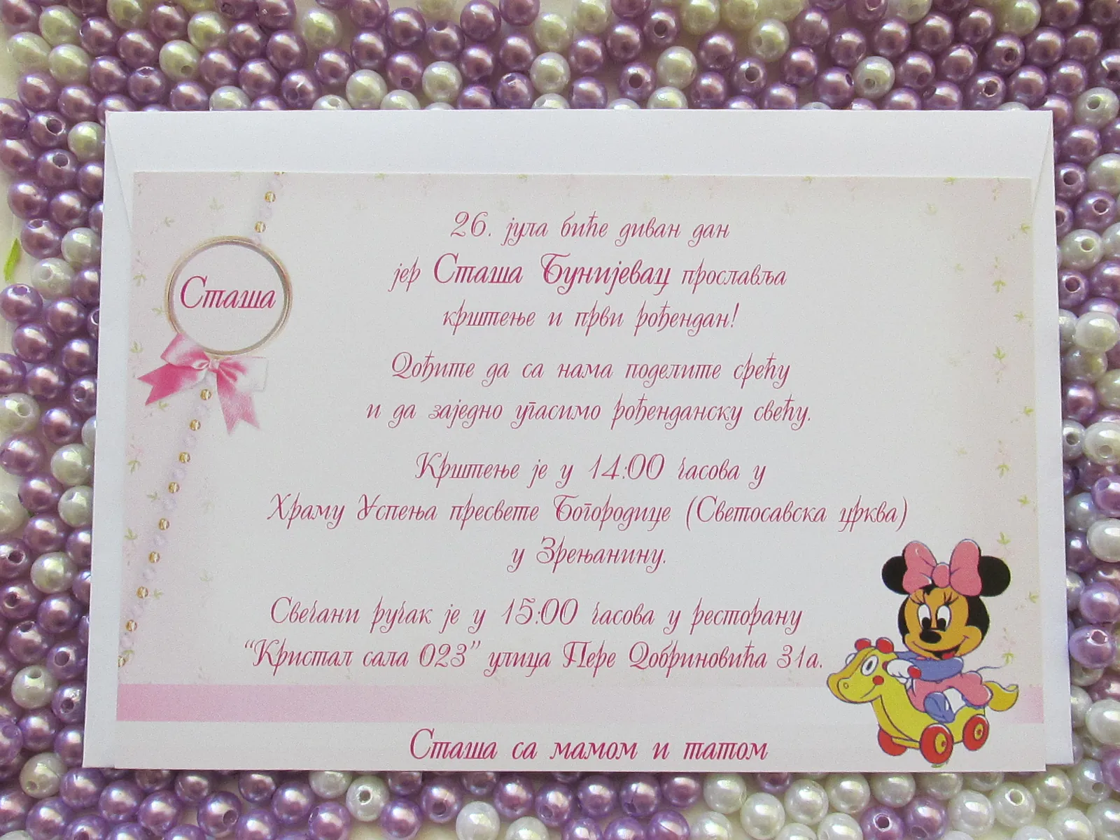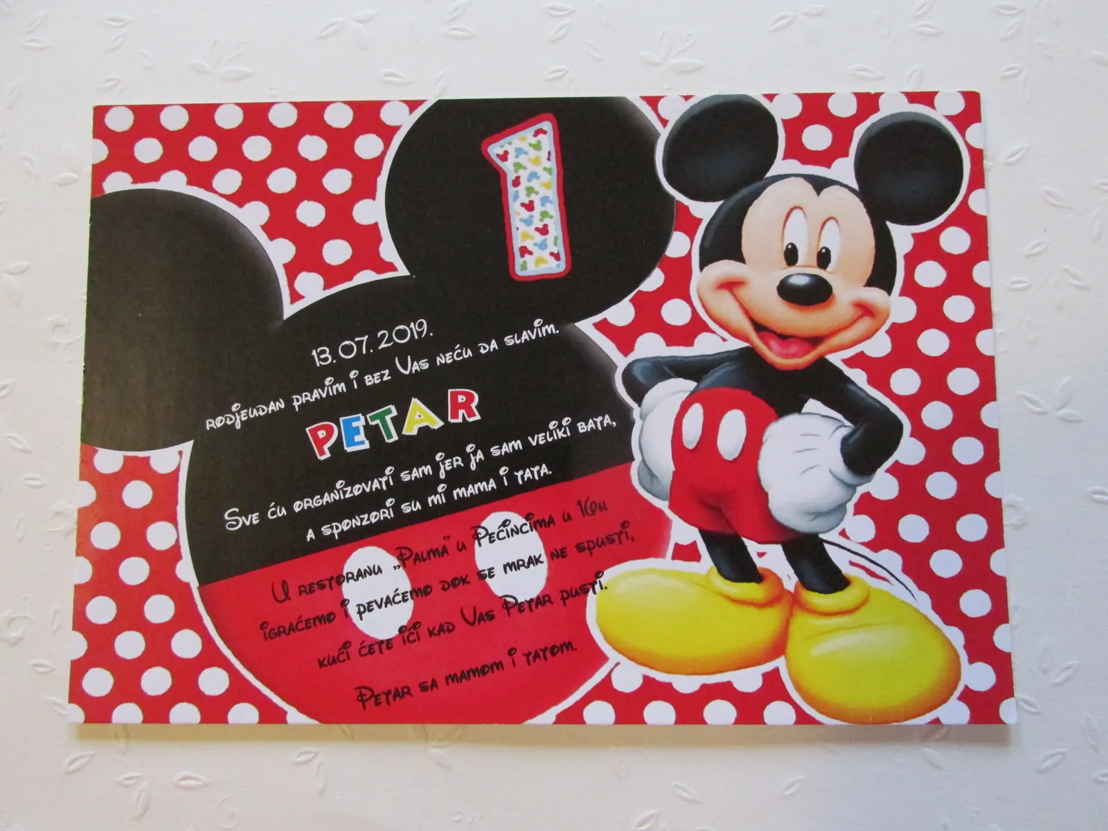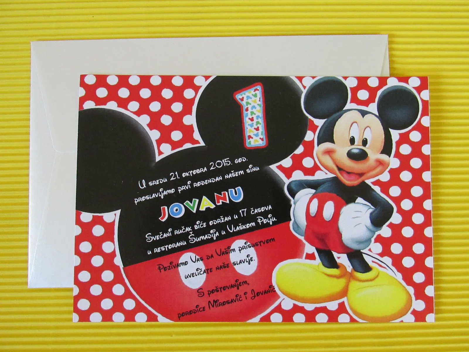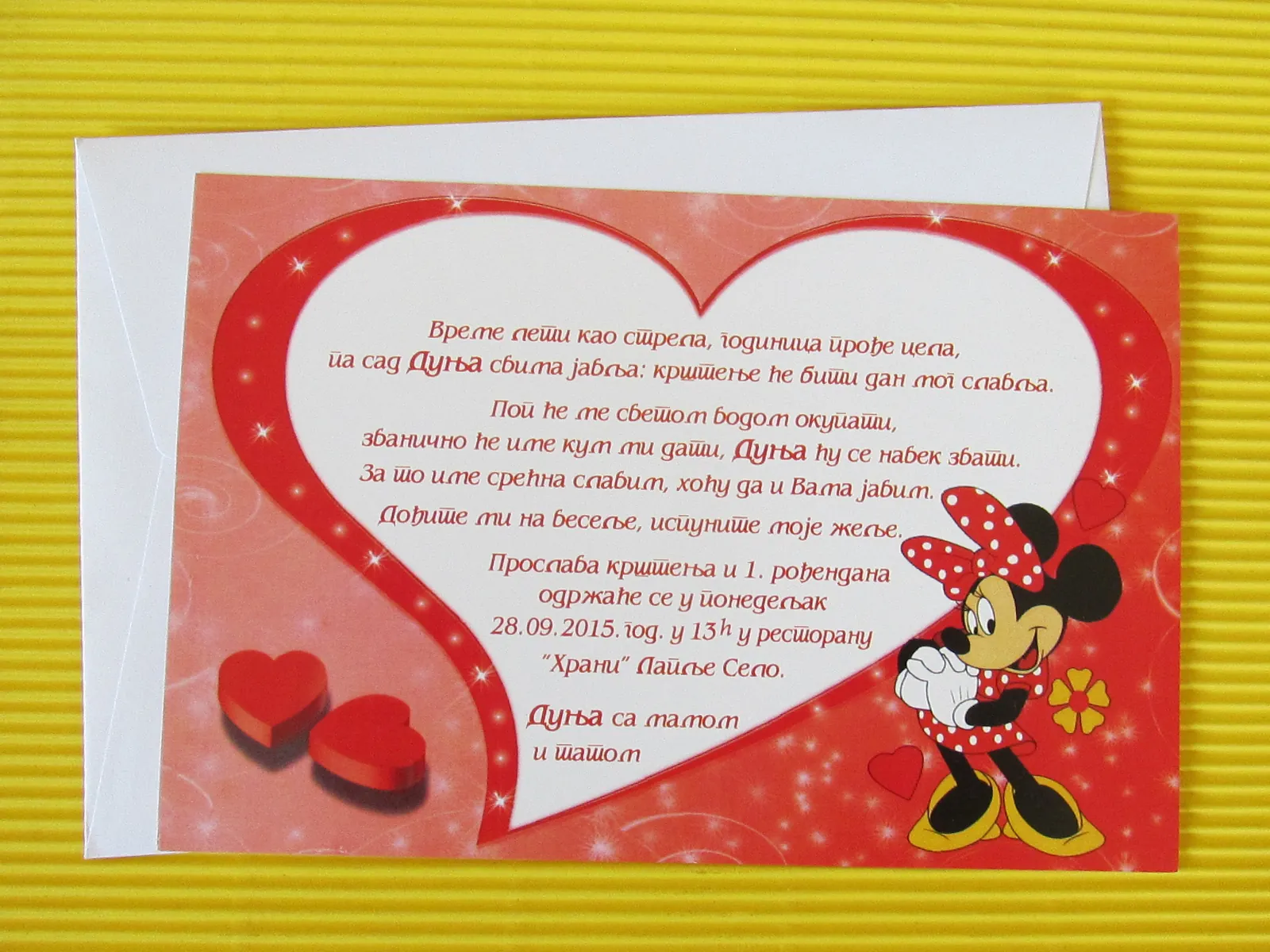 Povoljne pozivnice za proslavu prvog rođendana ili krštenja devojčica i dečaka sa motivima Diznijevih junaka, Minnie Mouse, Mickey Mouse, Winnie Pooh, Stič, Pepa Prase, Mala sirena, Šilja, princeza Sofija, Cars, kamiončići, Patrolne šape, Spiderman, životinjice iz prašume, bubamare...sve što vaše dete voli, može biti na pozivnici. Sve ove pozivnice mogu biti u štampanoj formi ili u ELEKTRONSKOJ FORMI sa vašim tekstom za pozivanje gostiju preko Vibera ili WhatsApp-a. Sve pozivnice mogu biti urađene na jednoj strani ili da se otvaraju, takođe na svakoj se može dodati fotografija vašeg deteta. Možete naručiti pozivnice sa kovertom u beloj ili nekoj boji po želji, ili bez koverte.