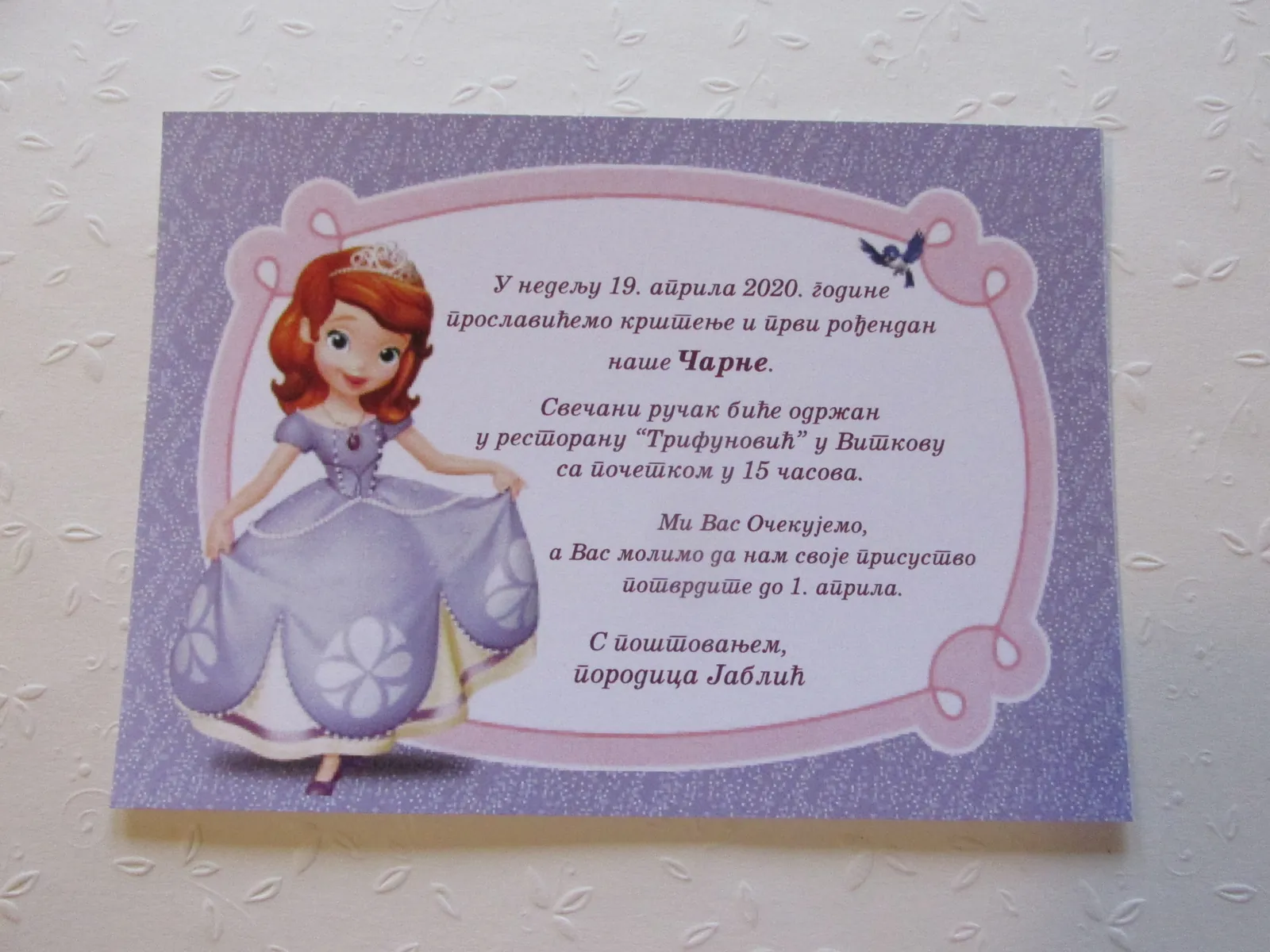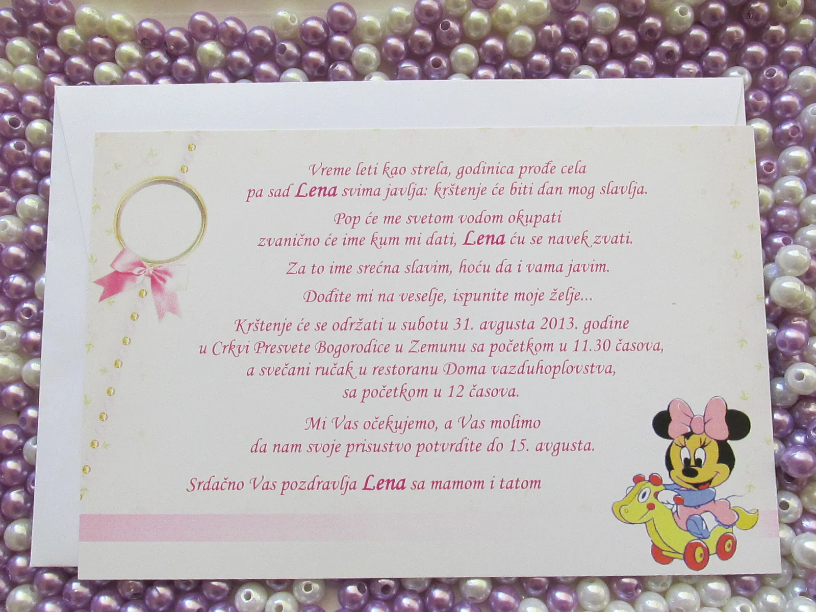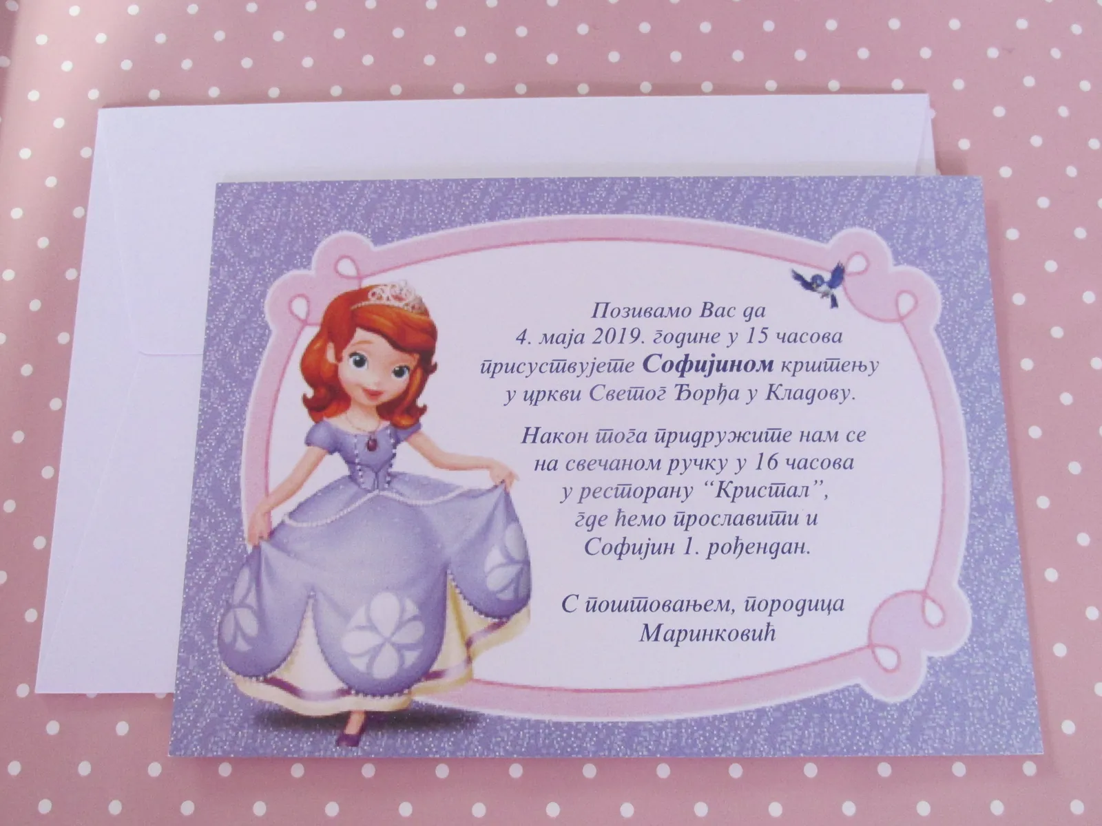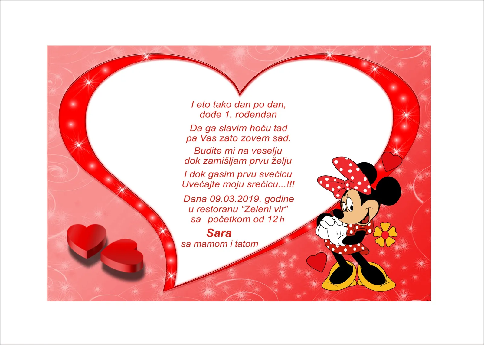 Povoljne pozivnice za proslavu prvog rođendana ili krštenja devojčica i dečaka sa motivima Diznijevih junaka, Minnie Mouse, Mickey Mouse, Winnie Pooh, Stič, Pepa Prase, Mala sirena, Šilja, princeza Sofija, Cars, kamiončići, Patrolne šape, Spiderman, životinjice iz prašume, bubamare...sve što vaše dete voli, može biti na pozivnici. Sve ove pozivnice mogu biti u štampanoj formi ili u ELEKTRONSKOJ FORMI sa vašim tekstom za pozivanje gostiju preko Vibera ili WhatsApp-a. Sve pozivnice mogu biti urađene na jednoj strani ili da se otvaraju, takođe na svakoj se može dodati fotografija vašeg deteta. Možete naručiti pozivnice sa kovertom u beloj ili nekoj boji po želji, ili bez koverte.