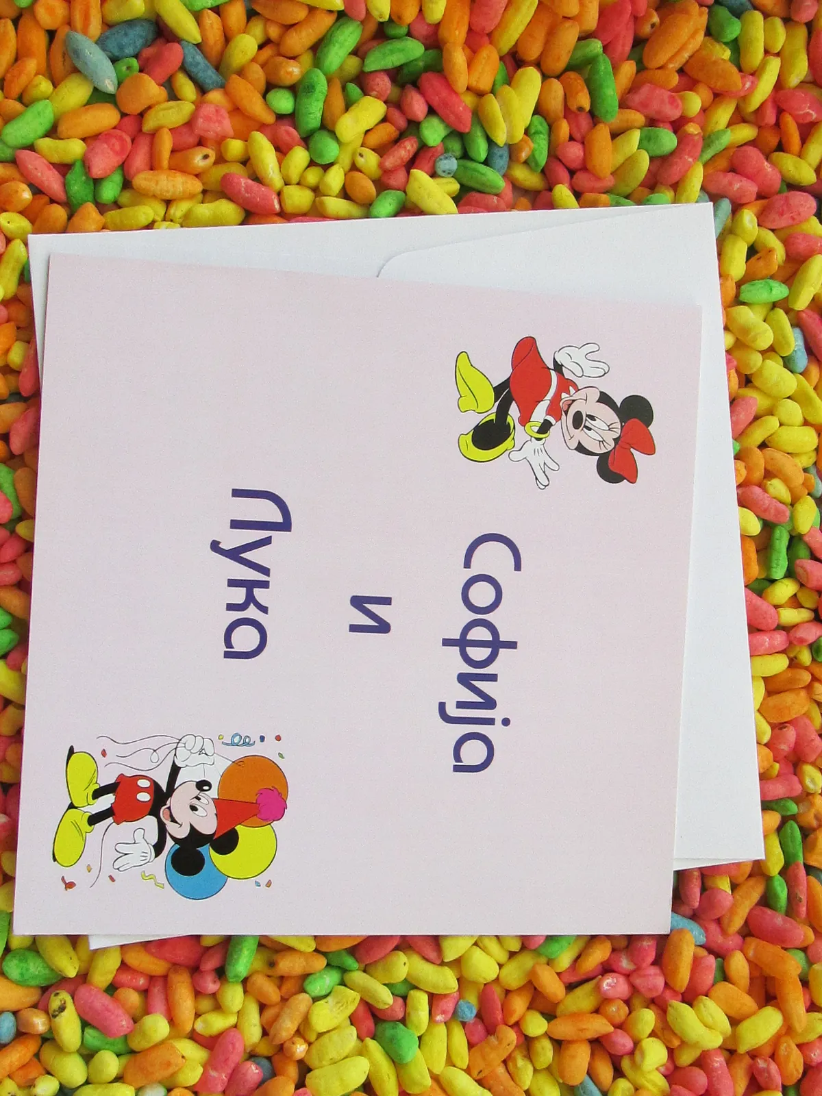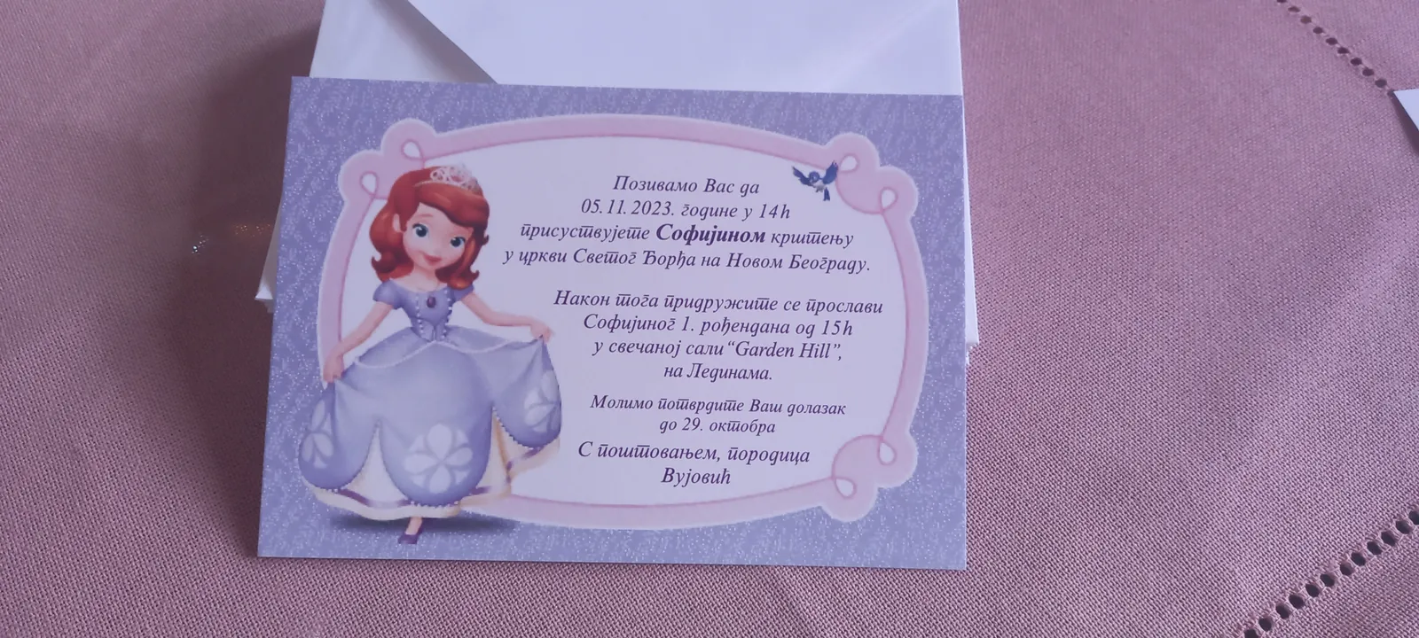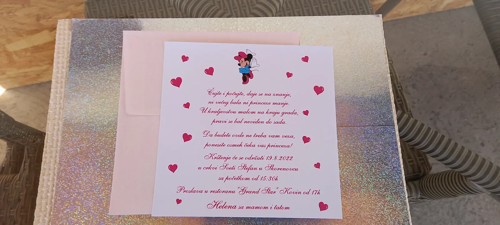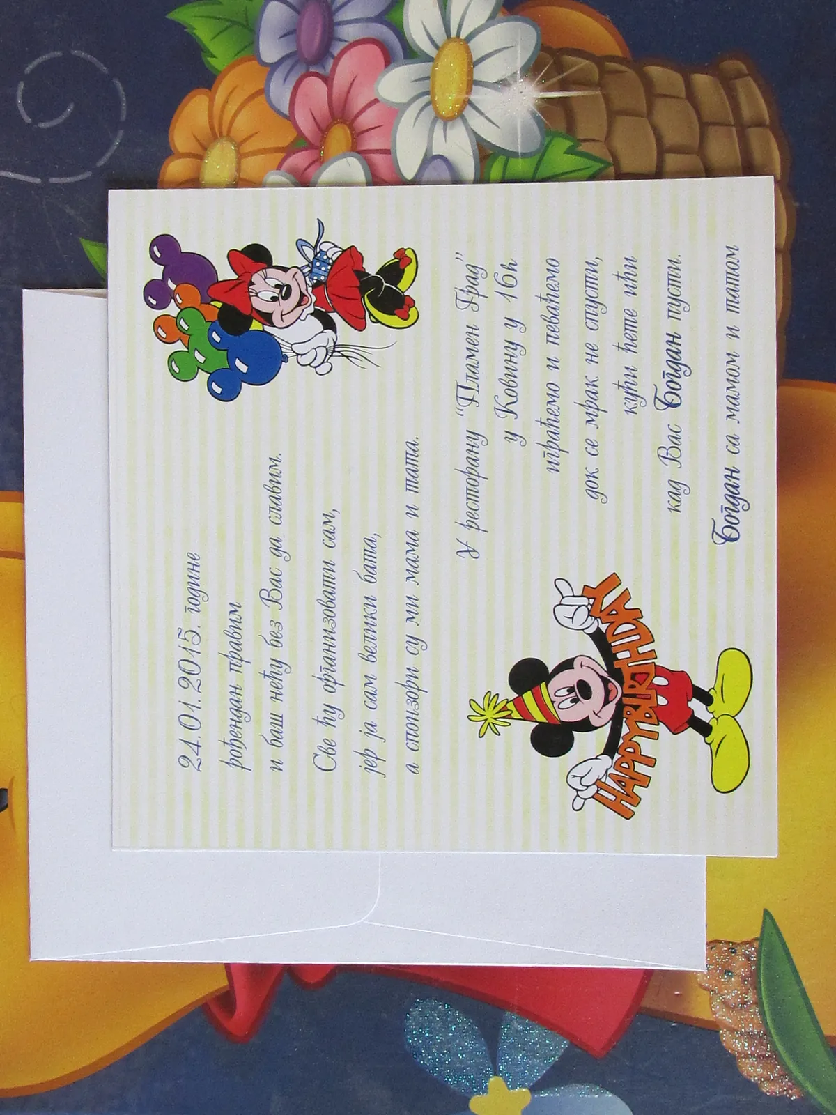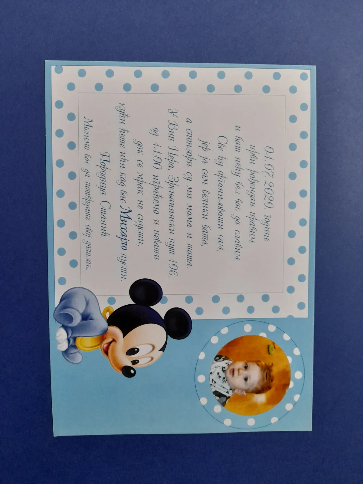 Povoljne pozivnice za proslavu prvog rođendana ili krštenja devojčica i dečaka sa motivima Diznijevih junaka, Minnie Mouse, Mickey Mouse, Winnie Pooh, Stič, Pepa Prase, Mala sirena, Šilja, princeza Sofija, Cars, kamiončići, Patrolne šape, Spiderman, životinjice iz prašume, bubamare...sve što vaše dete voli, može biti na pozivnici. Sve ove pozivnice mogu biti u štampanoj formi ili u ELEKTRONSKOJ FORMI sa vašim tekstom za pozivanje gostiju preko Vibera ili WhatsApp-a. Sve pozivnice mogu biti urađene na jednoj strani ili da se otvaraju, takođe na svakoj se može dodati fotografija vašeg deteta. Možete naručiti pozivnice sa kovertom u beloj ili nekoj boji po želji, ili bez koverte.