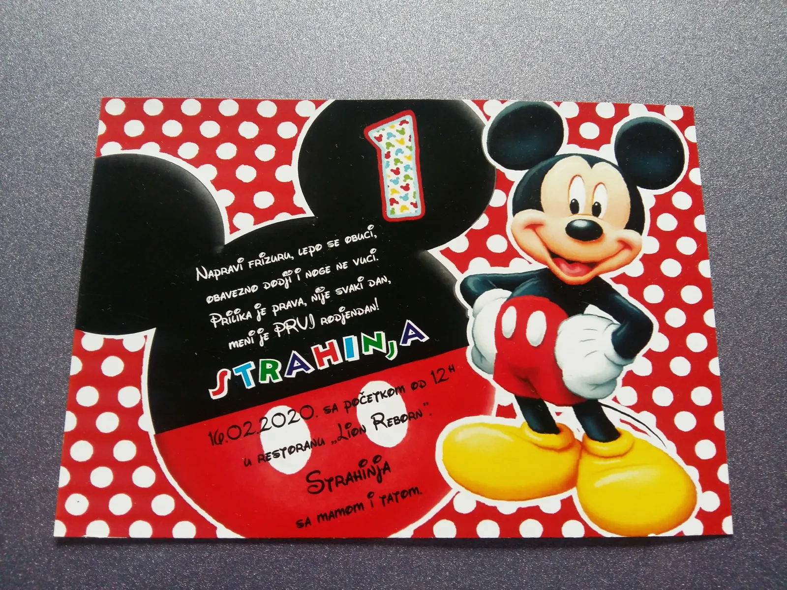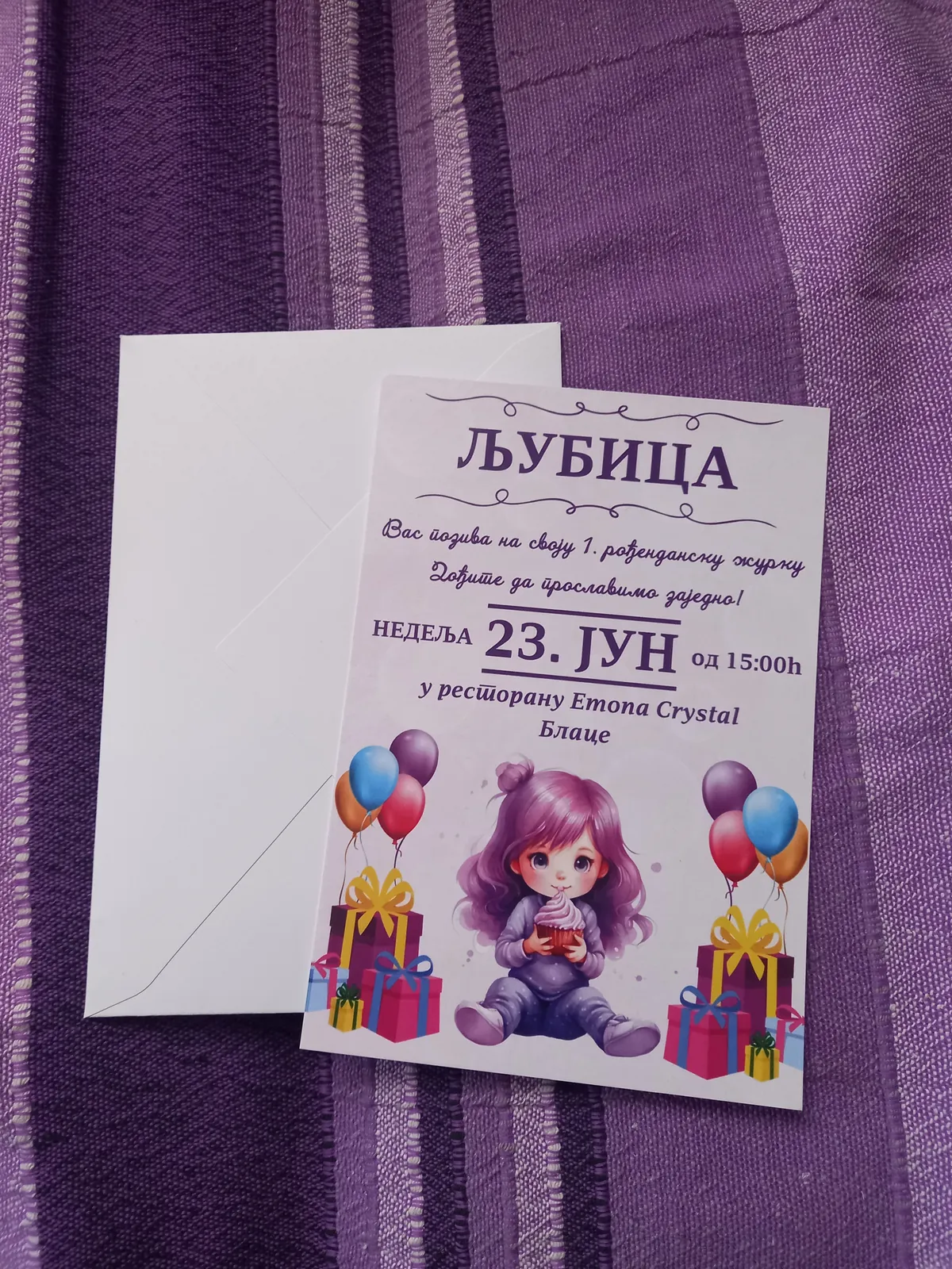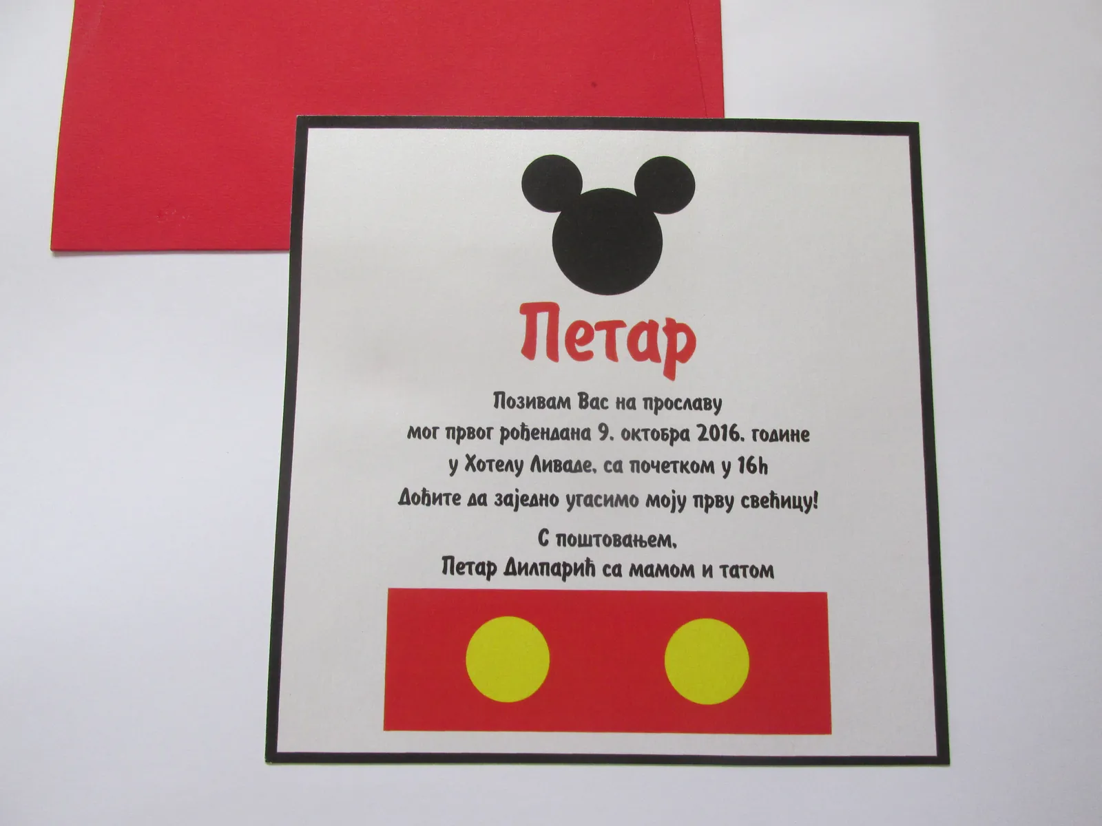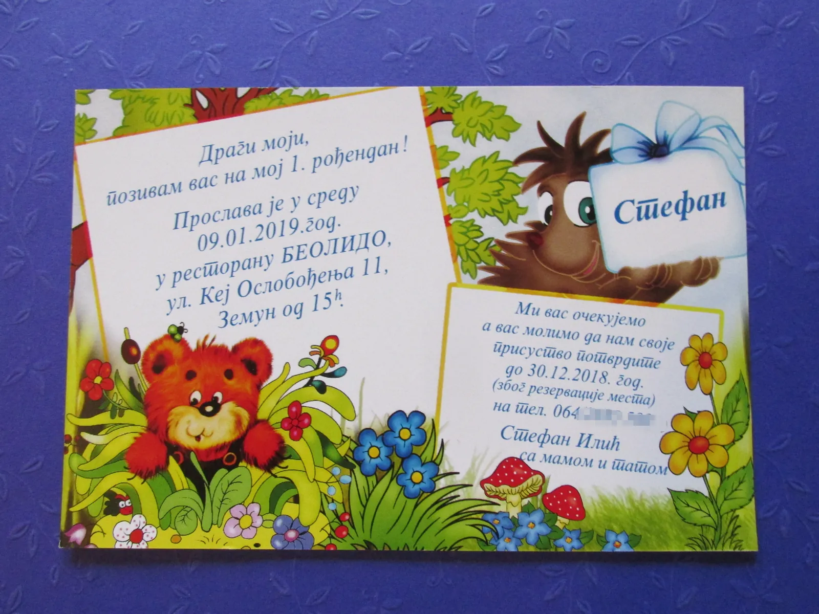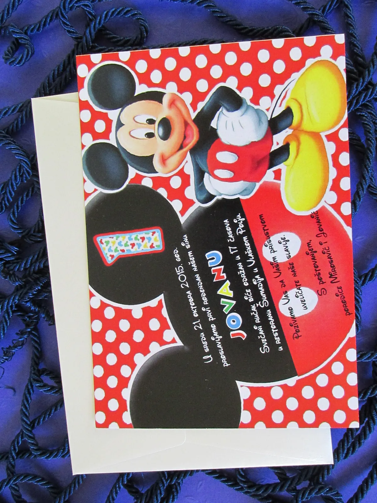 Povoljne pozivnice za proslavu prvog rođendana ili krštenja devojčica i dečaka sa motivima Diznijevih junaka, Minnie Mouse, Mickey Mouse, Winnie Pooh, Stič, Pepa Prase, Mala sirena, Šilja, princeza Sofija, Cars, kamiončići, Patrolne šape, Spiderman, životinjice iz prašume, bubamare...sve što vaše dete voli, može biti na pozivnici. Sve ove pozivnice mogu biti u štampanoj formi ili u ELEKTRONSKOJ FORMI sa vašim tekstom za pozivanje gostiju preko Vibera ili WhatsApp-a. Sve pozivnice mogu biti urađene na jednoj strani ili da se otvaraju, takođe na svakoj se može dodati fotografija vašeg deteta. Možete naručiti pozivnice sa kovertom u beloj ili nekoj boji po želji, ili bez koverte.
