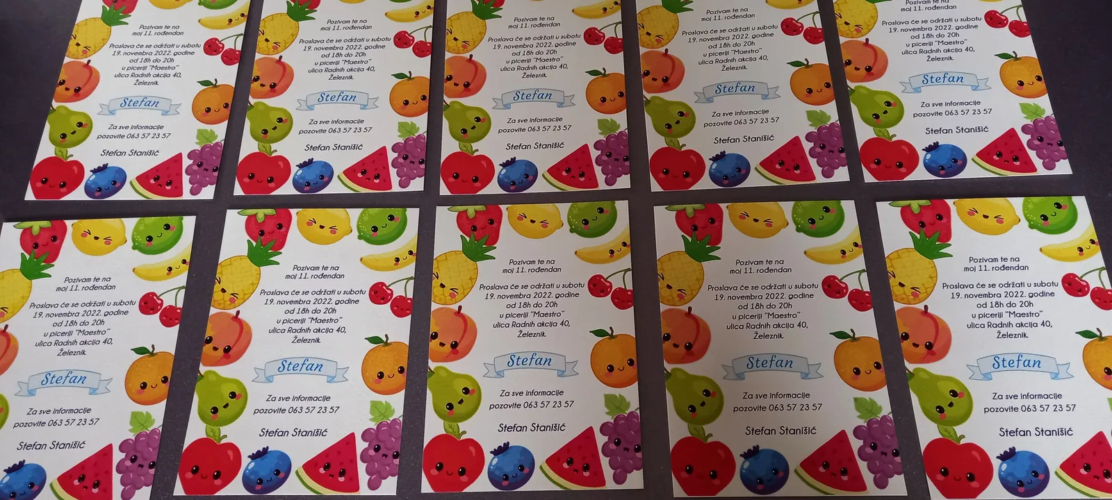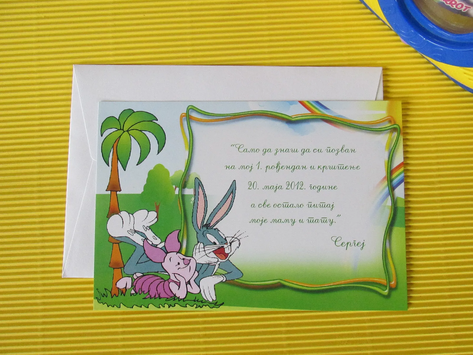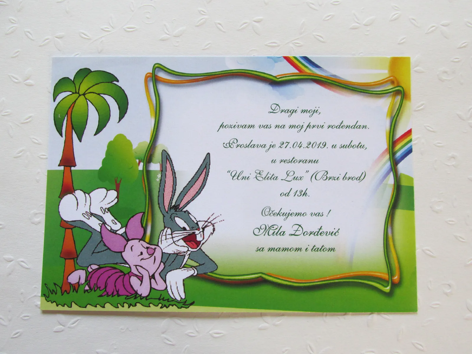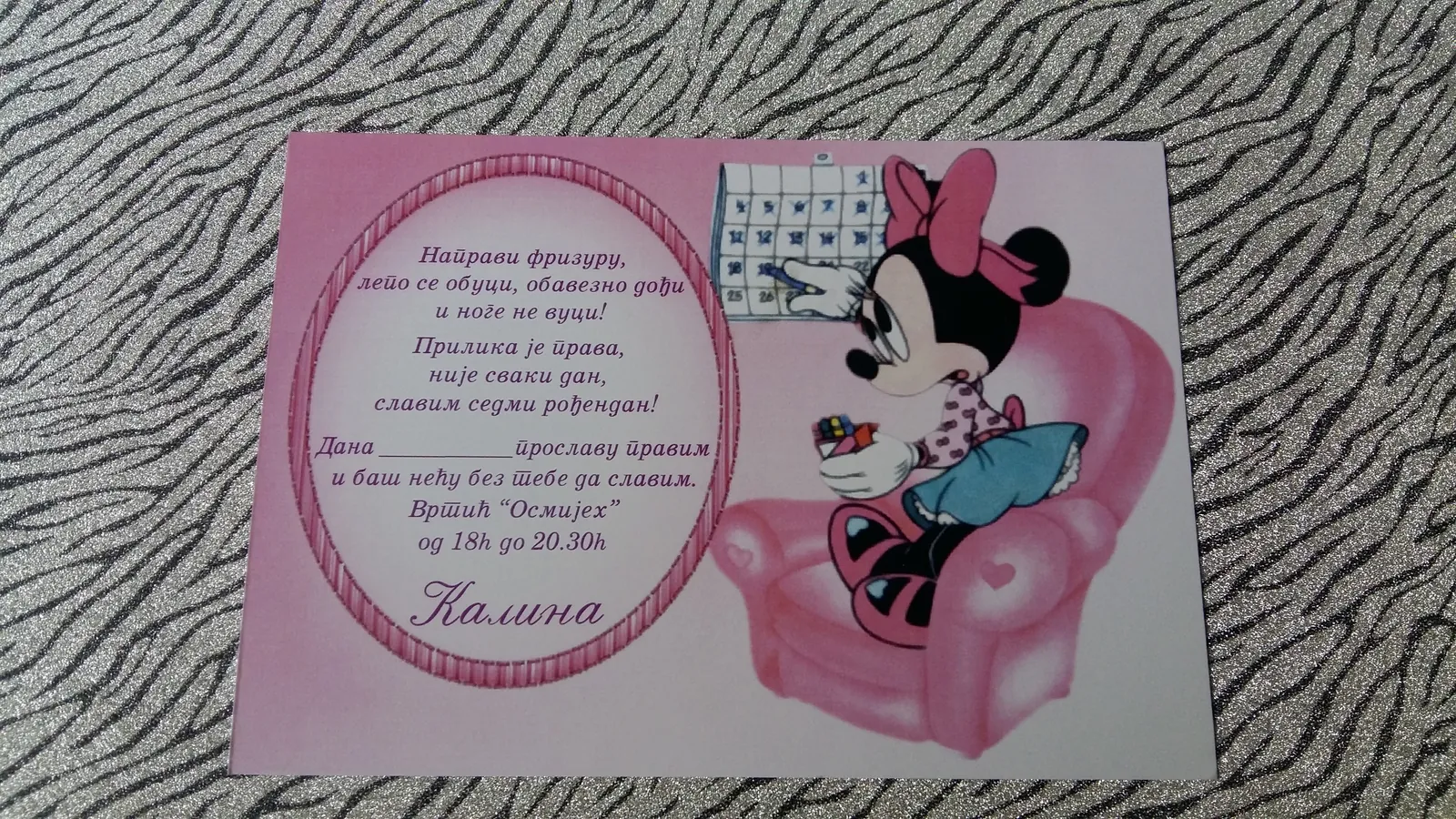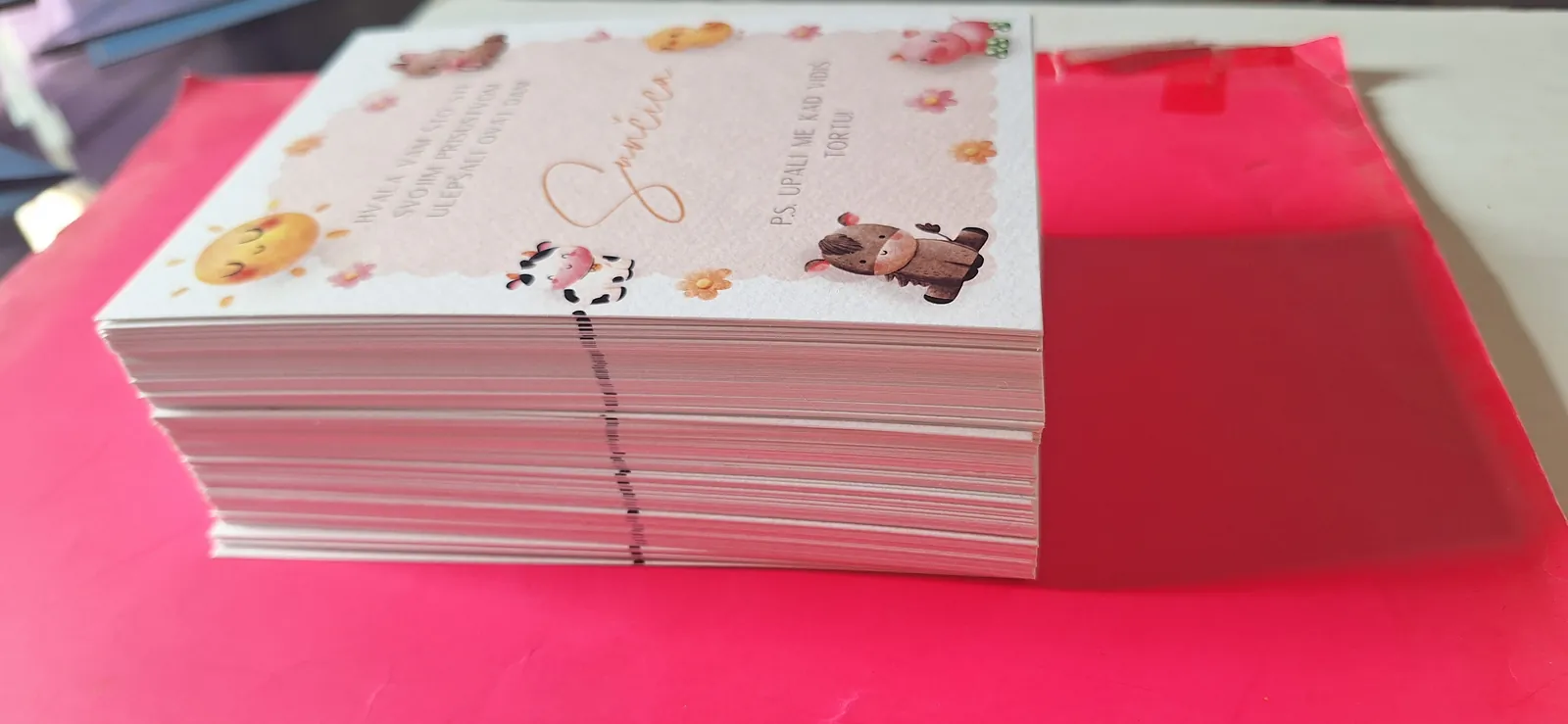 Povoljne pozivnice za proslavu prvog rođendana ili krštenja devojčica i dečaka sa motivima Diznijevih junaka, Minnie Mouse, Mickey Mouse, Winnie Pooh, Stič, Pepa Prase, Mala sirena, Šilja, princeza Sofija, Cars, kamiončići, Patrolne šape, Spiderman, životinjice iz prašume, bubamare...sve što vaše dete voli, može biti na pozivnici. Sve ove pozivnice mogu biti u štampanoj formi ili u ELEKTRONSKOJ FORMI sa vašim tekstom za pozivanje gostiju preko Vibera ili WhatsApp-a. Sve pozivnice mogu biti urađene na jednoj strani ili da se otvaraju, takođe na svakoj se može dodati fotografija vašeg deteta. Možete naručiti pozivnice sa kovertom u beloj ili nekoj boji po želji, ili bez koverte.