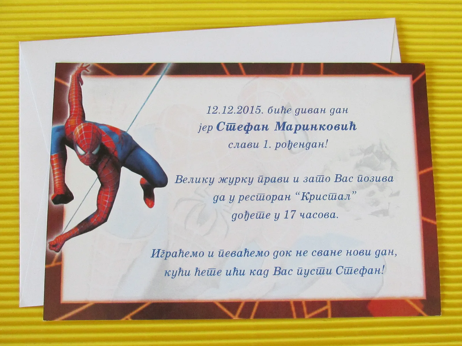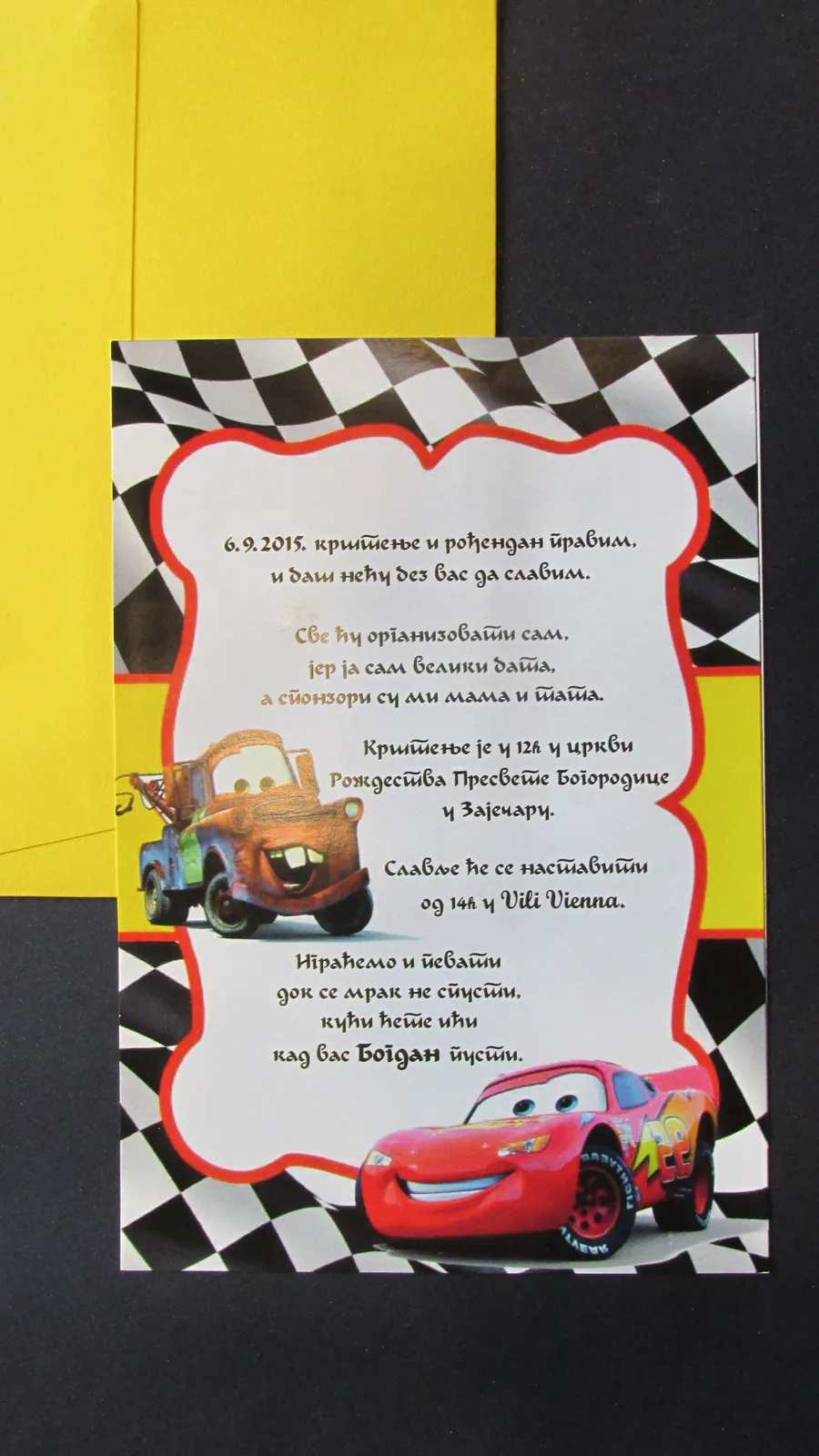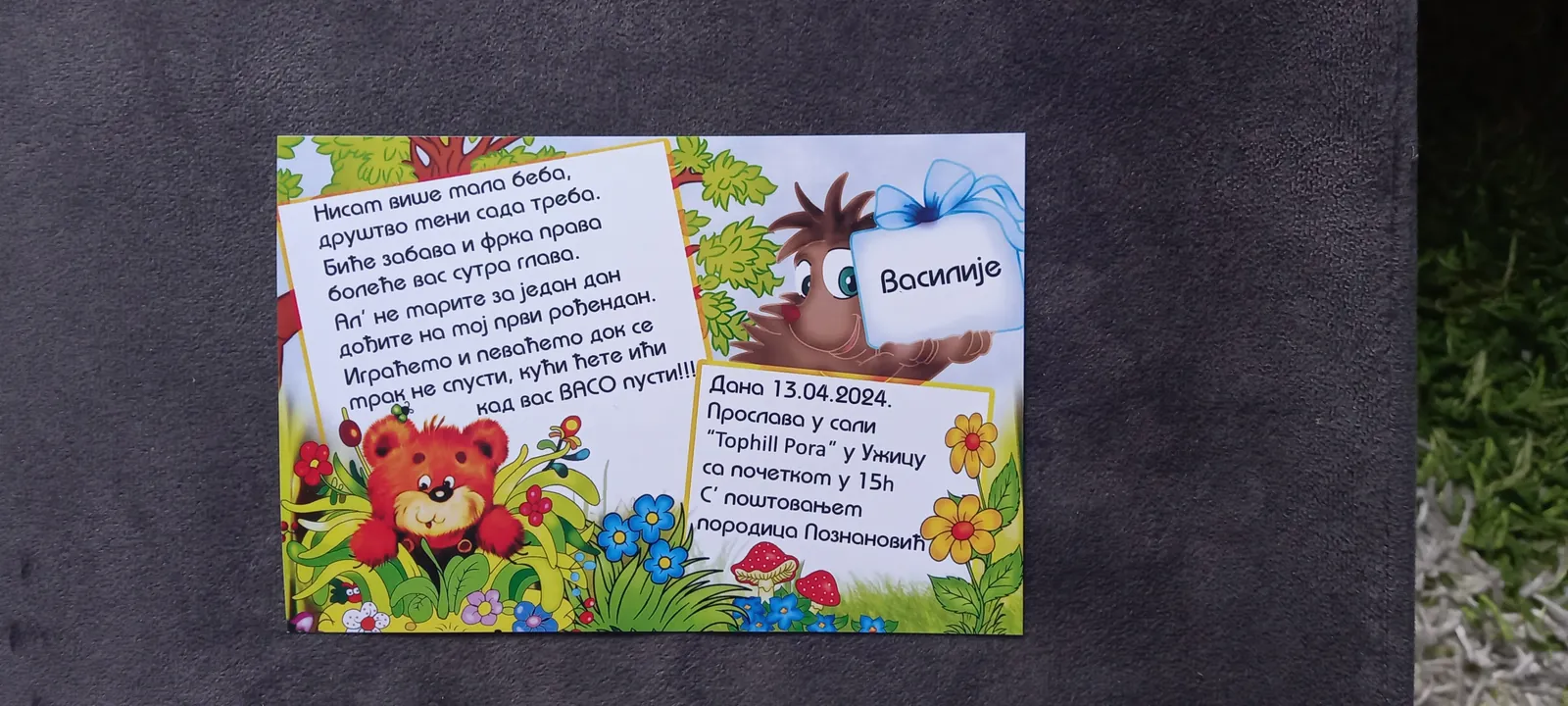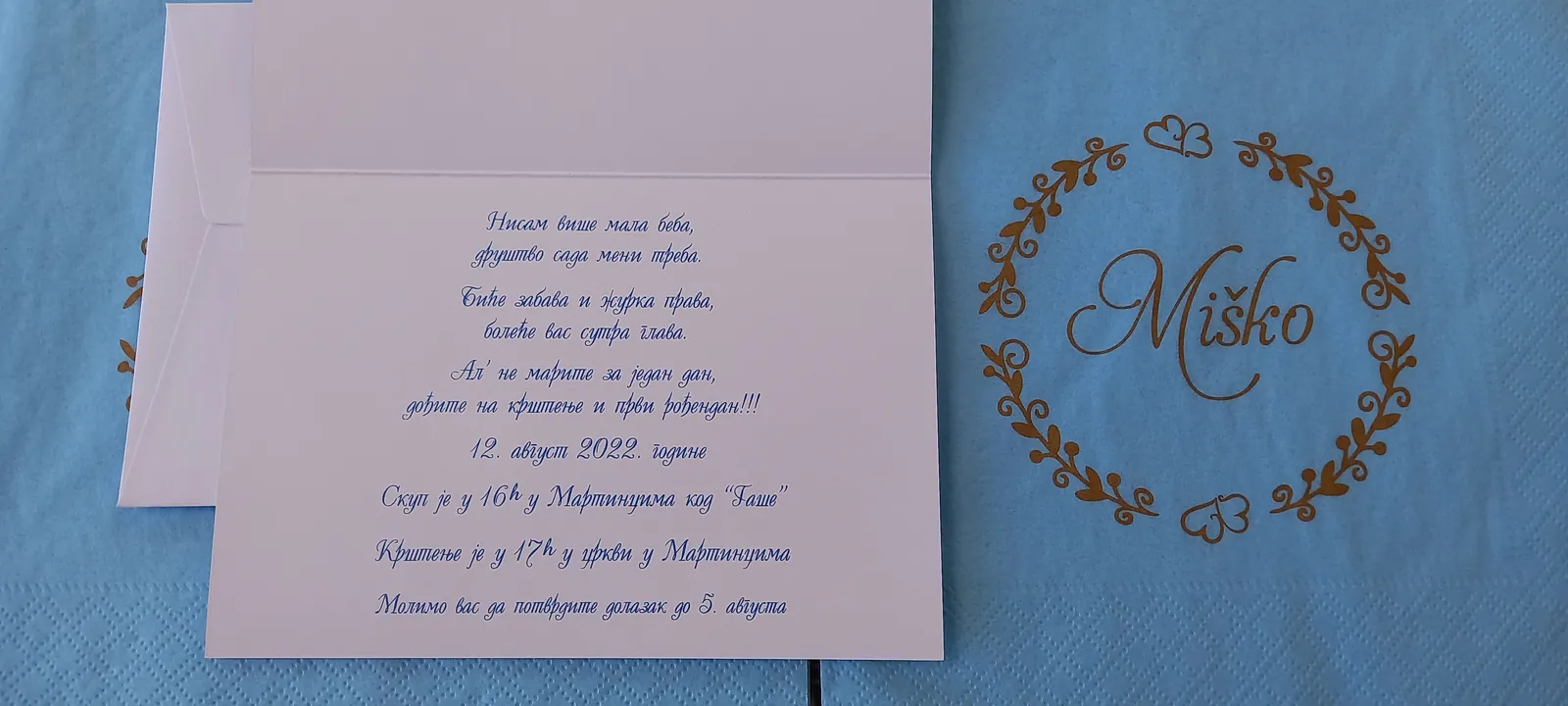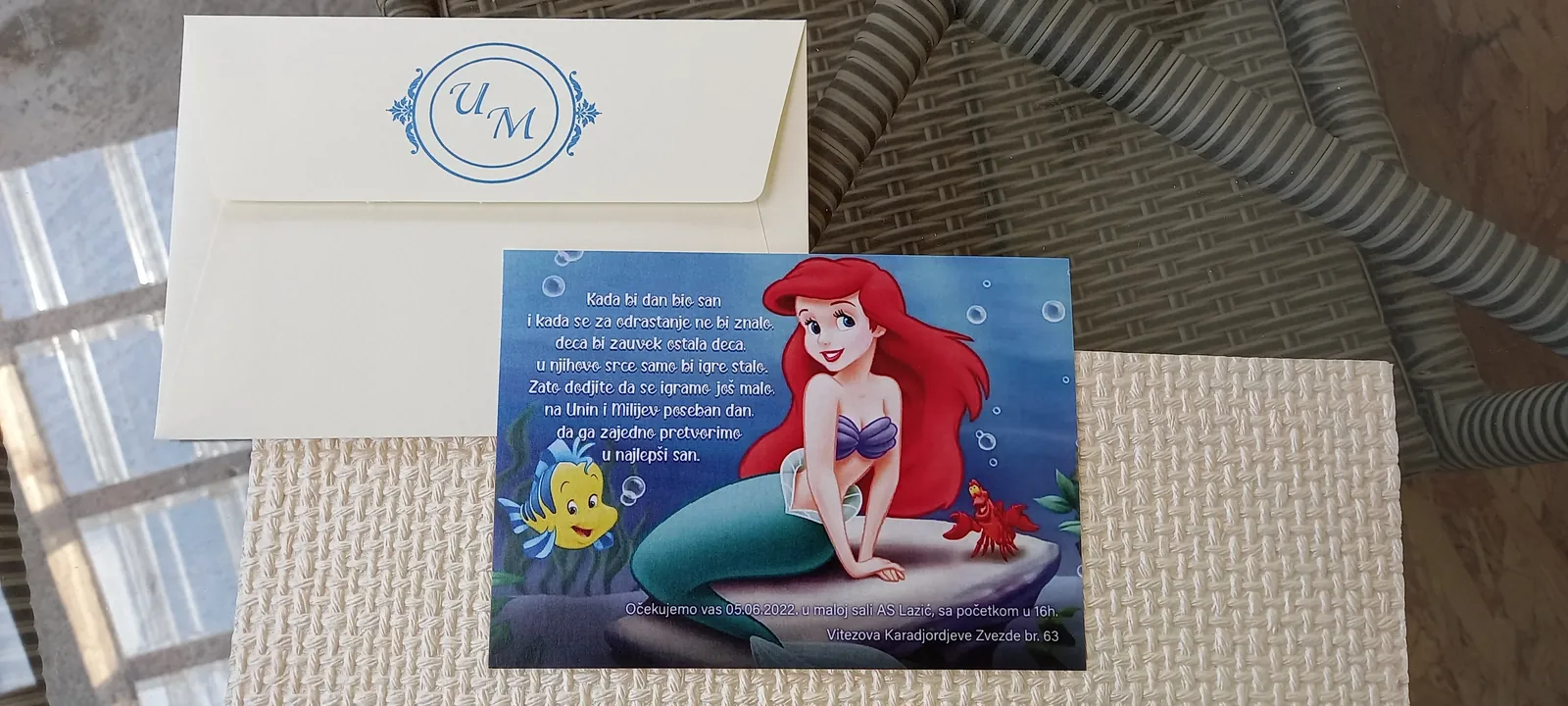 Povoljne pozivnice za proslavu prvog rođendana ili krštenja devojčica i dečaka sa motivima Diznijevih junaka, Minnie Mouse, Mickey Mouse, Winnie Pooh, Stič, Pepa Prase, Mala sirena, Šilja, princeza Sofija, Cars, kamiončići, Patrolne šape, Spiderman, životinjice iz prašume, bubamare...sve što vaše dete voli, može biti na pozivnici. Sve ove pozivnice mogu biti u štampanoj formi ili u ELEKTRONSKOJ FORMI sa vašim tekstom za pozivanje gostiju preko Vibera ili WhatsApp-a. Sve pozivnice mogu biti urađene na jednoj strani ili da se otvaraju, takođe na svakoj se može dodati fotografija vašeg deteta. Možete naručiti pozivnice sa kovertom u beloj ili nekoj boji po želji, ili bez koverte.