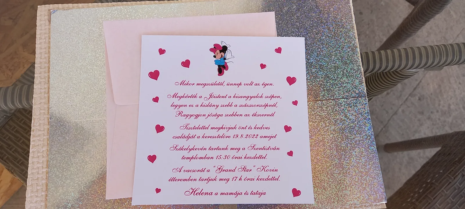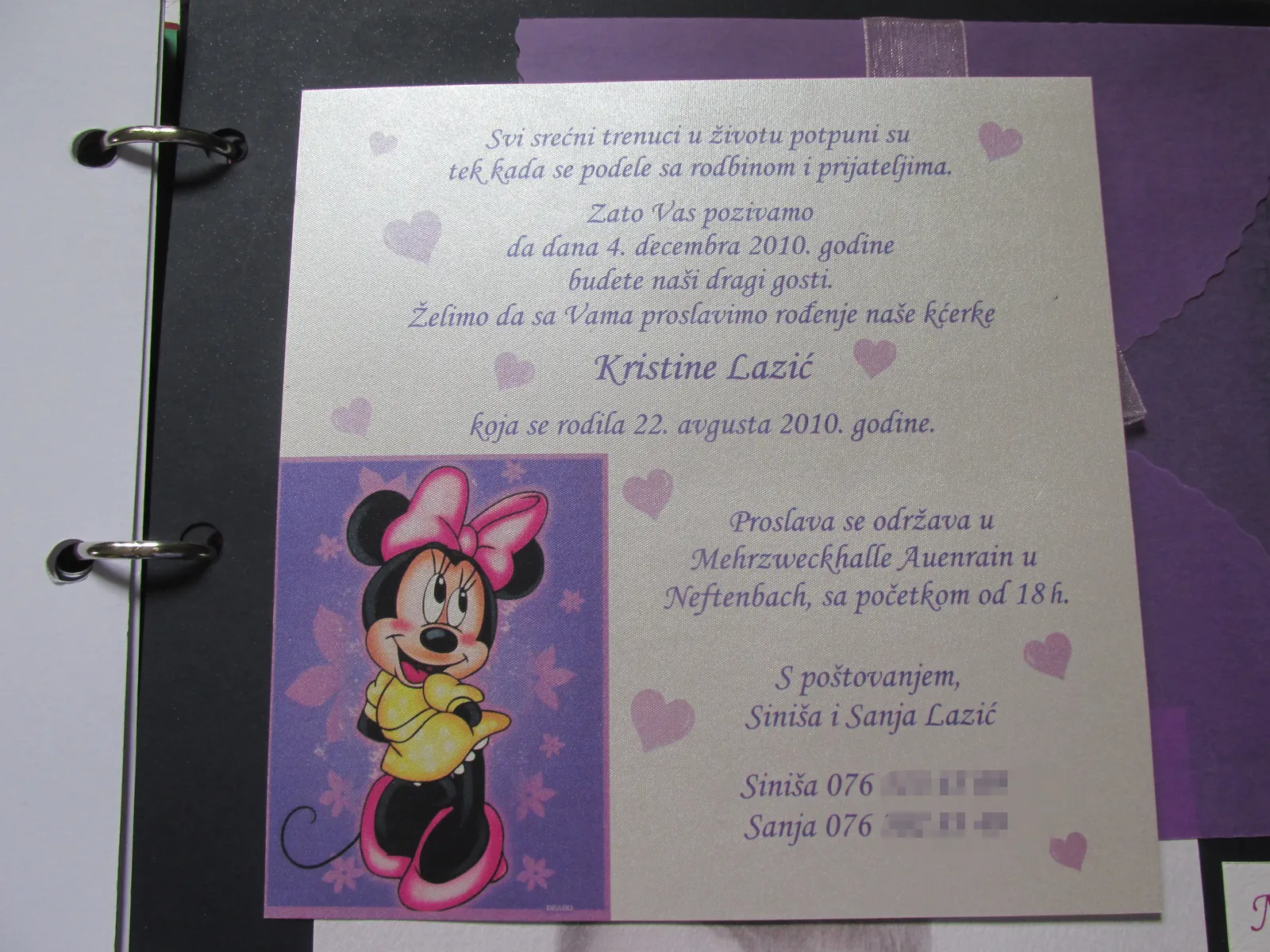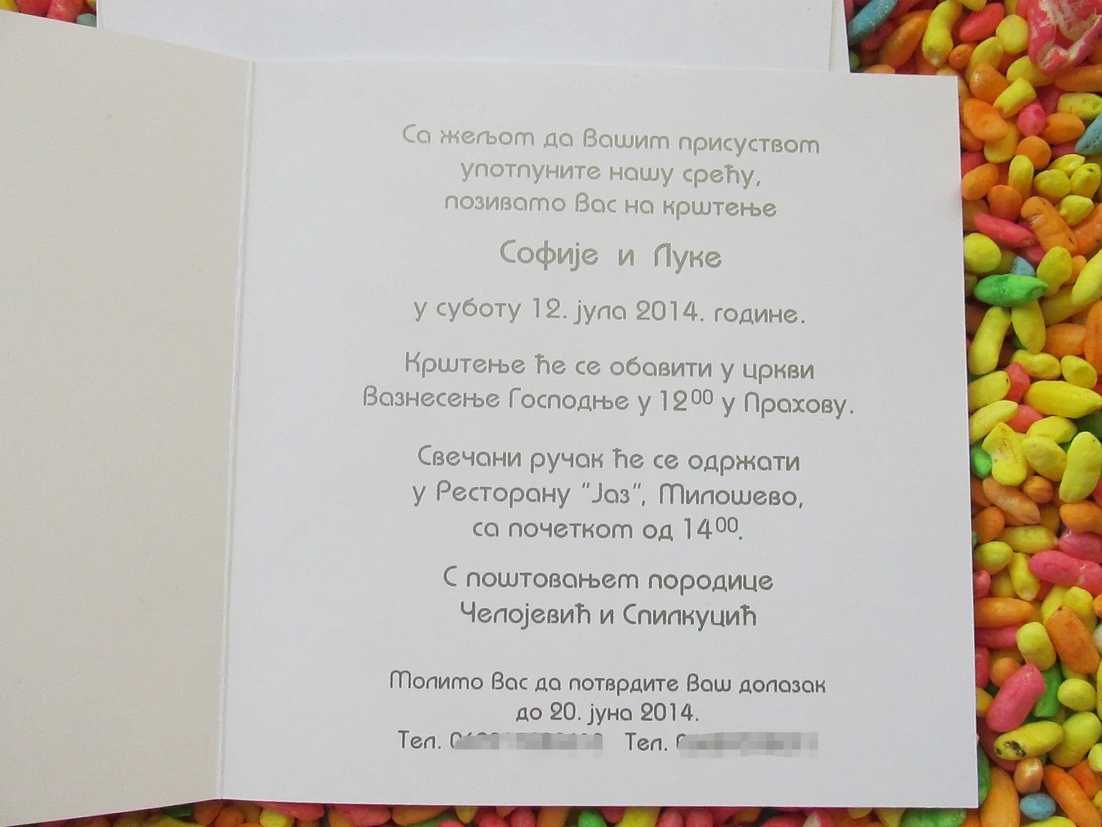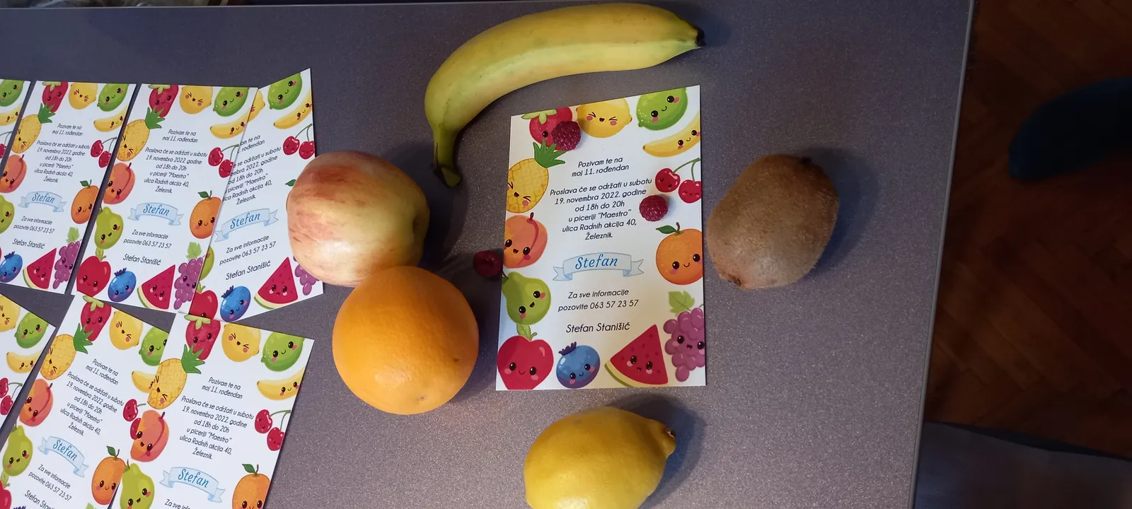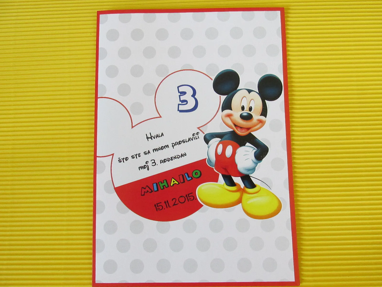 Povoljne pozivnice za proslavu prvog rođendana ili krštenja devojčica i dečaka sa motivima Diznijevih junaka, Minnie Mouse, Mickey Mouse, Winnie Pooh, Stič, Pepa Prase, Mala sirena, Šilja, princeza Sofija, Cars, kamiončići, Patrolne šape, Spiderman, životinjice iz prašume, bubamare...sve što vaše dete voli, može biti na pozivnici. Sve ove pozivnice mogu biti u štampanoj formi ili u ELEKTRONSKOJ FORMI sa vašim tekstom za pozivanje gostiju preko Vibera ili WhatsApp-a. Sve pozivnice mogu biti urađene na jednoj strani ili da se otvaraju, takođe na svakoj se može dodati fotografija vašeg deteta. Možete naručiti pozivnice sa kovertom u beloj ili nekoj boji po želji, ili bez koverte.