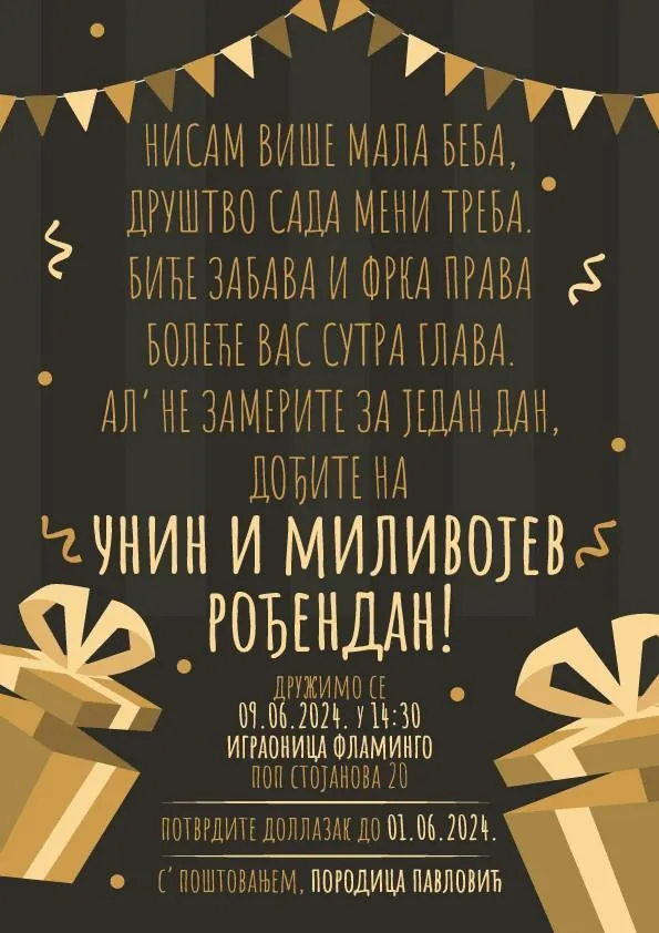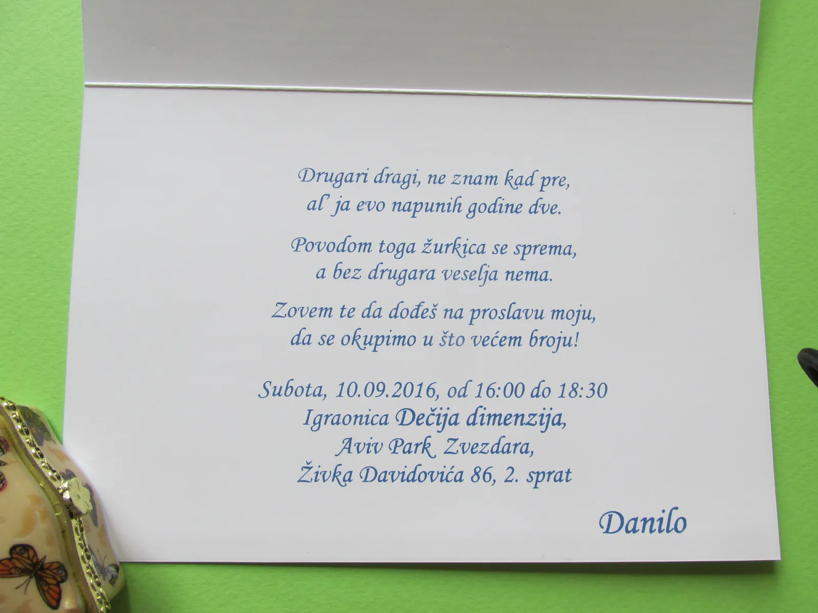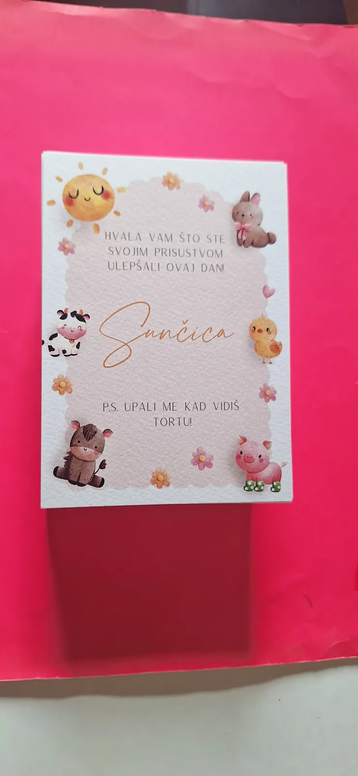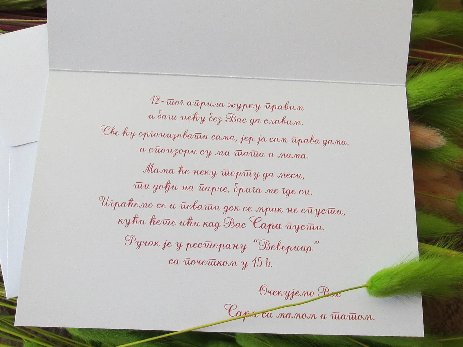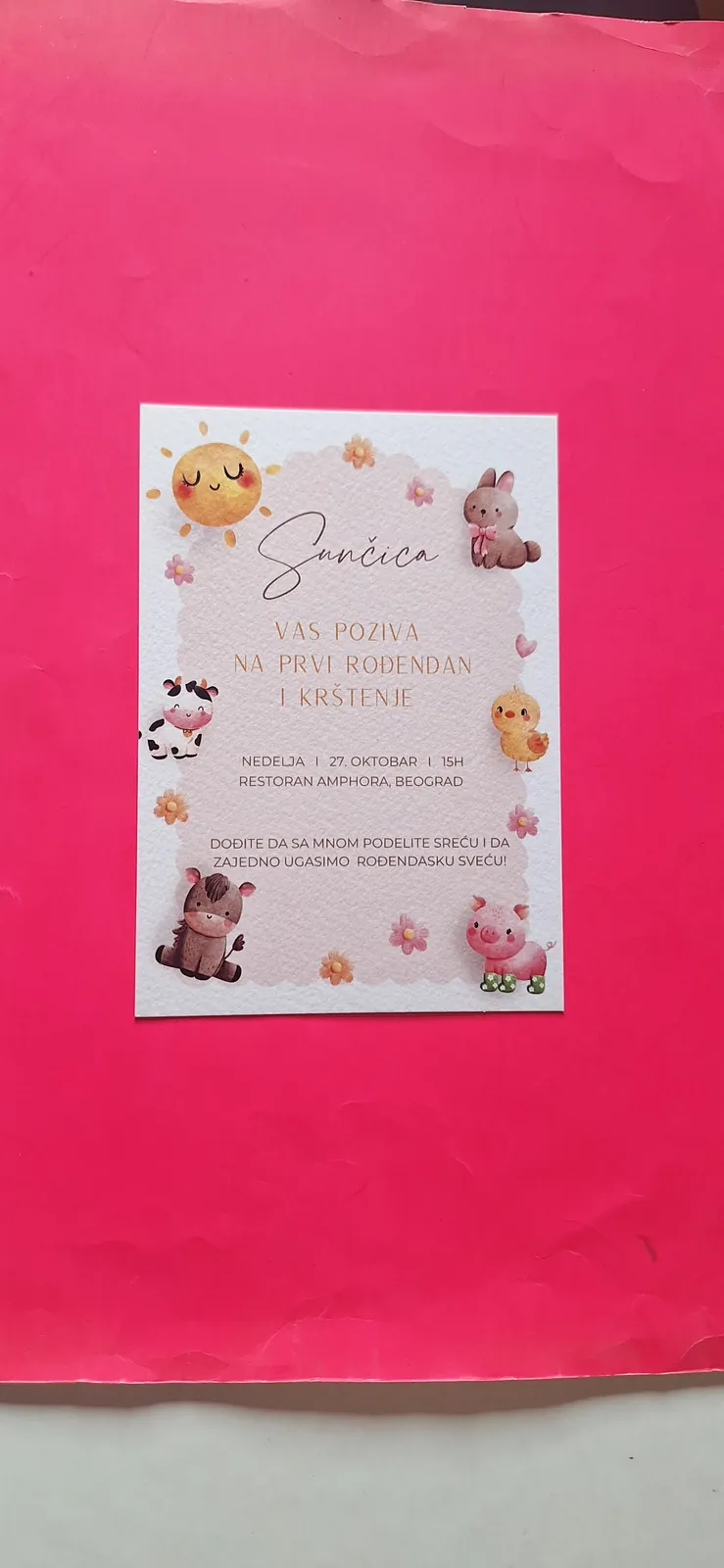 Povoljne pozivnice za proslavu prvog rođendana ili krštenja devojčica i dečaka sa motivima Diznijevih junaka, Minnie Mouse, Mickey Mouse, Winnie Pooh, Stič, Pepa Prase, Mala sirena, Šilja, princeza Sofija, Cars, kamiončići, Patrolne šape, Spiderman, životinjice iz prašume, bubamare...sve što vaše dete voli, može biti na pozivnici. Sve ove pozivnice mogu biti u štampanoj formi ili u ELEKTRONSKOJ FORMI sa vašim tekstom za pozivanje gostiju preko Vibera ili WhatsApp-a. Sve pozivnice mogu biti urađene na jednoj strani ili da se otvaraju, takođe na svakoj se može dodati fotografija vašeg deteta. Možete naručiti pozivnice sa kovertom u beloj ili nekoj boji po želji, ili bez koverte.