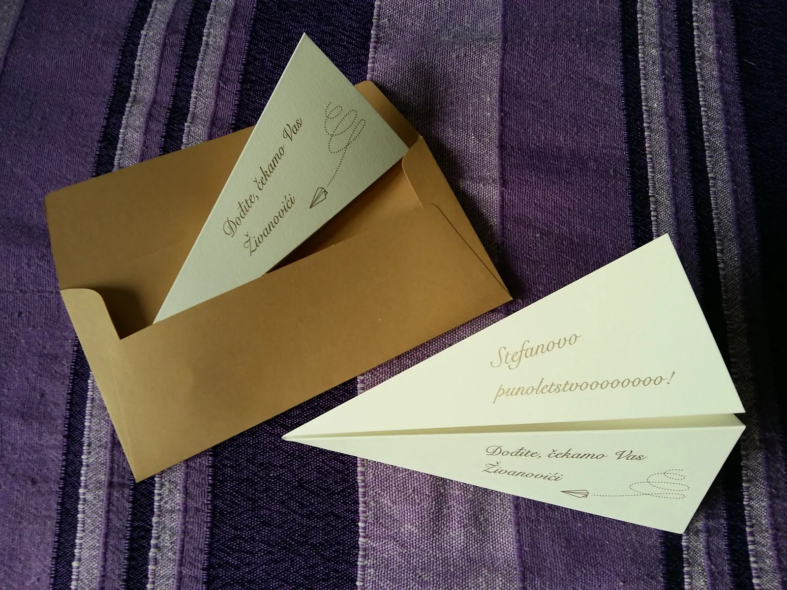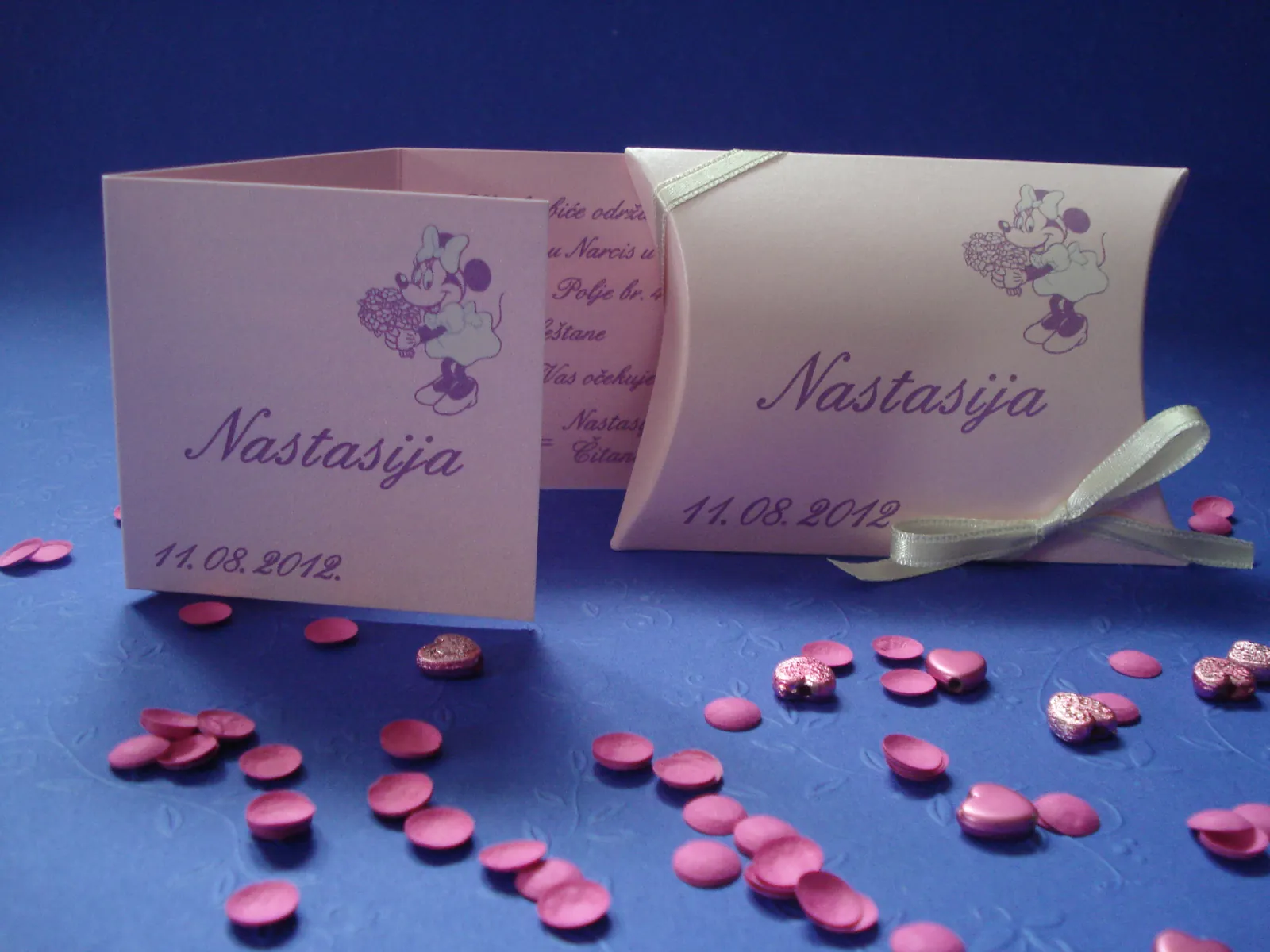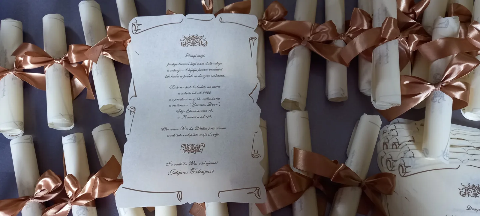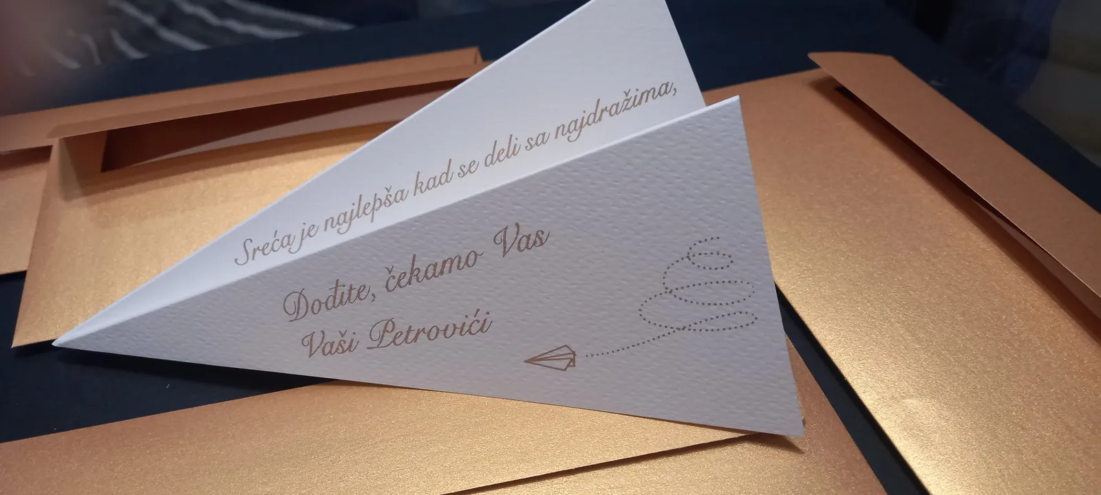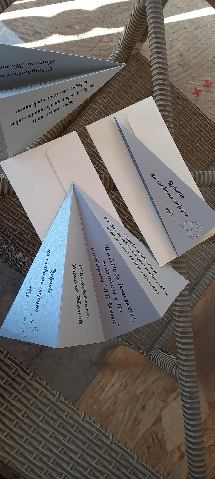 Neobične-originalne pozivnice: pergamenti u rolni, male trodelne pozivnice koje se stavljaju u kutije model Srce, Lora, Jastučić- veoma tražene već godinama; originalna pozivnica Aviončić sa kovertom.