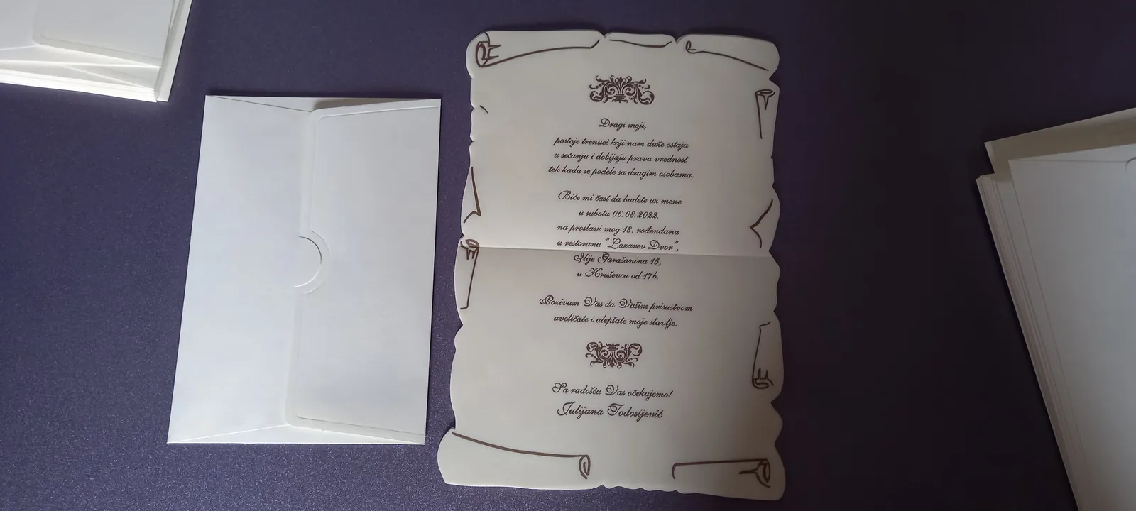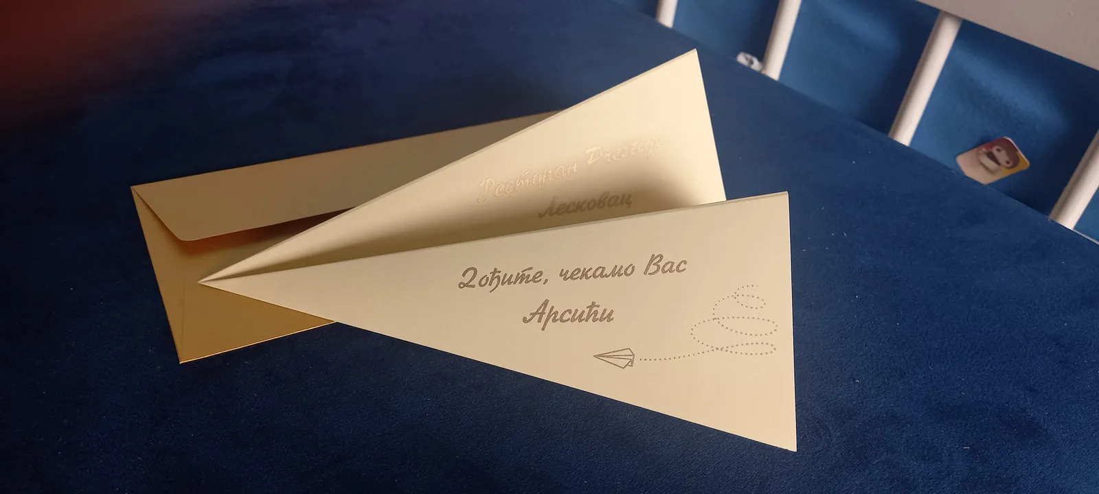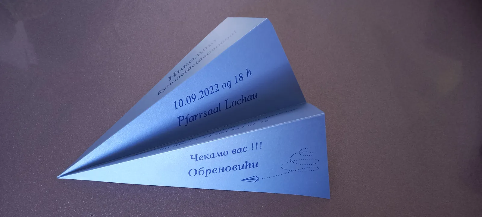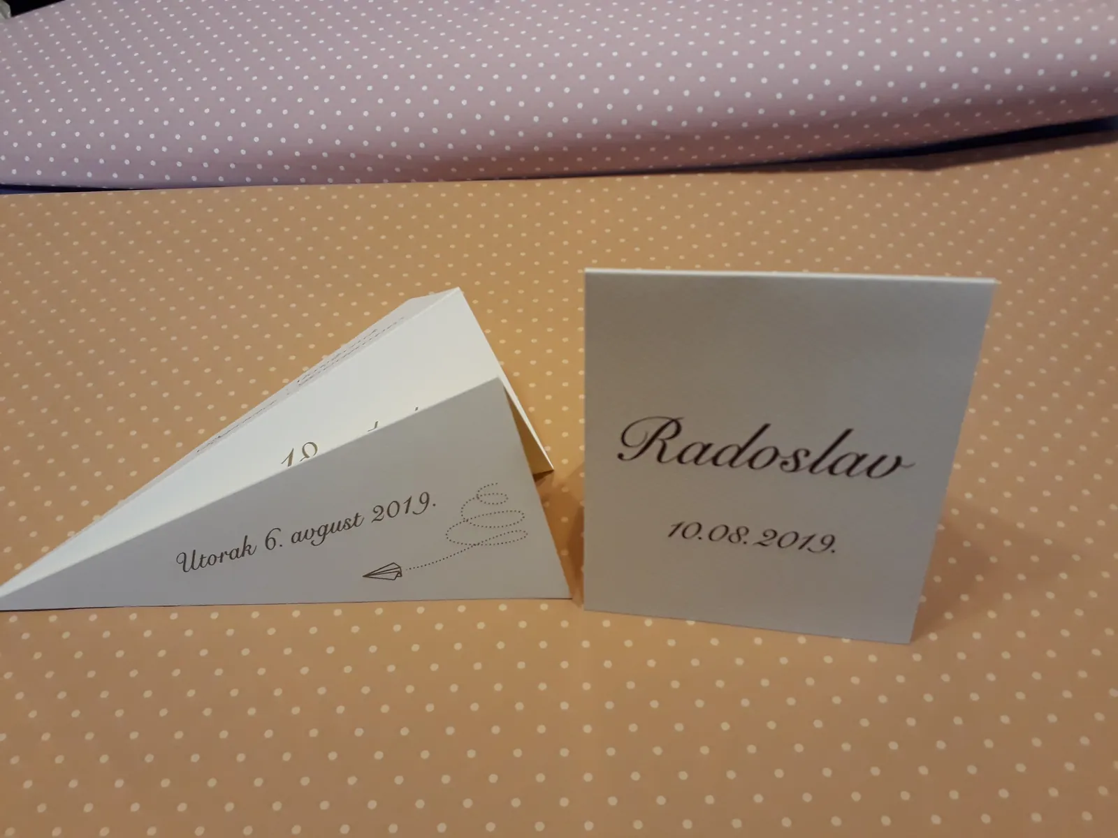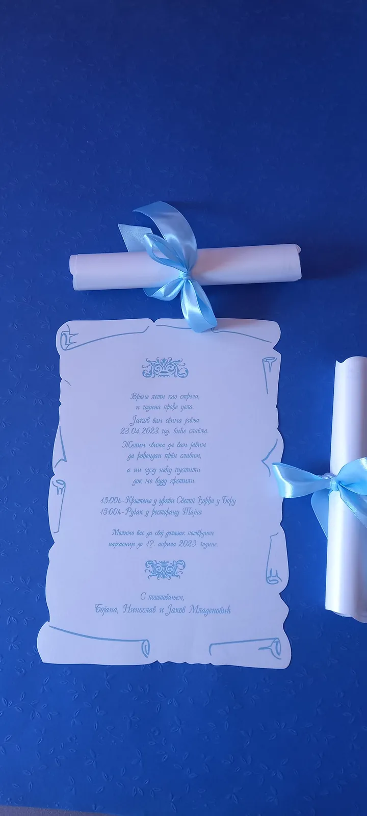 Neobične-originalne pozivnice: pergamenti u rolni, male trodelne pozivnice koje se stavljaju u kutije model Srce, Lora, Jastučić- veoma tražene već godinama; originalna pozivnica Aviončić sa kovertom.