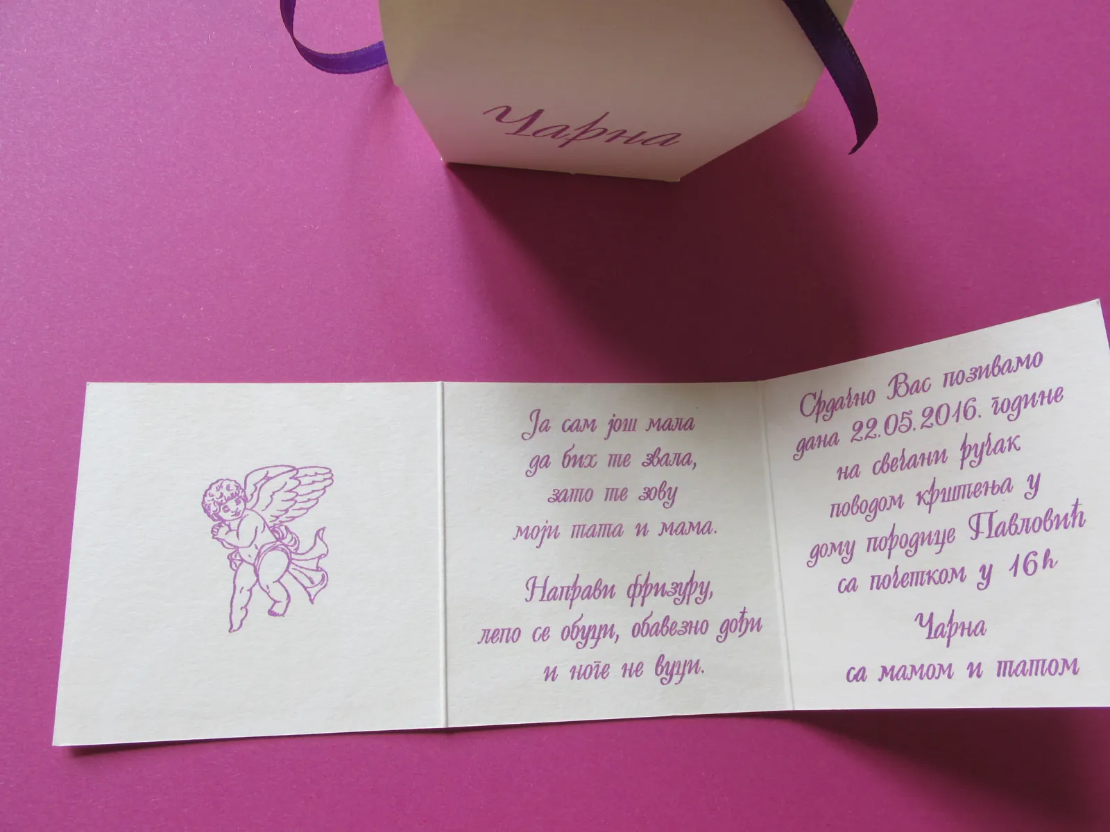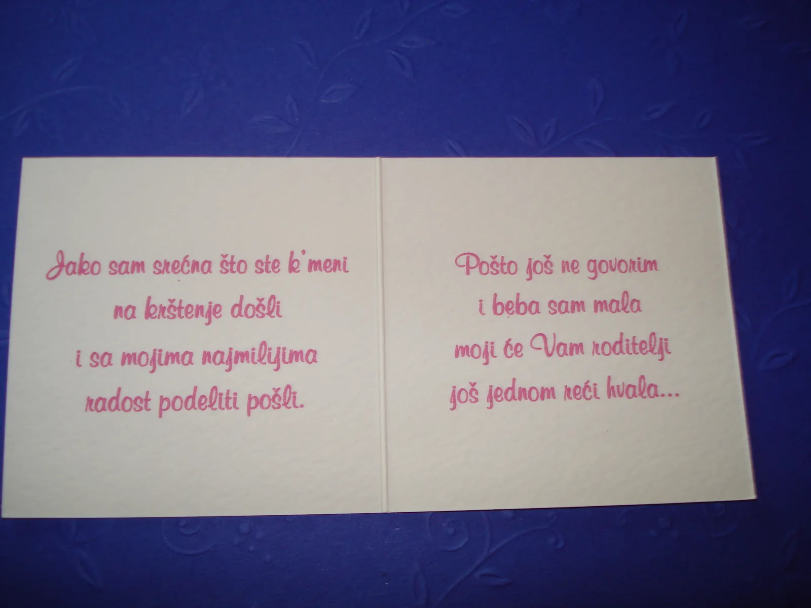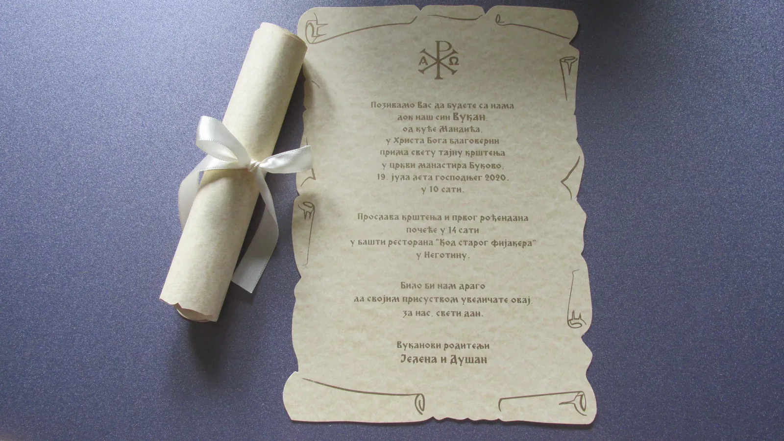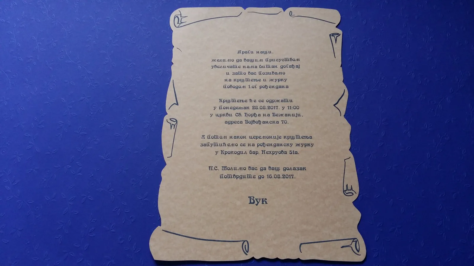 Otmene, elegante pozivnice: moderne pozivnice sa tufnama, štampa cvetnih i drugih motiva na reljefnim papirima, pergamenti, pozivnice u rolni, pozivnice za venčanje i krštenje, pozivnice sa fotografijama, pozivnice sa pausom.